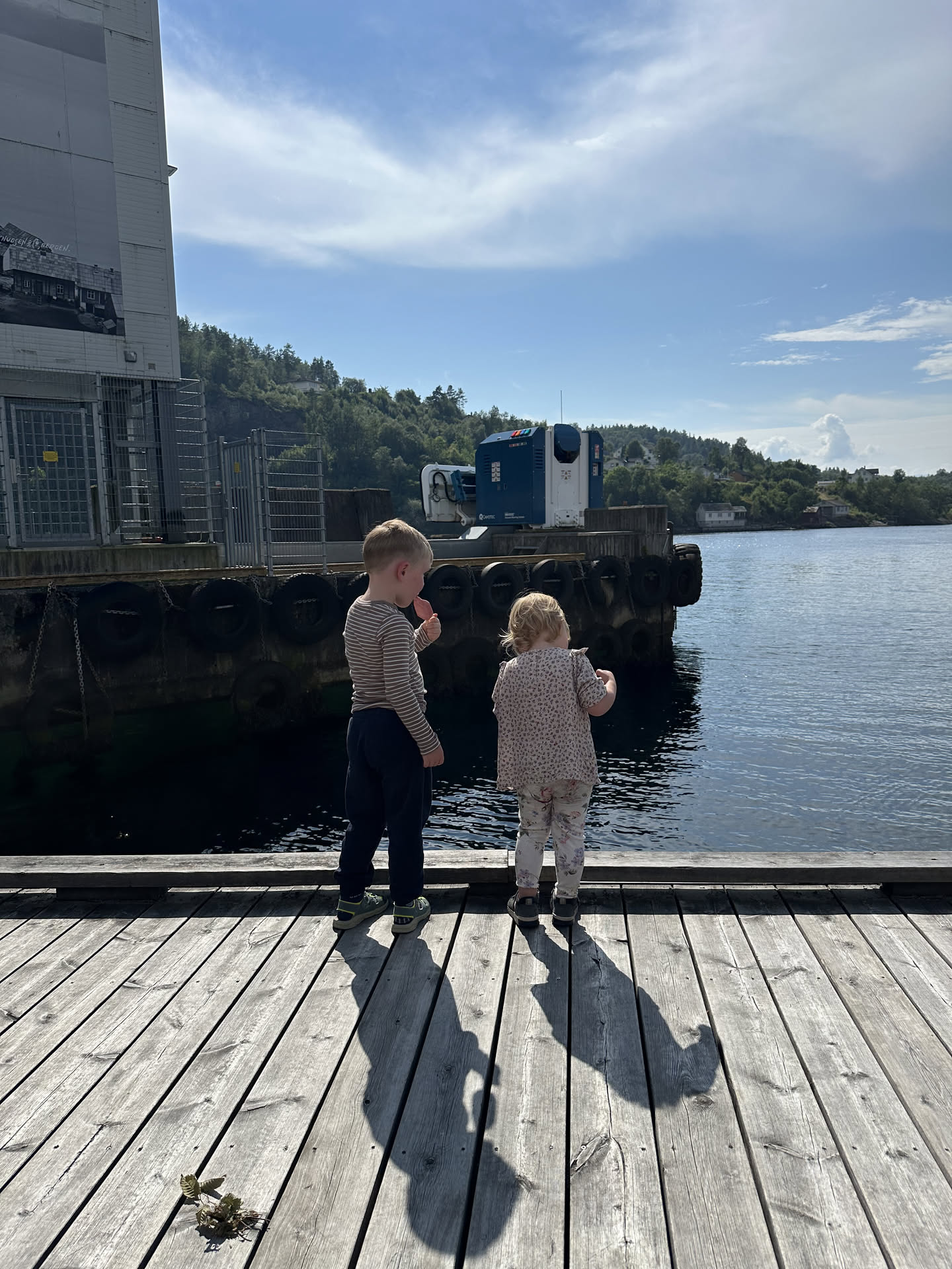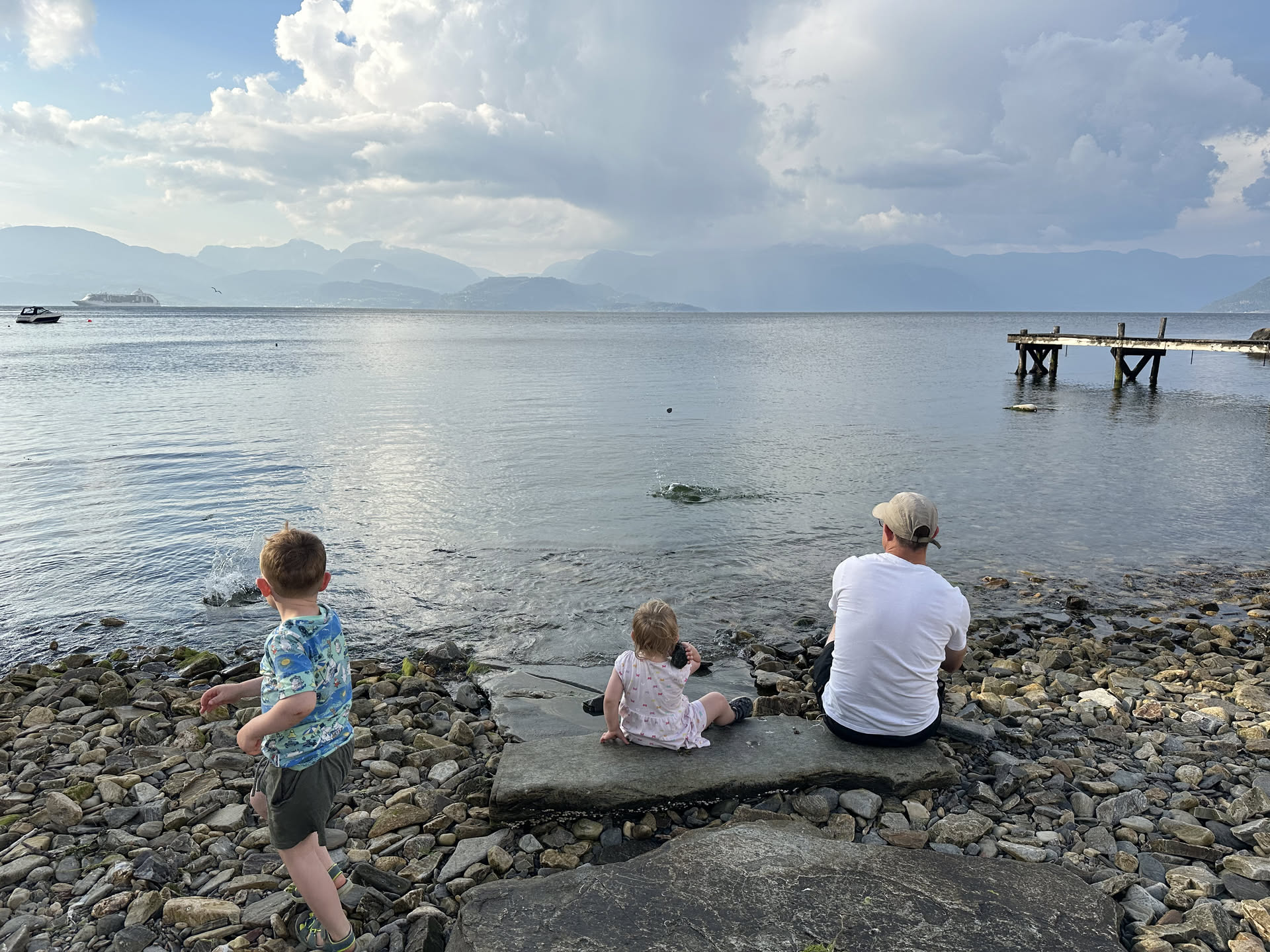 Det var en varm aften i Jondal, så vi måtte lige ned til fjorden efter aftensmaden og kaste sten i vandet.
