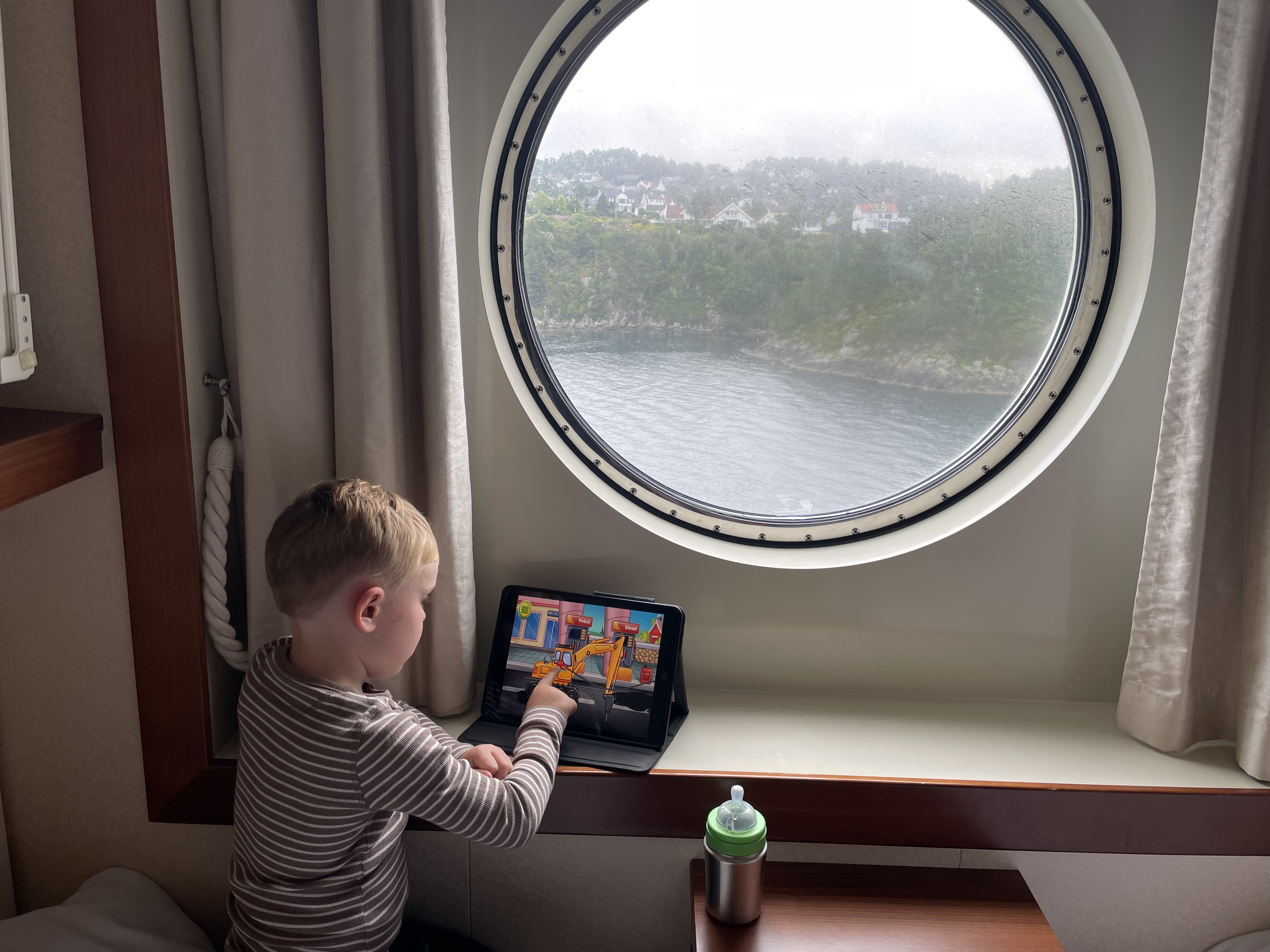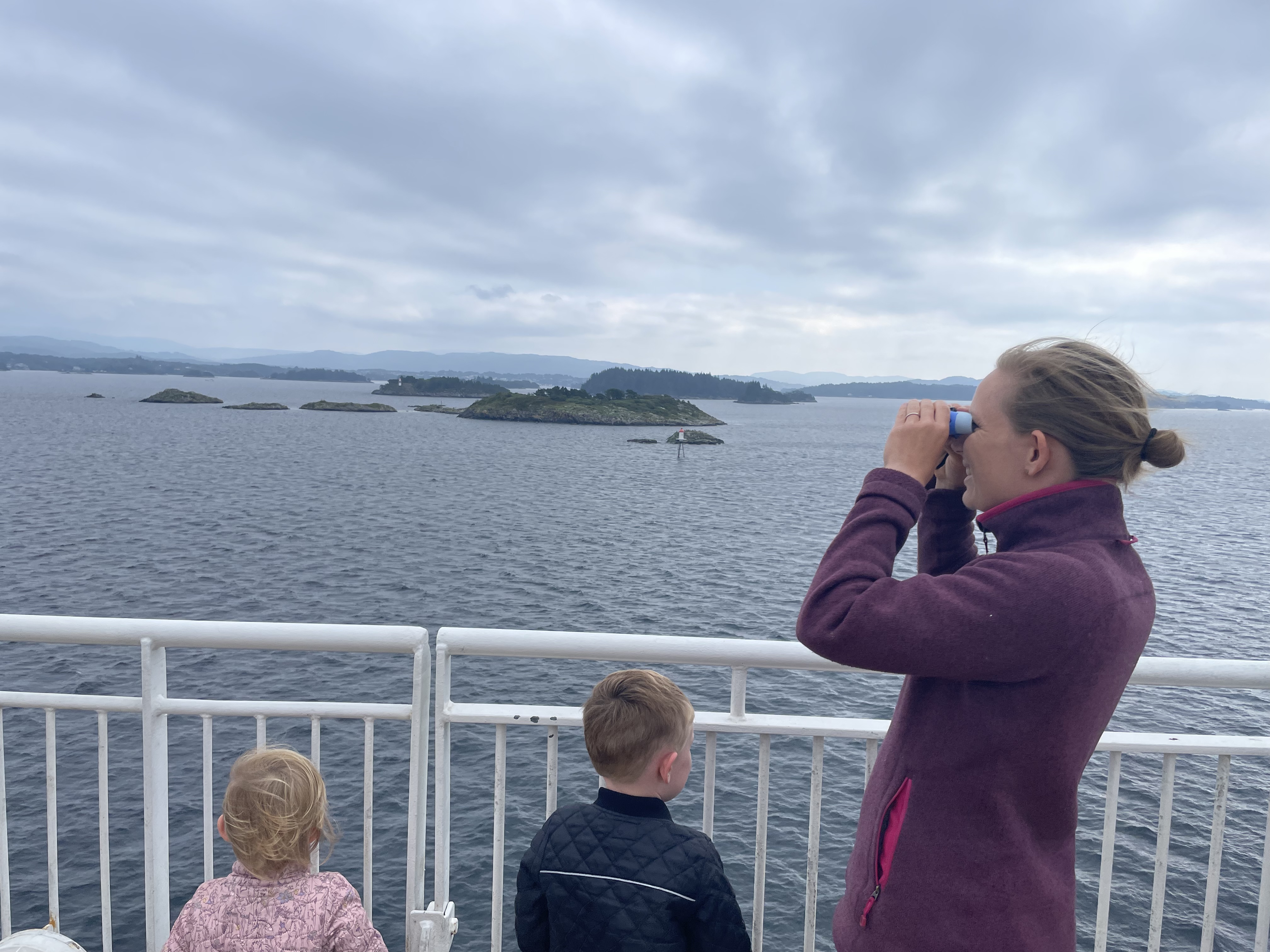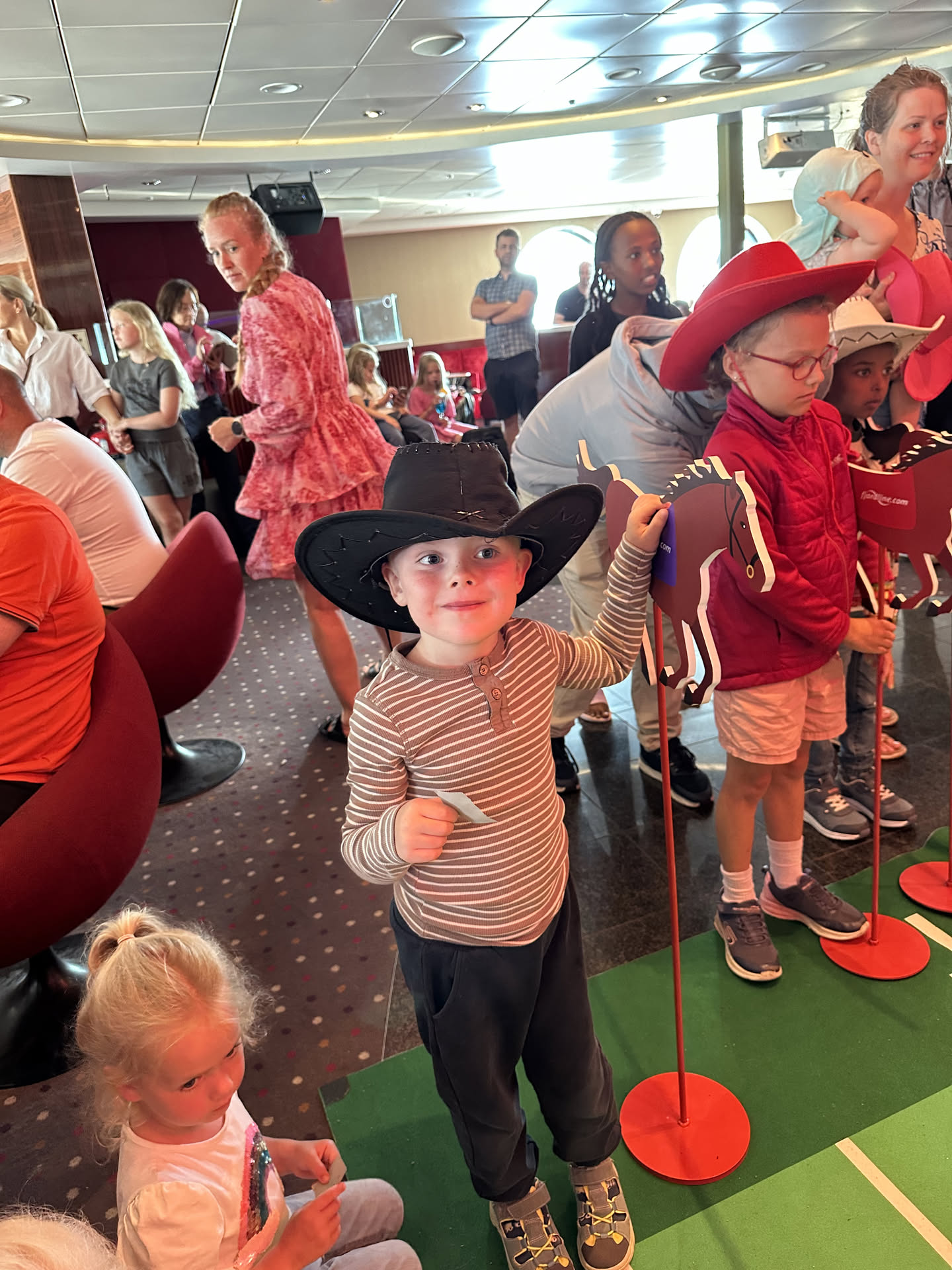 Næste morgen vågnede Aksel tidligt. Måske det var meddelelses over højtaleren, som annoncerede om ankomsten til Stavanger der vækkede ham. Aksel og Mads gik ud og fandt et sted vi kunne sidde på færgen, mens pigerne vågnede og gjorde sig klar. Vi havde nemlig fået at vide, at det ville være en god idé at sikre sig en plads, da der senere ville blive trængsel om pladsen, da alle skulle være ude af kahytterne inden kl. 10. Vi fik en fin plads med udsigt, hvor vi fik tiden til at gå med spil, tegneopgaver og dukkeleg. Og nå ja, så skulle vi da også se hestevæddeløb. Aksel ville absolut ikke være med, men bare se på. Det gjorde vi da også i første runde, og da anden runde skulle til at gå igang, tog vi mod til også og fik 2 lodder - em til hver af børnene. Da den sidste plads til sidste runde af hestevæddeløbet skulle finde, blev Astrid nummer råbt op! Det var lidt sej, men Astrid turde dog ikke, men det gjorde Aksel. Han fik cowboyhatten på, og tog den sidste ledige hest (lilla). Med terningekast skulle vinderen findes, og Aksel kom på en 3. plads, og vandt en slikpose. Den delte børnene, for det var jo trods alt Astrids lodseddel der havde vundet Aksel en 3. plads.