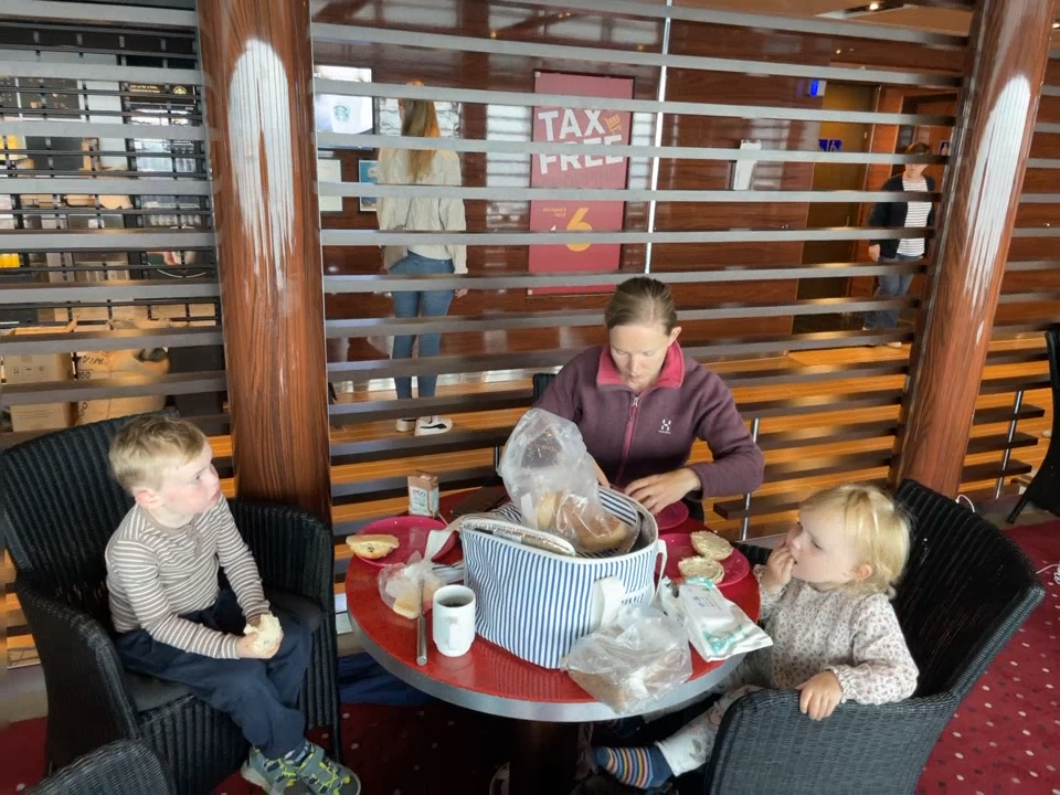 Vi spise tidlig aftensmad onsdag sammen med mormor og morfar, hvorefter vi kørte til Hirtshals. Man skal komme i ret god tid - senest en time før og gerne to. Vi var der måske 1,5 time før, men blev mødt af massiv kø, og vi kom først op på til vores kahyt lidt i otte, med to meget trætte børn. Især Astrid var meget træt, og var næsten faldet i søvn i bilen. Det var dog svært at falde i søvn, måske pga. de mange meddelselser der blev ved med at komme over højtaler, og måske fordi det var et nyt og spændende sted. Det lykkedes dog, og da børnene sov gik vi med babyalamen tændt en lille tur rundt på færgen.