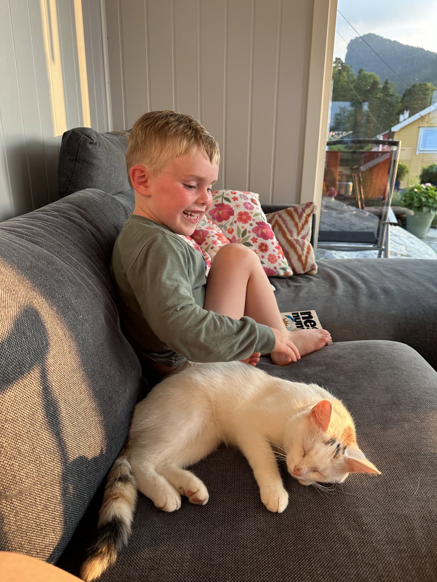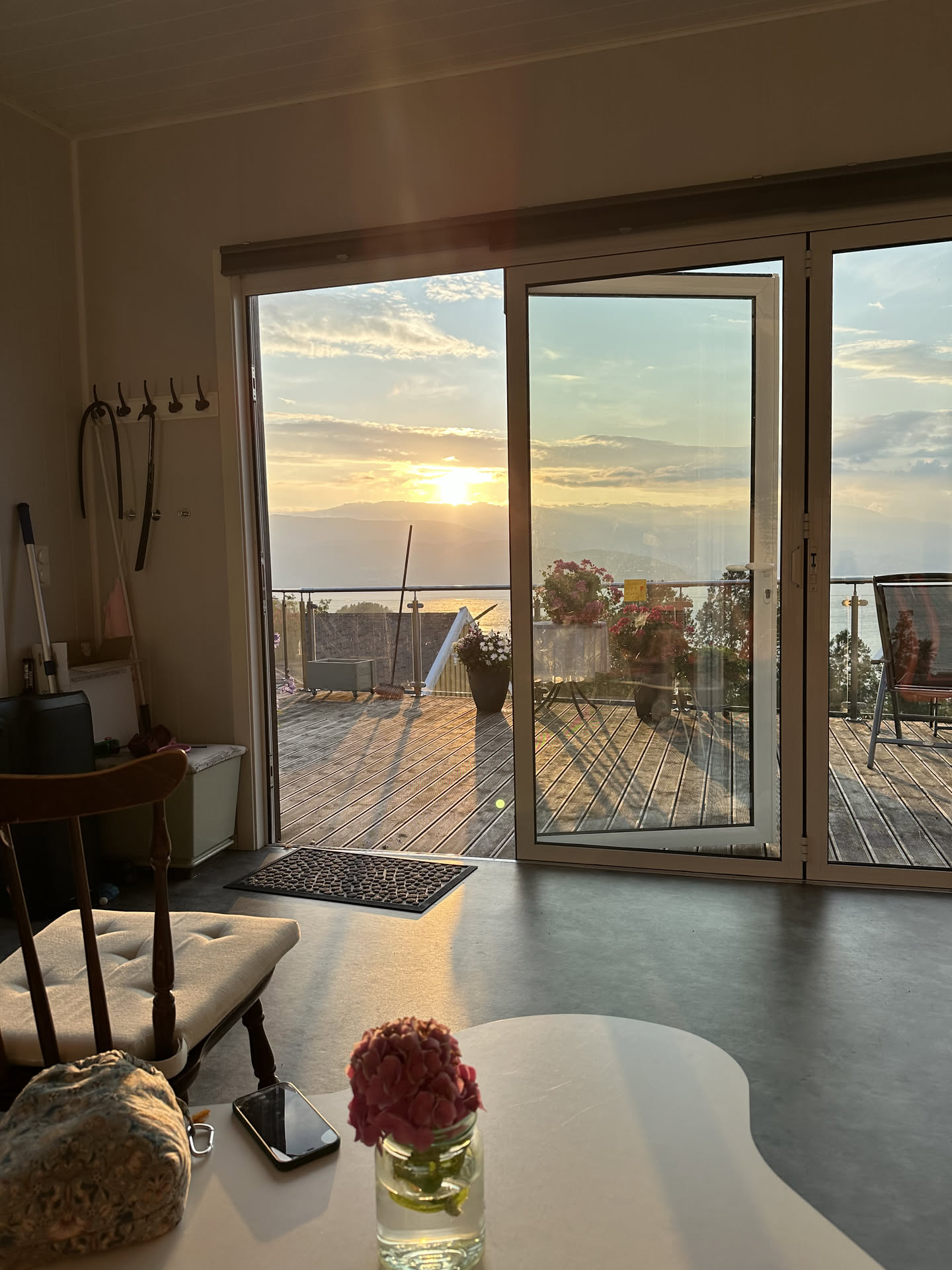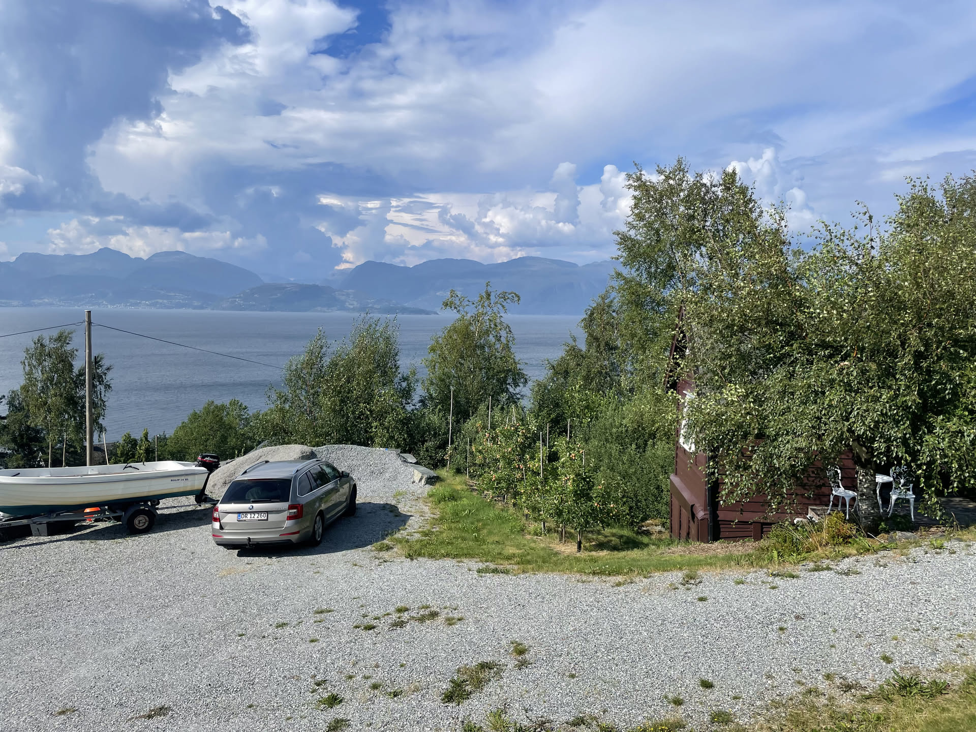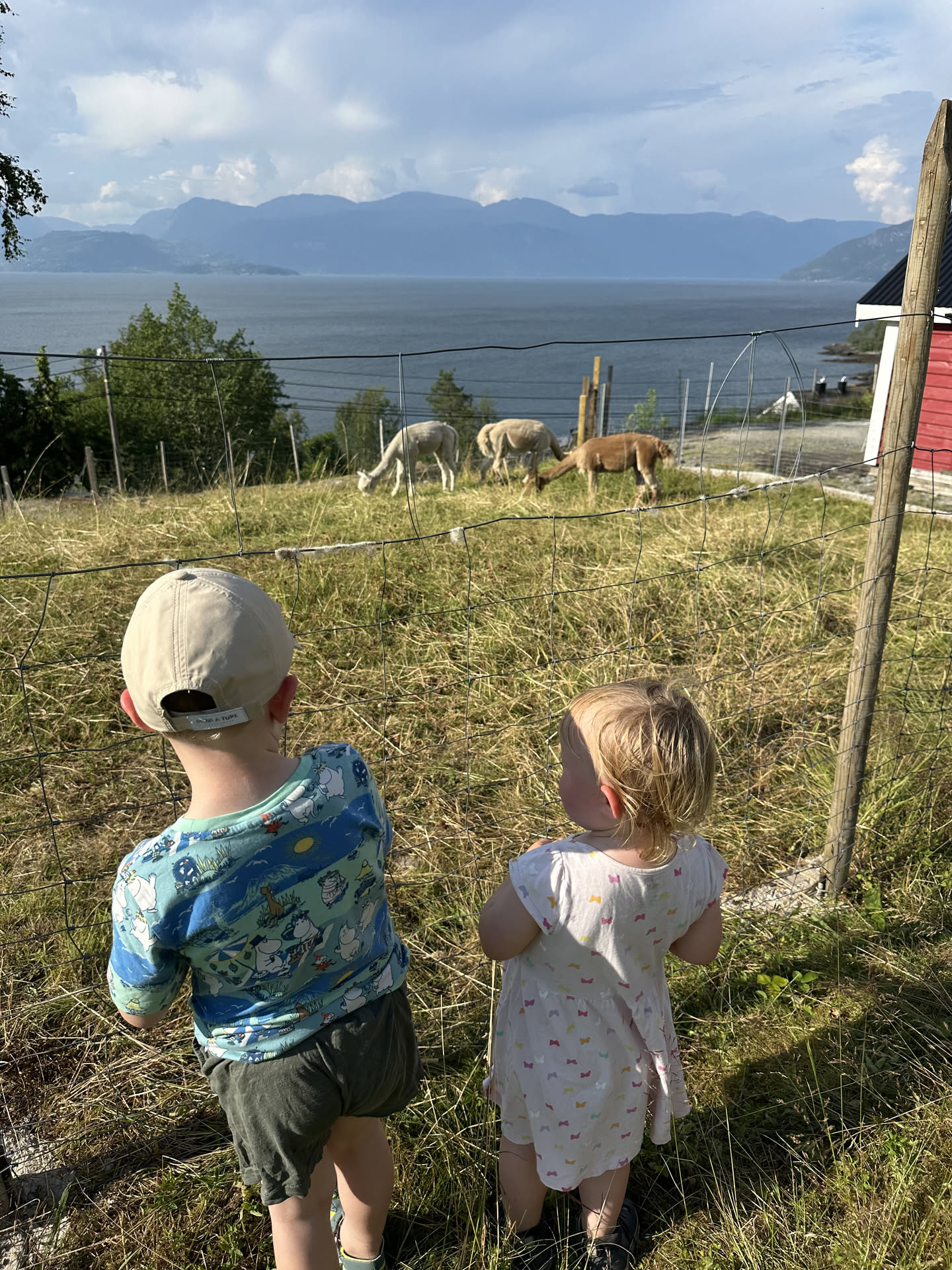 Lidt nord for Jondal har vi fundet et lille paradis gennem Airbnb. Det er en familiegård med mor og far (Irene og Johnny), en pige på 7 år, en dreng på 8 år og deres farmor og farfar. Her er massevis af frugttræer, hindbær, blåbær, brombær, moreller, tomater, agurker og meget mere, men der er også alpakkaer, en kat, en svævebane og en hel fantastik udsigt ud over fjorden. Det vildeste er dog stilheden. Her skal vi være de næste 4 nætter, og nyde den ene solnedgang over havet efter den anden.