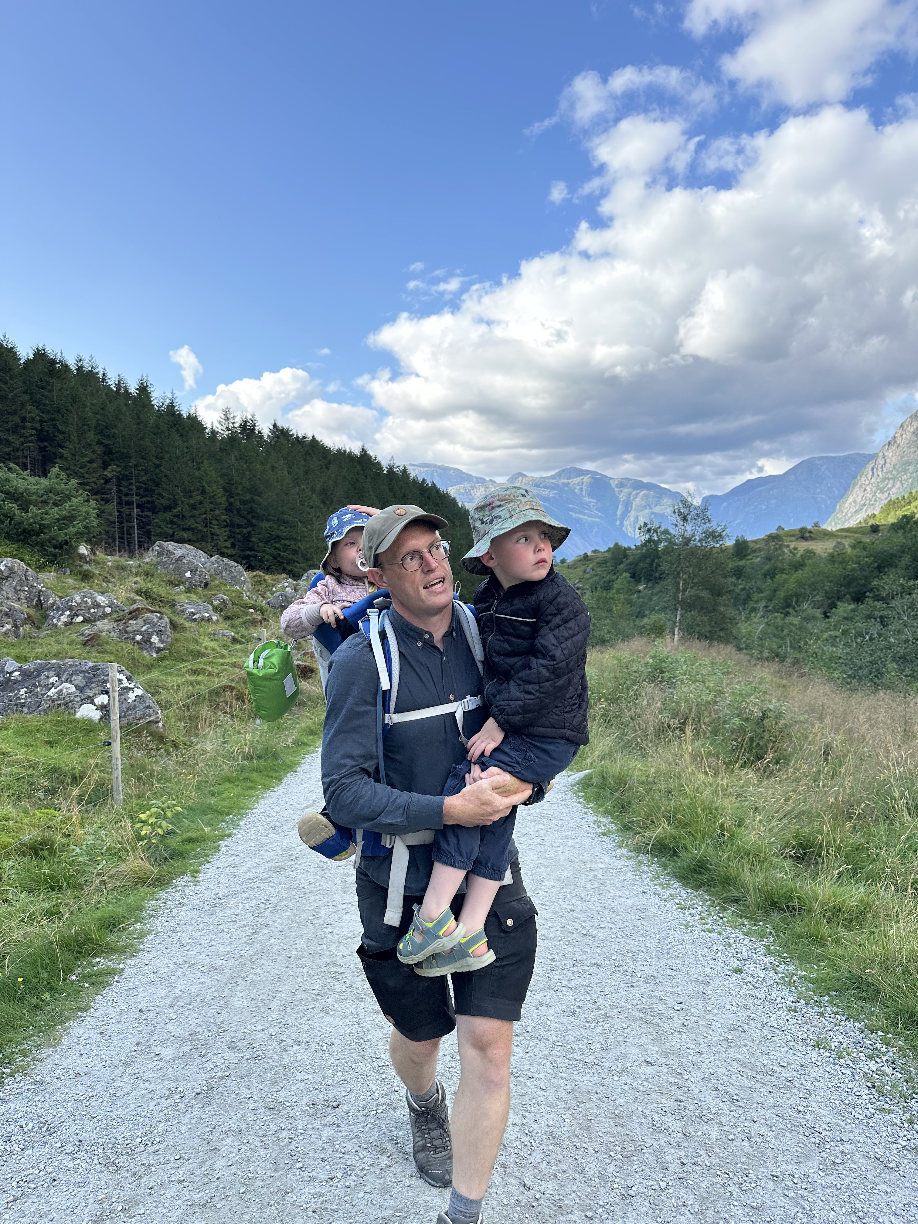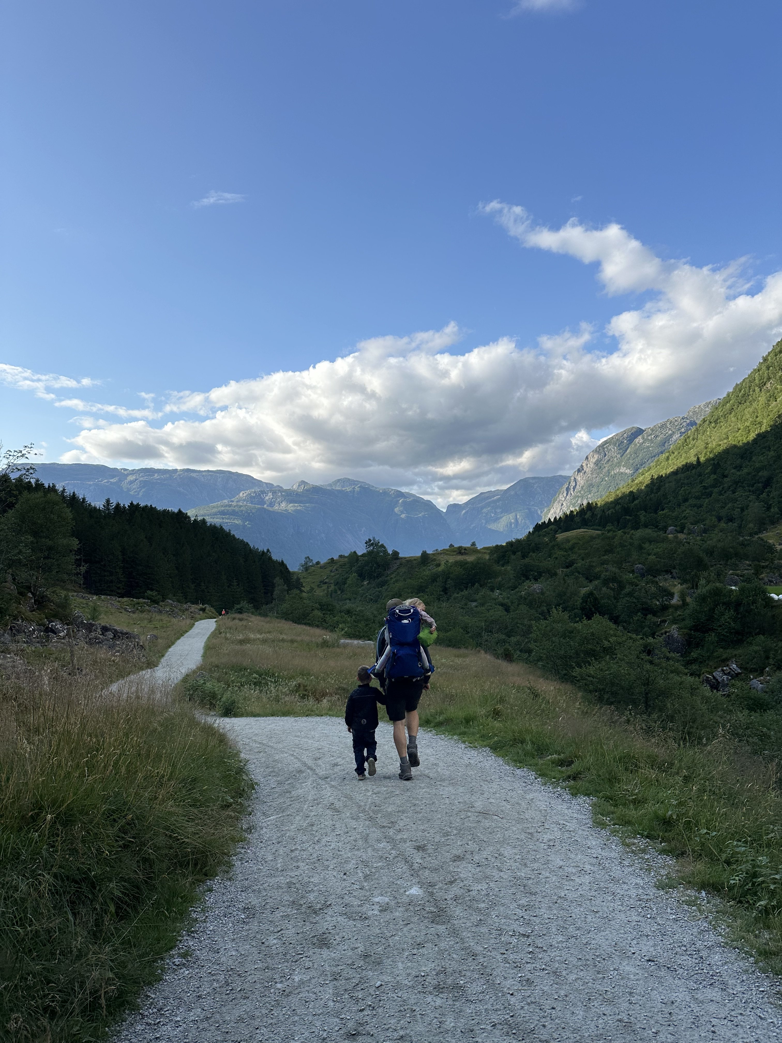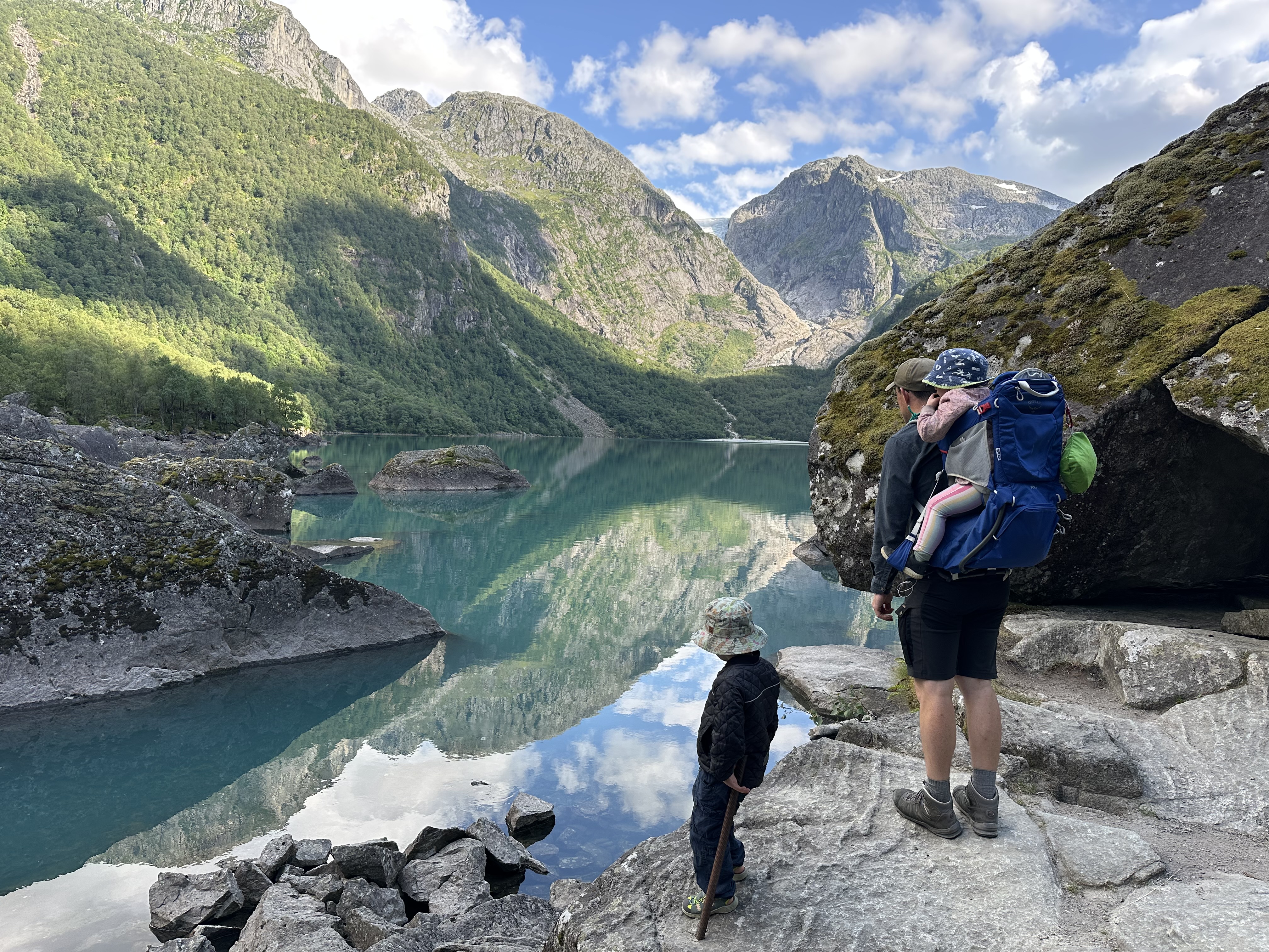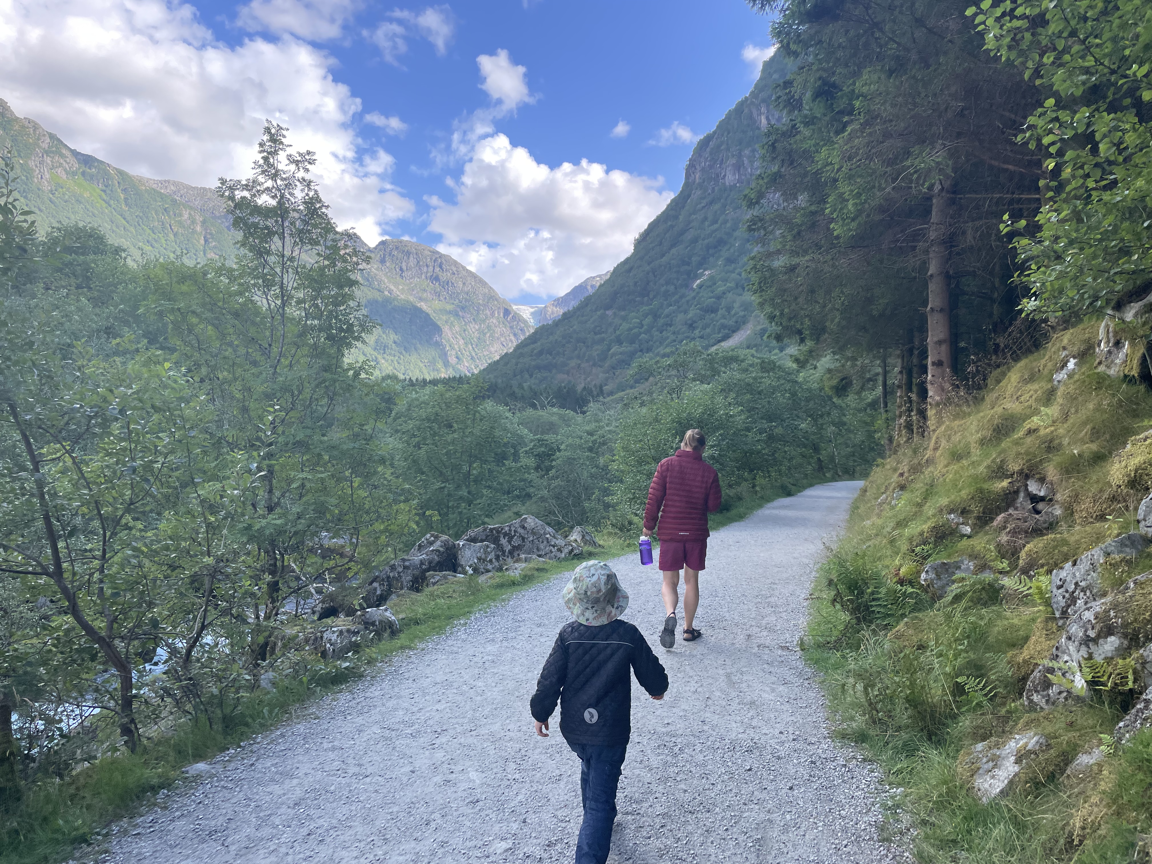 Da Astrid endelig vågnede var vi (nok mest os voksne) blevet lidt rastløse. Ida havde fundet en naturperle, som hedder Bondhusvatnet, der ligger på samme halvø som hytten, så vi kørte afsted på tur så snart vi kunne. Det var måske nok en lidt hovedløs beslutning, men stedet var helt enormt flot. Der var en gåtur derud på 4.6 km tur/retur fra parkeringspladsen, men vi kunne godt mærke at Aksel havde brændt en masse krudt af i jacuzzien, for han skulle både bæres noget af vejen og have doping i form af druesukkertabletter. Det skal måske nævnes at vi først var fremme ved parkeringspladsen klokken 17:15. Ups :-) Det gik nu okay og vi var glade for at vi kom af sted.