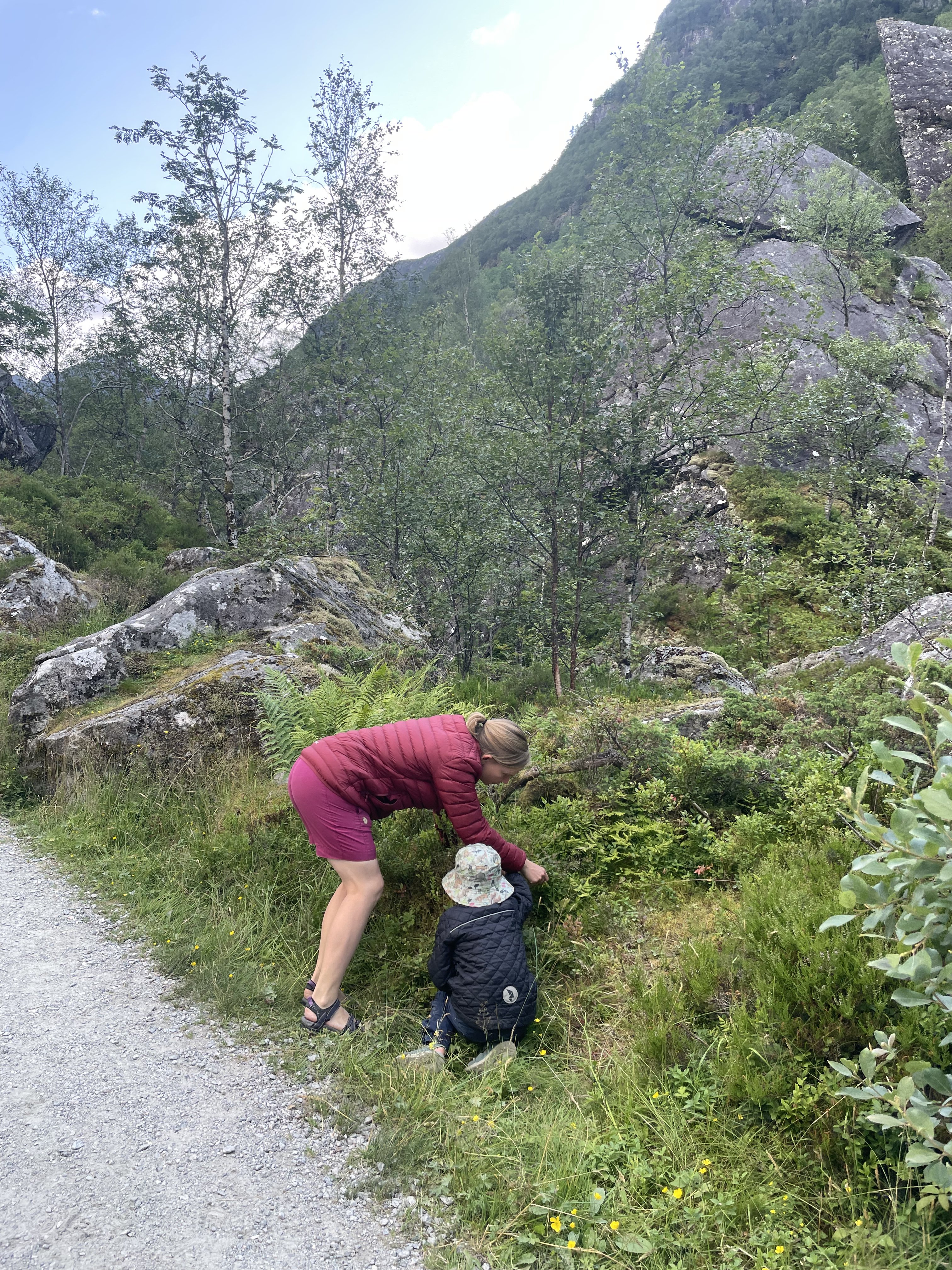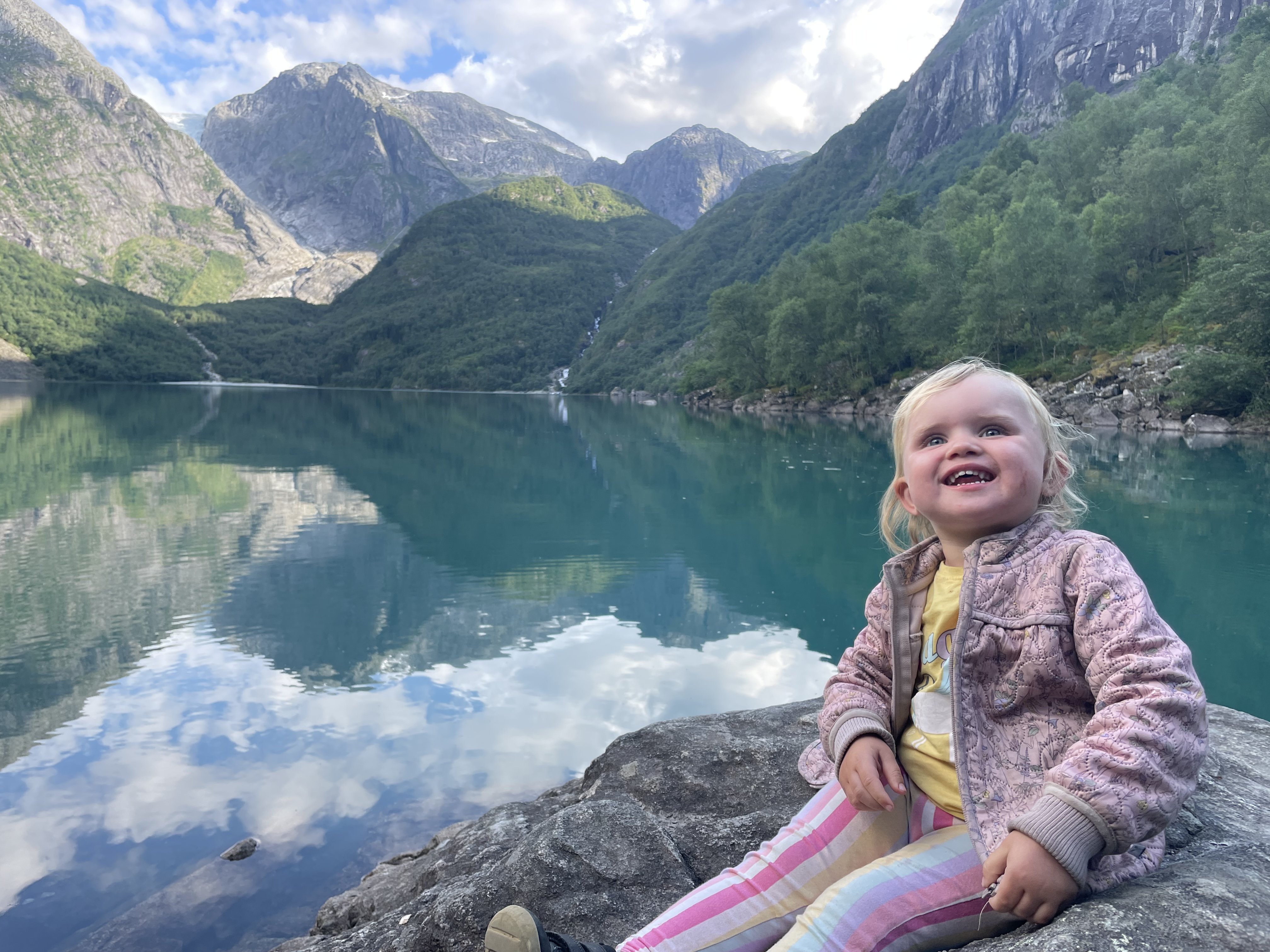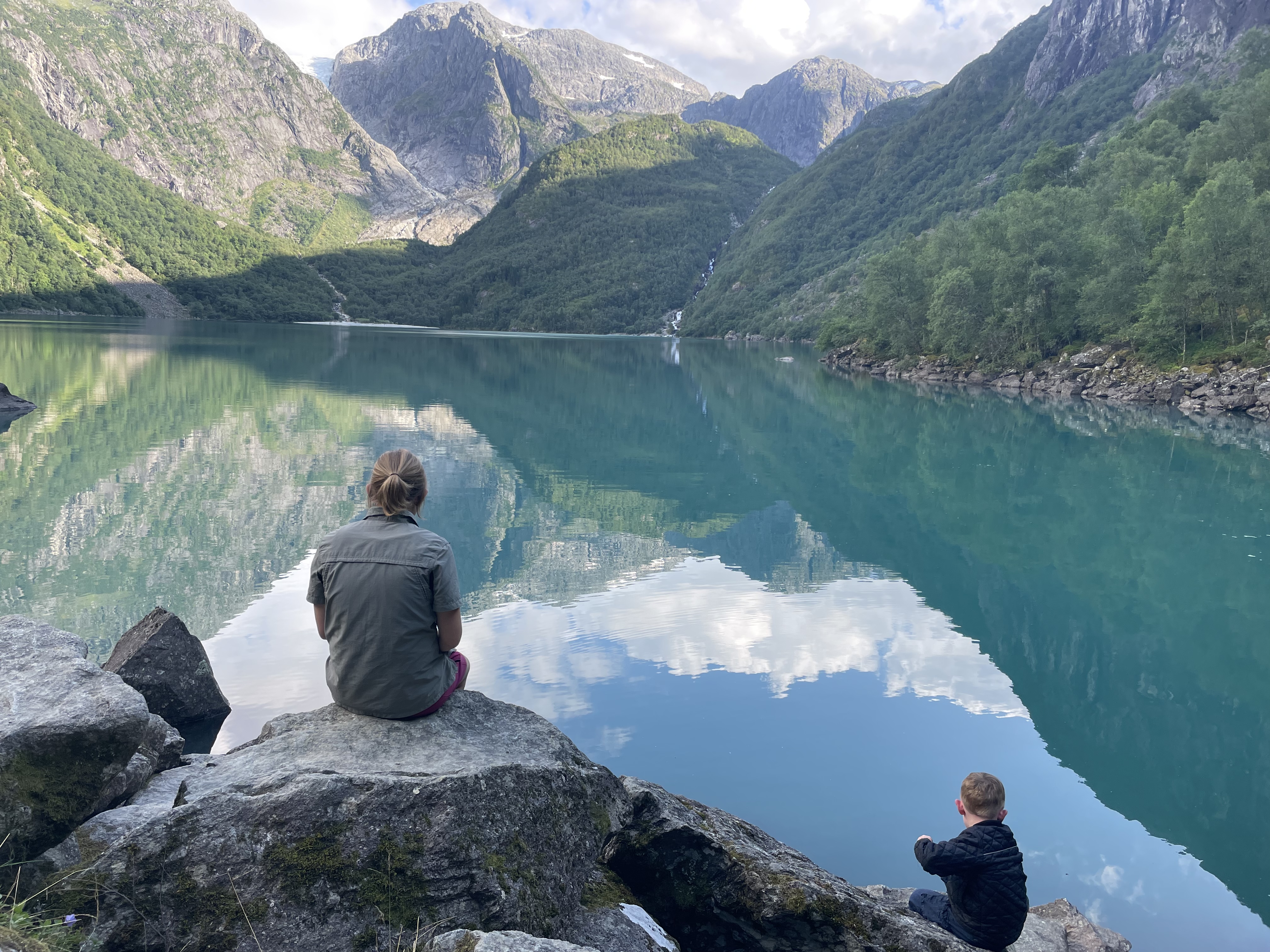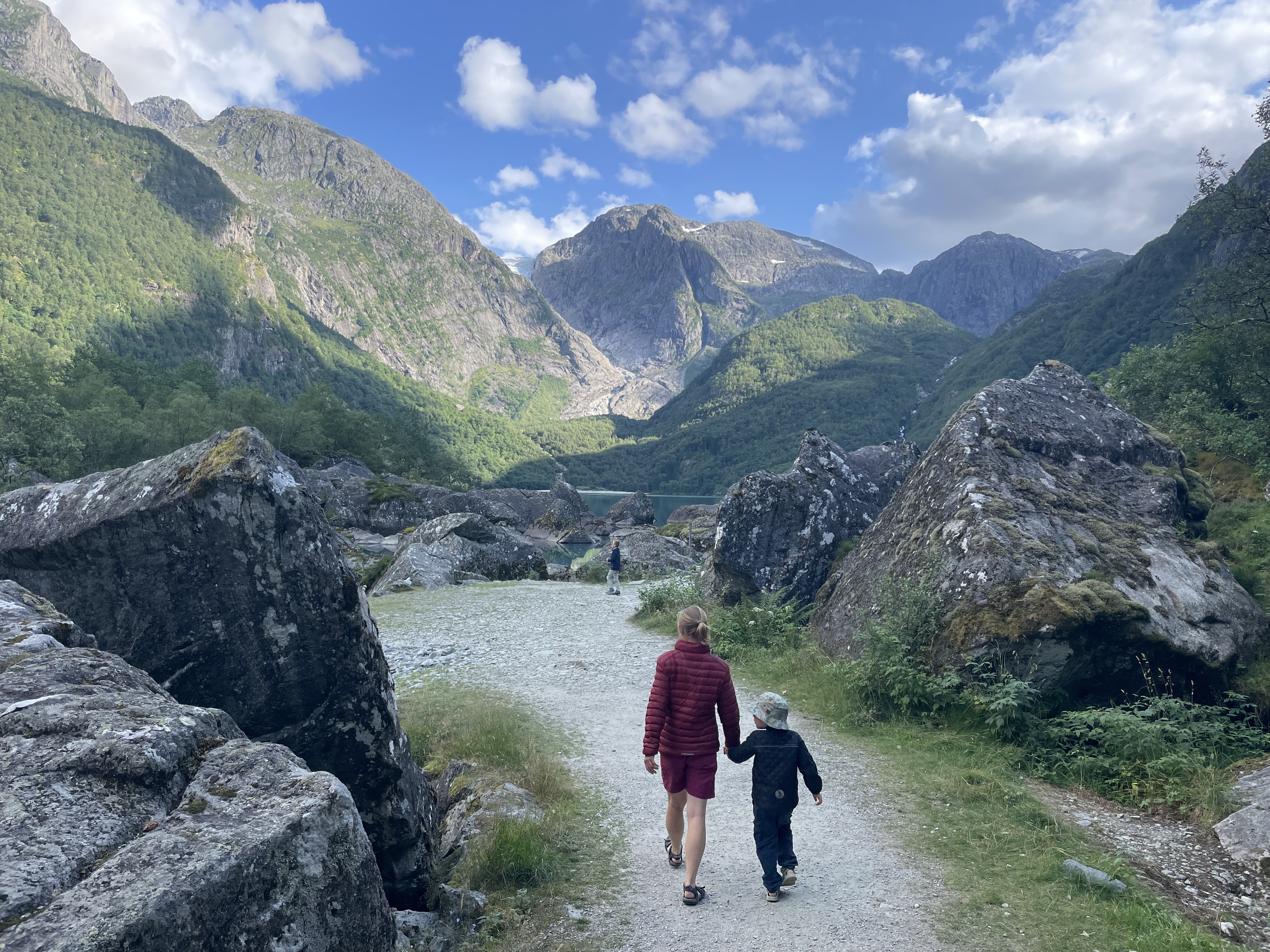 Da Astrid endelig vågnede var vi (nok mest os voksne) blevet lidt rastløse. Ida havde fundet en naturperle, som hedder Bondhusvatnet, der ligger på samme halvø som hytten, så vi kørte afsted på tur så snart vi kunne. Det var måske nok en lidt hovedløs beslutning, men stedet var helt enormt flot. Der var en gåtur derud på 4.6 km tur/retur fra parkeringspladsen, men vi kunne godt mærke at Aksel havde brændt en masse krudt af i jacuzzien, for han skulle både bæres noget af vejen og have doping i form af druesukkertabletter. Det skal måske nævnes at vi først var fremme ved parkeringspladsen klokken 17:15. Ups :-) Det gik nu okay og vi var glade for at vi kom af sted.
