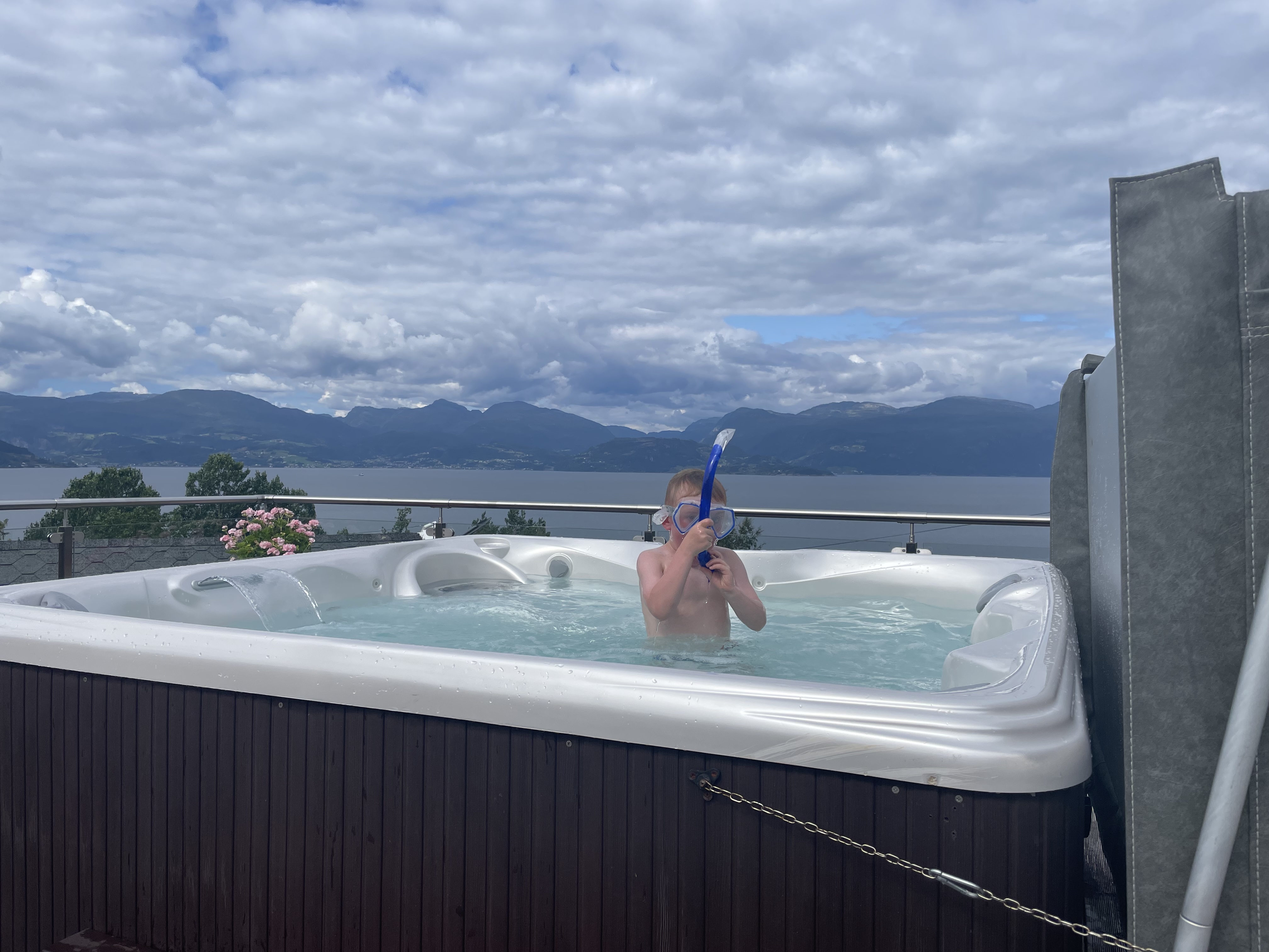 Det lykkedes at putte Astrid i klapvognen i dag og mens hun sov fik Aksel lov til at komme med pigen i jacuzzi! Sikke en fest de havde, med snorkel og dykkerbriller. Astrid tog sig en rigtig skaber af en lur, hvilket Aksel udnyttede til fulde; han var ikke til at hive ud af vandet igen.
