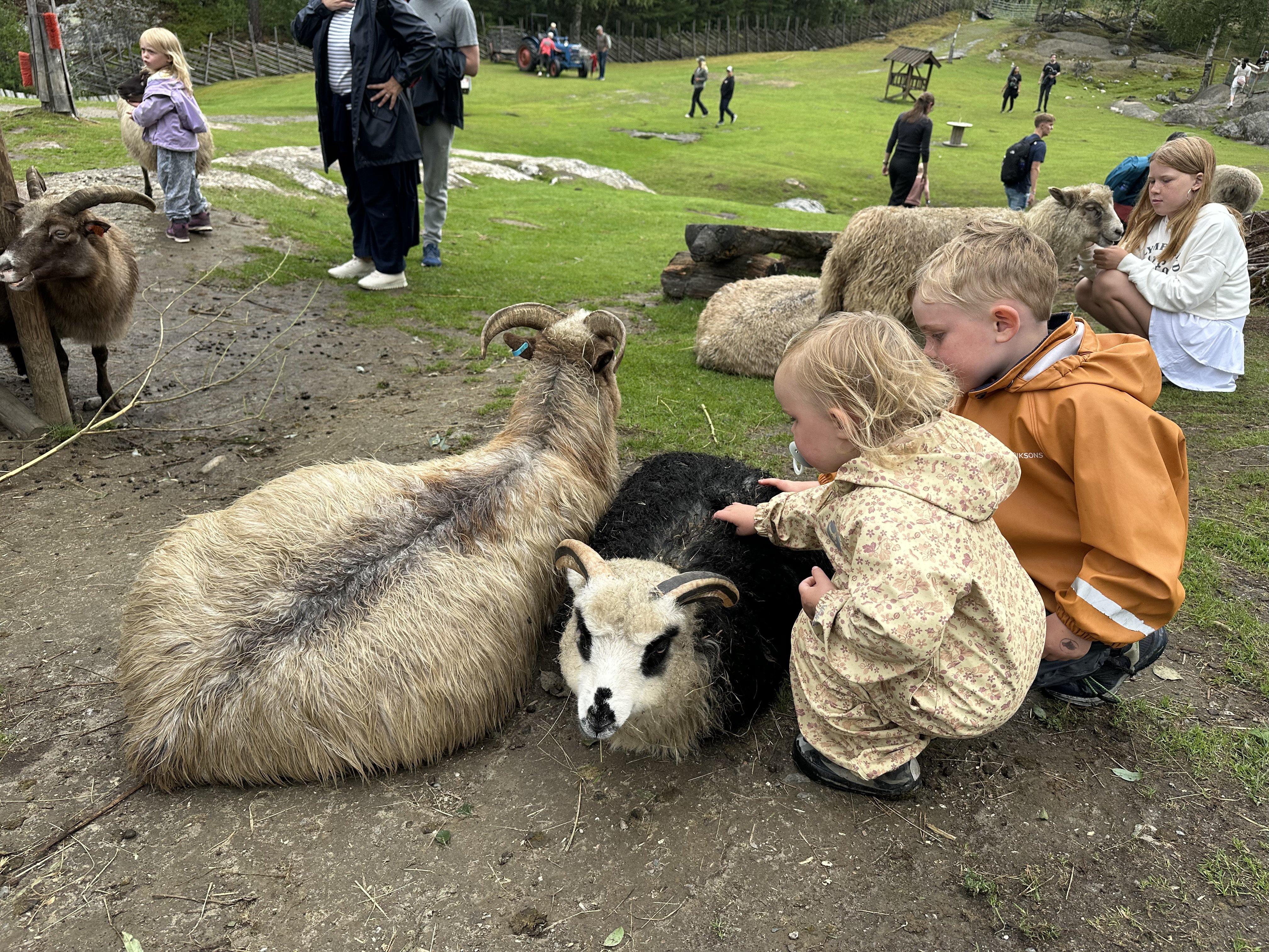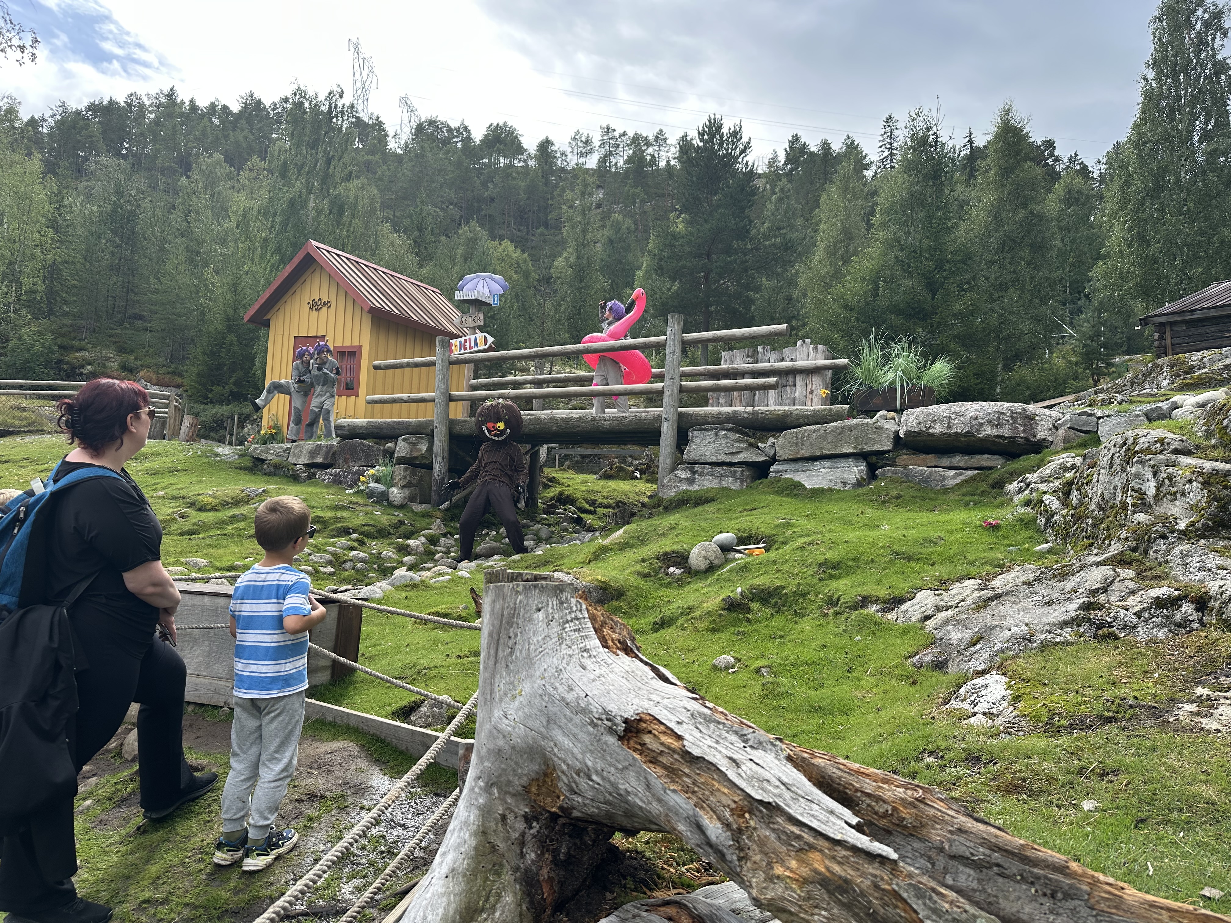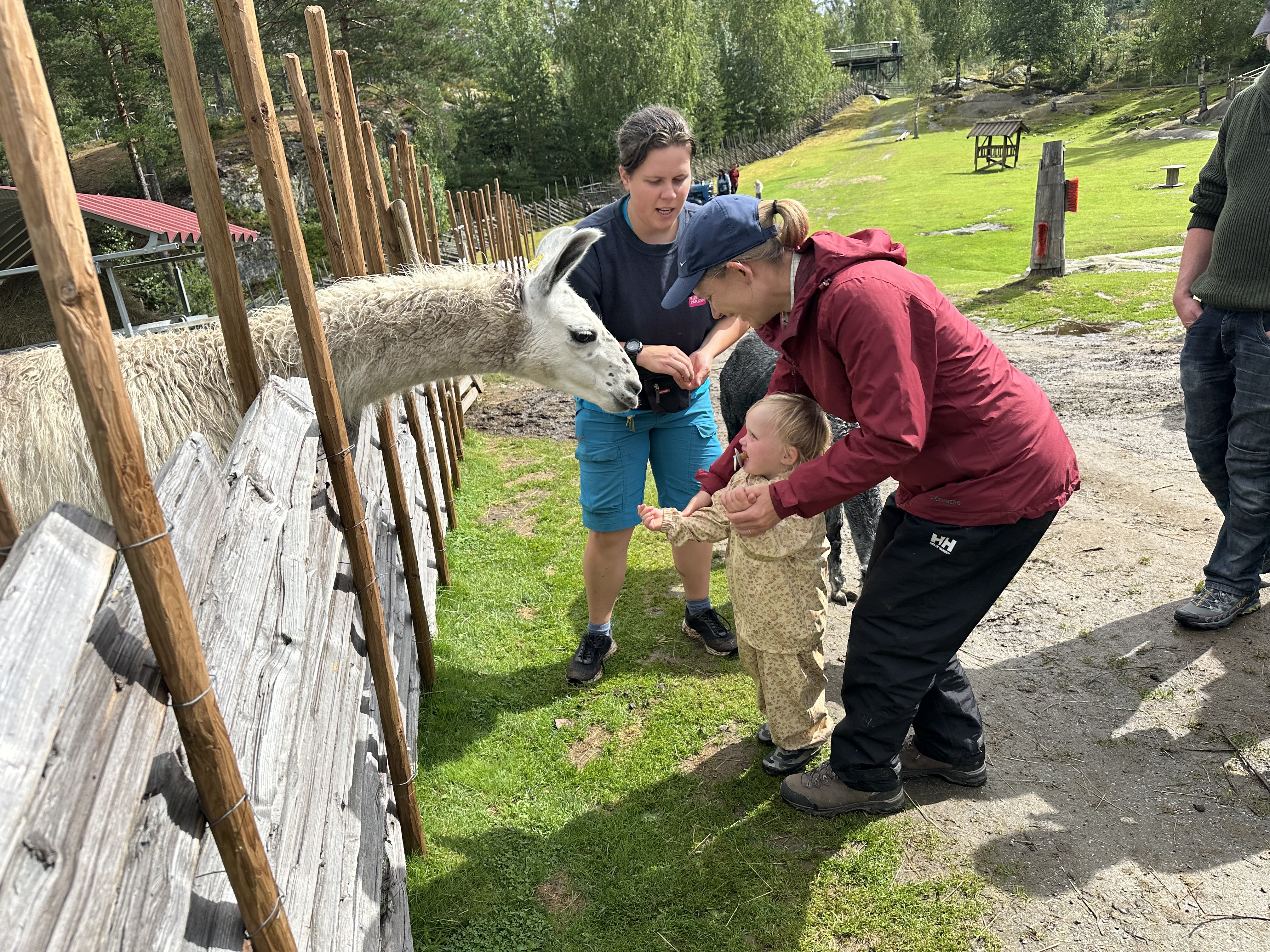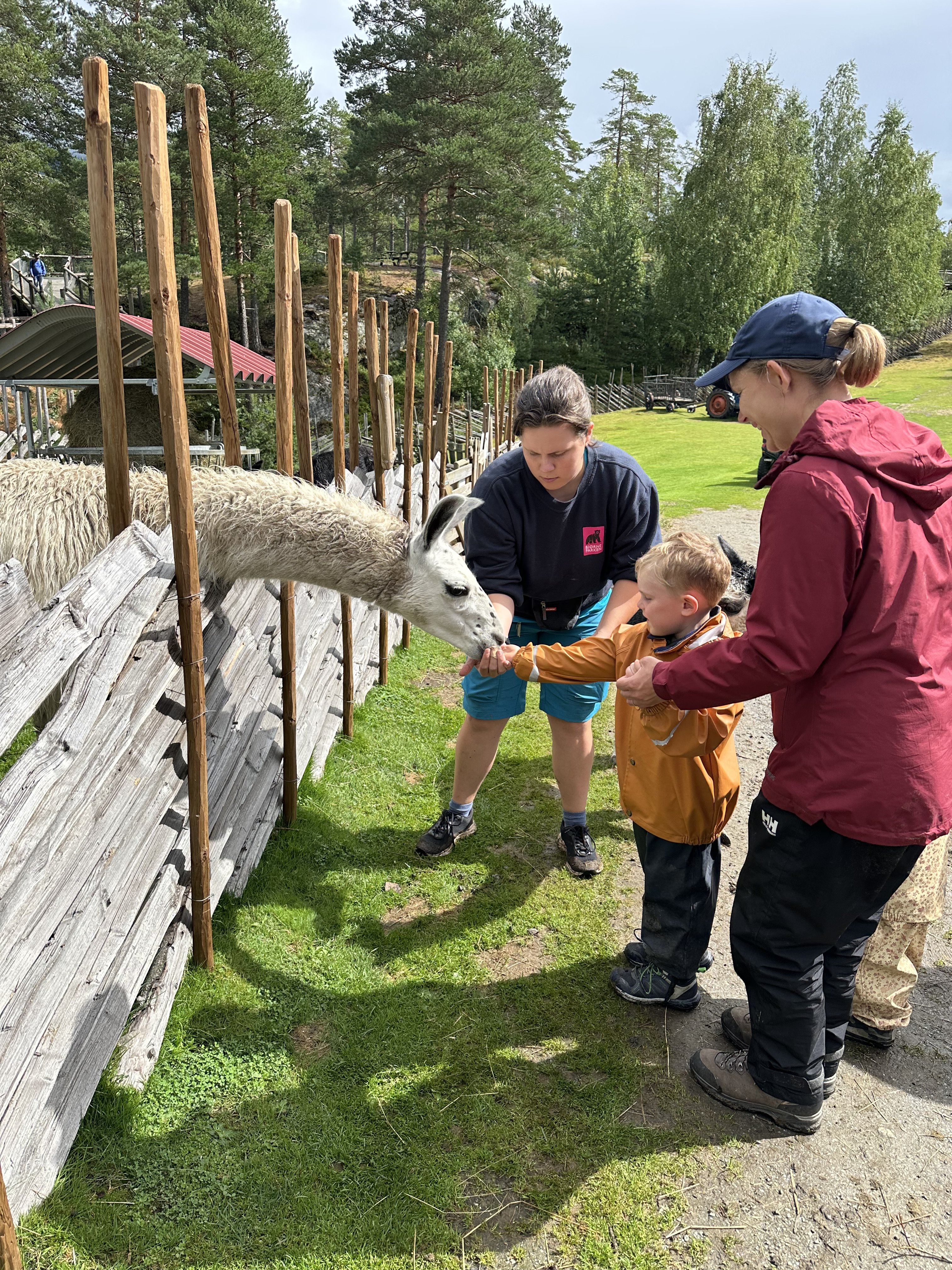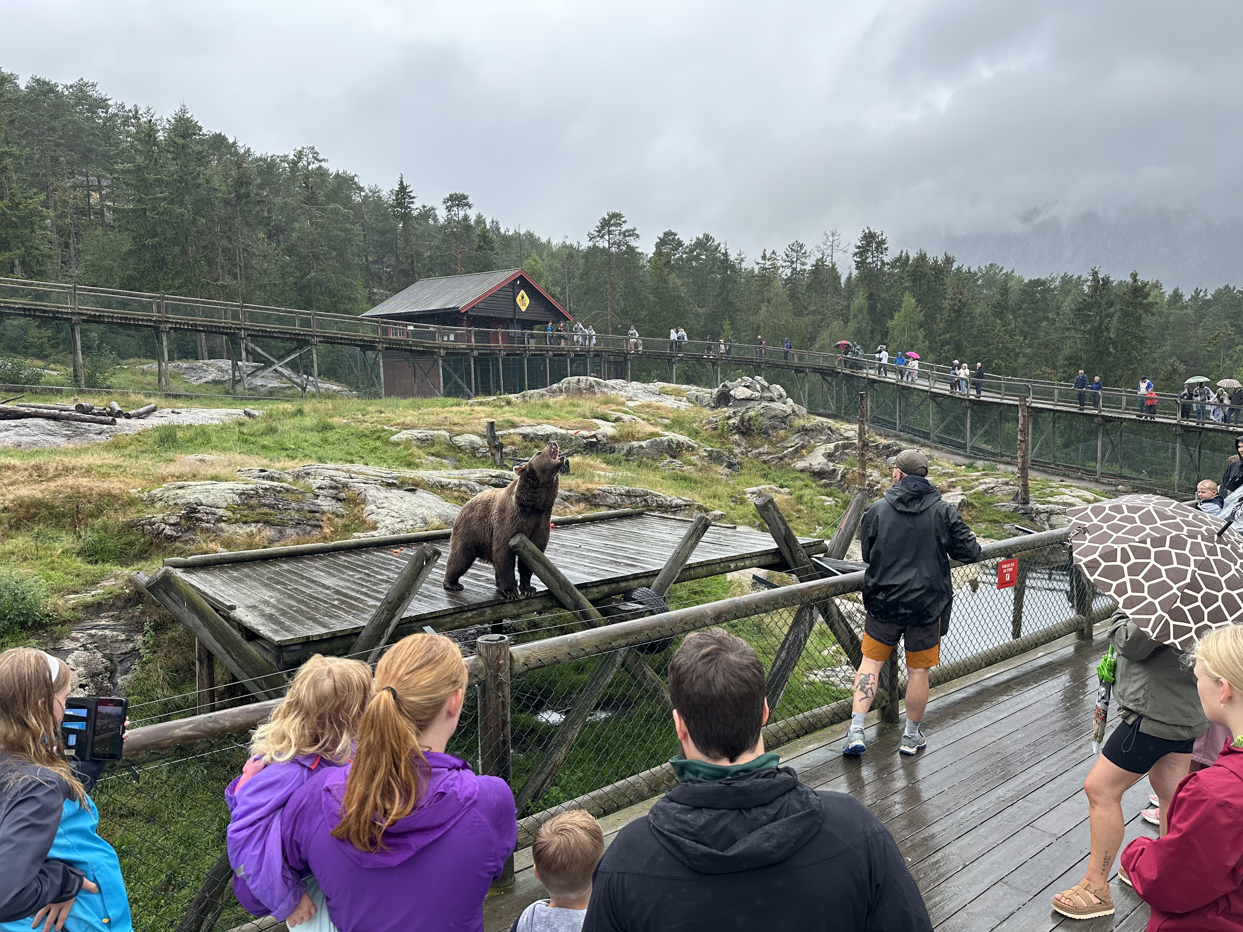 De havde et rigtig fint program i parken, som naturligt ledte os hen forbi de forskellige dyr. Først så vi bjørnene blive fodret. Derefter kunne man komme ind i ræveskoven, hvor vi fik lov til at håndfodre deres ræve. De havde tre styks røde ræve, alle tre opvokset i parken, som var meget nysgerrige og kom helt tæt på. Det var en sjov oplevelse - og de er nogle flotte dyr når de har det godt. Da vi havde været i ræveskoven gik vi op til ulvene, hvor vi spiste vores madpakke - ulvefodringen var nemlig det næste på programmet. Dem så vi også; der var to ulve. Som så meget andet her i Norge er Bjørneparken anlagt på en bjergskråning, hvilket gav parken en fin stemning af naturlighed. Ved siden af bjørnene kunne man komme ind på deres sæter, hvor der gik alpakkaer, får og kaniner. Her var børnene på dyrepasserskole, hvor vi skulle samle lort op efter dyrene og hjælpe med at fodre dem. Til sidst fik de hver et badge! Da dyrepasserskolen var færdig passede det lige med at man kunne se deres bukke bruse show - en moderne fortolkning af den gamle historie. Det syntes Astrid dog var lige uhyggeligt nok, for hun var blevet træt, og så blev hun puttet i klapvognen.