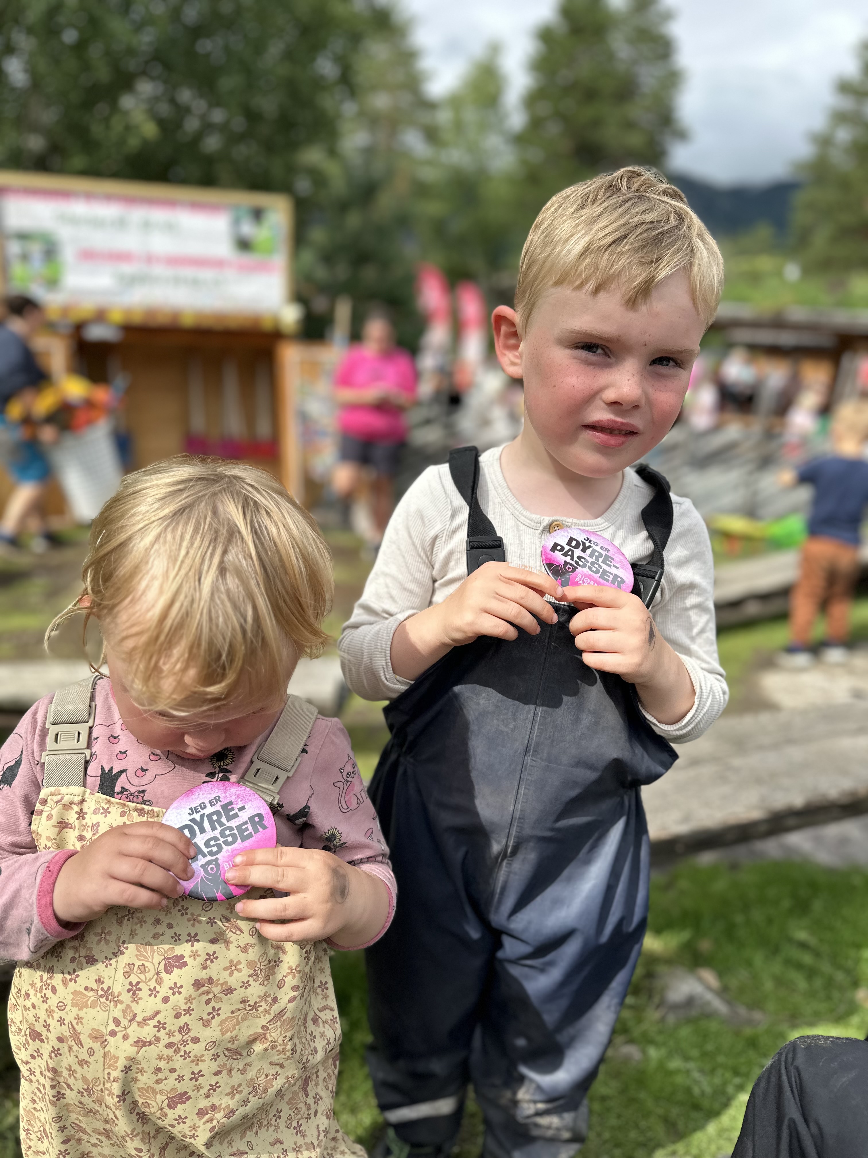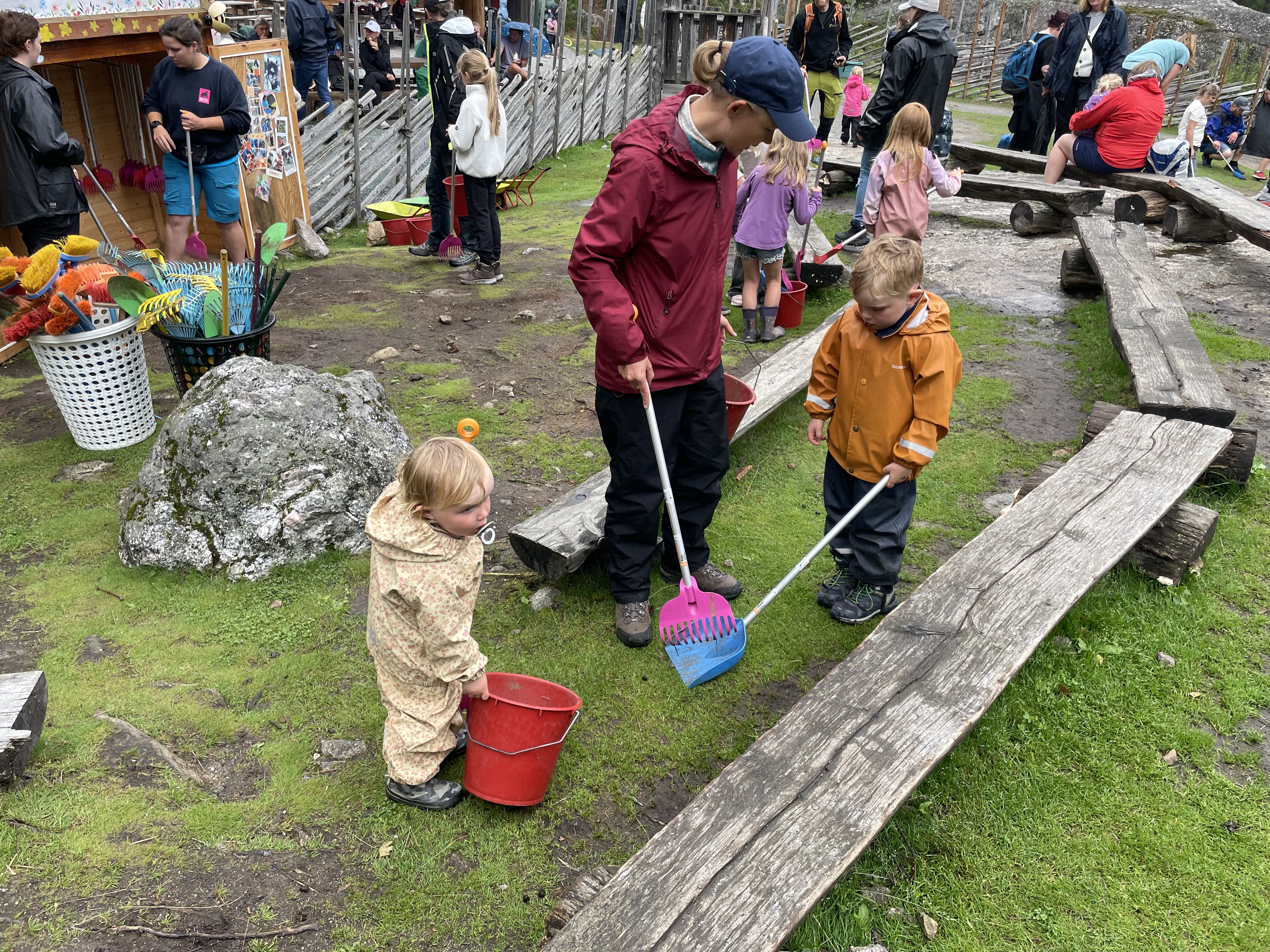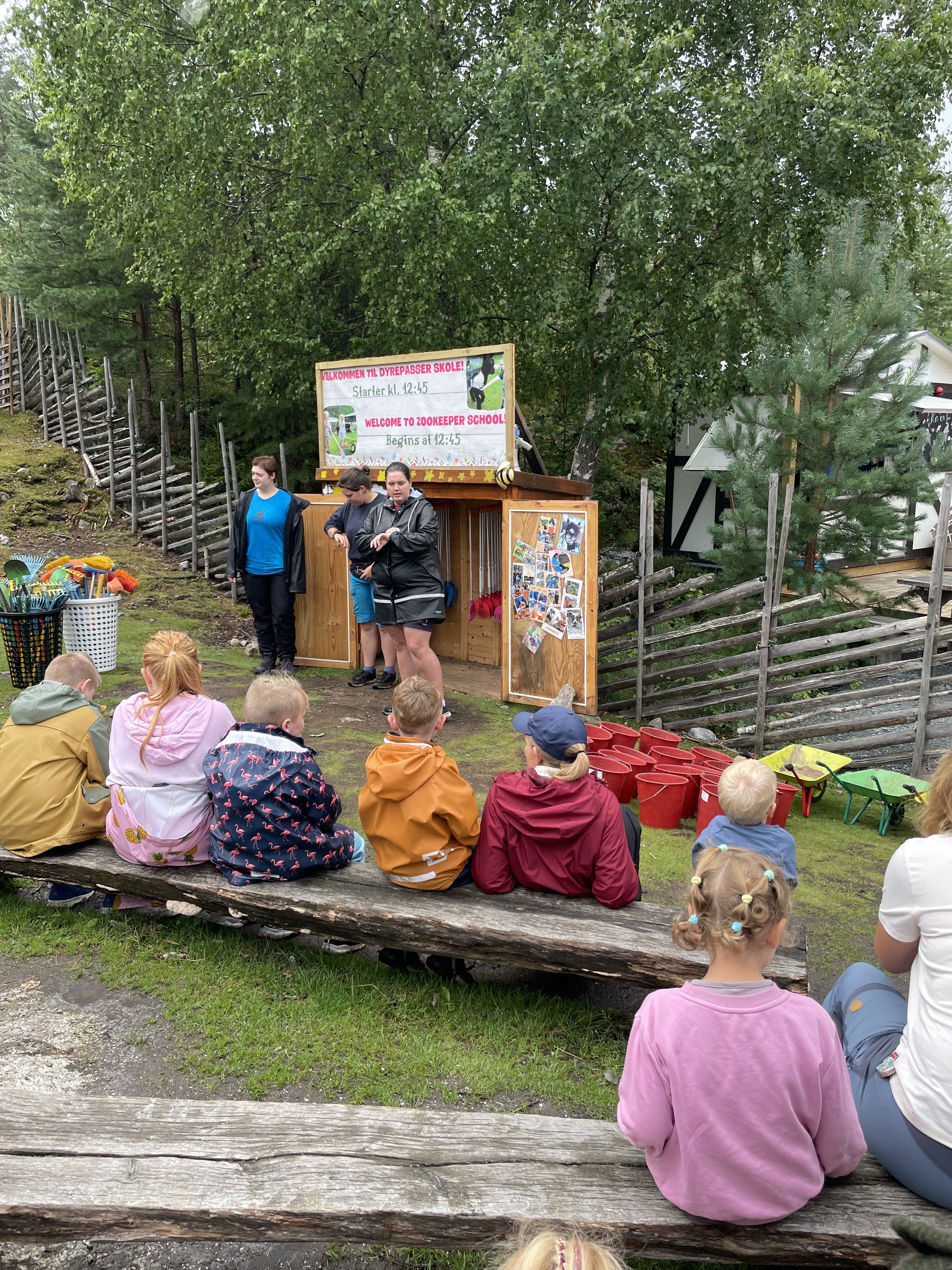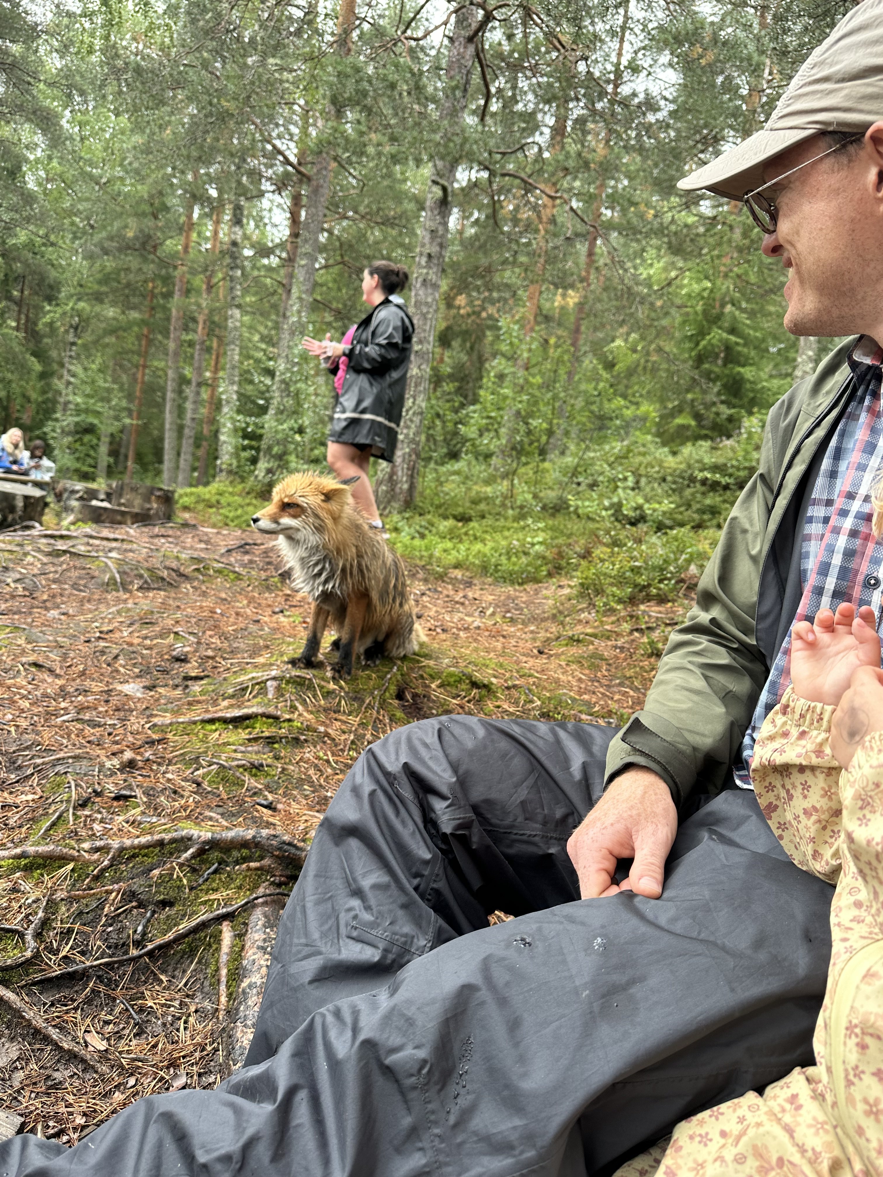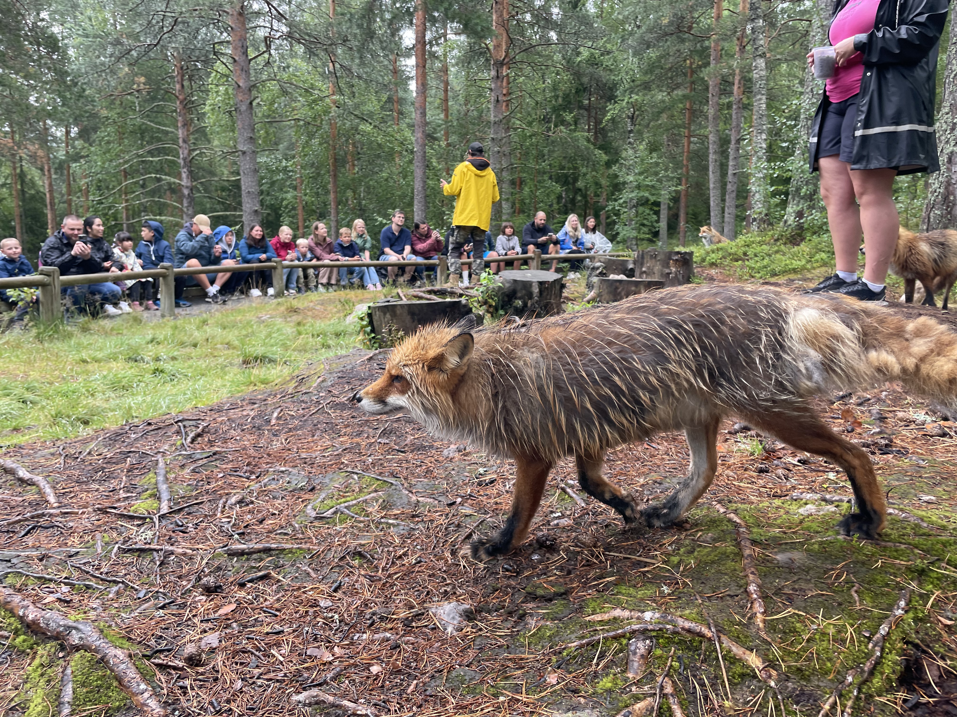De havde et rigtig fint program i parken, som naturligt ledte os hen forbi de forskellige dyr. Først så vi bjørnene blive fodret. Derefter kunne man komme ind i ræveskoven, hvor vi fik lov til at håndfodre deres ræve. De havde tre styks røde ræve, alle tre opvokset i parken, som var meget nysgerrige og kom helt tæt på. Det var en sjov oplevelse - og de er nogle flotte dyr når de har det godt. Da vi havde været i ræveskoven gik vi op til ulvene, hvor vi spiste vores madpakke - ulvefodringen var nemlig det næste på programmet. Dem så vi også; der var to ulve. Som så meget andet her i Norge er Bjørneparken anlagt på en bjergskråning, hvilket gav parken en fin stemning af naturlighed. Ved siden af bjørnene kunne man komme ind på deres sæter, hvor der gik alpakkaer, får og kaniner. Her var børnene på dyrepasserskole, hvor vi skulle samle lort op efter dyrene og hjælpe med at fodre dem. Til sidst fik de hver et badge! Da dyrepasserskolen var færdig passede det lige med at man kunne se deres bukke bruse show - en moderne fortolkning af den gamle historie. Det syntes Astrid dog var lige uhyggeligt nok, for hun var blevet træt, og så blev hun puttet i klapvognen.