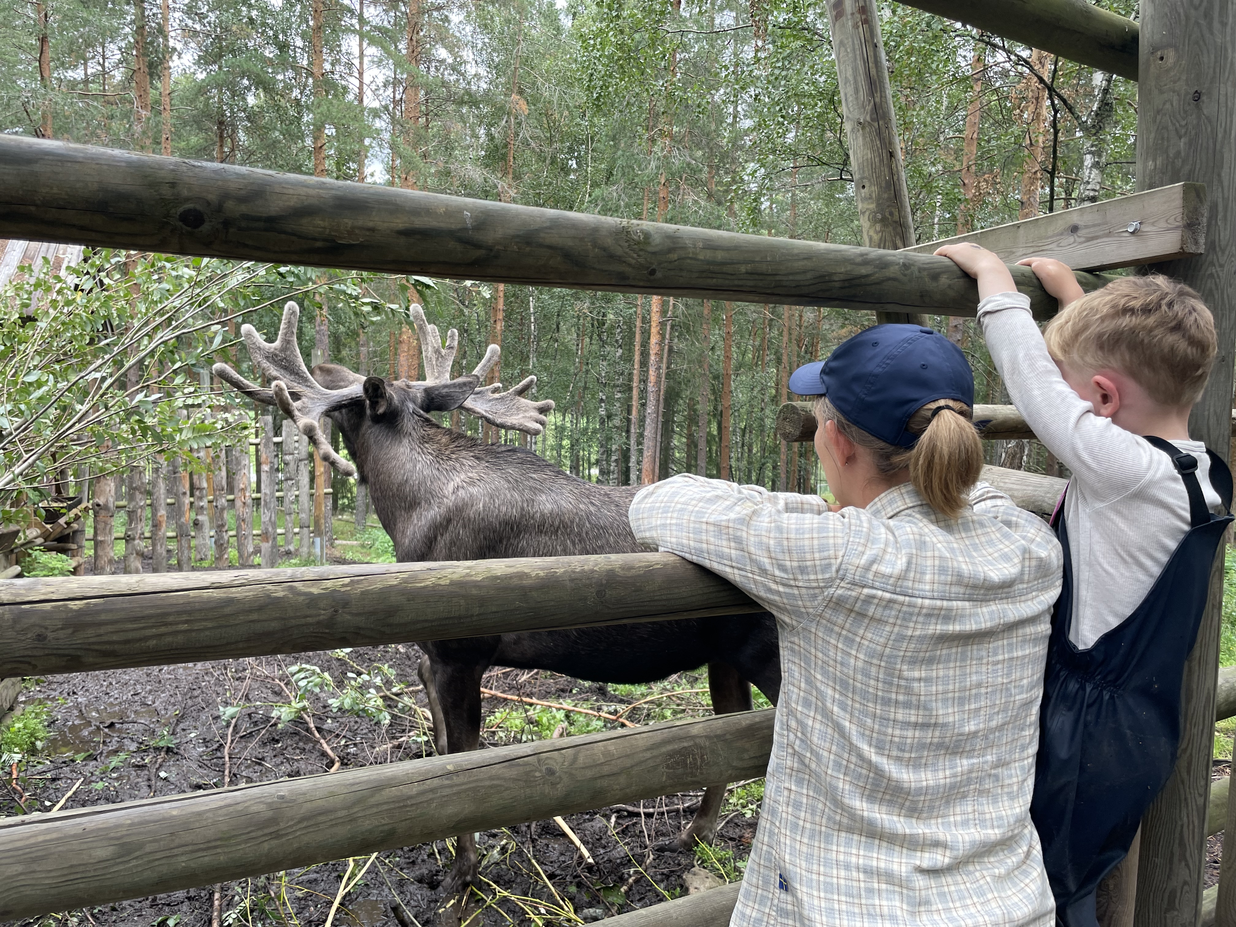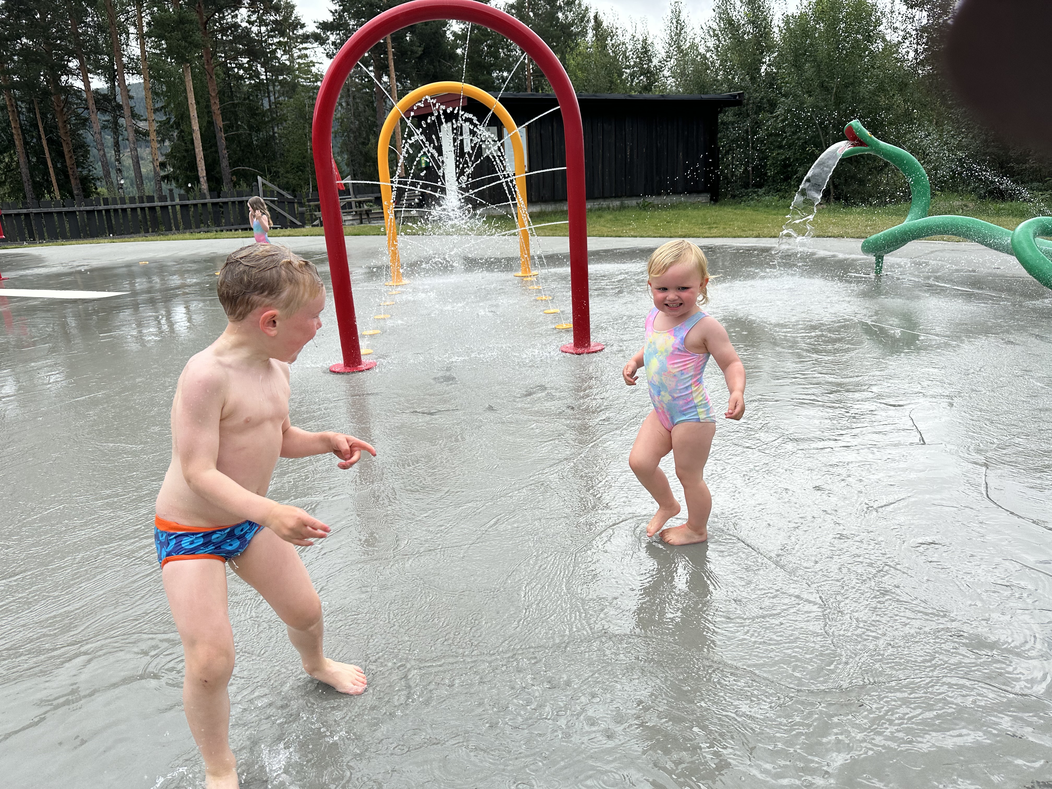 Mens Astrid sov fik vi set nærmere på de sidste dyr. Vi så blandt andet deres leopard (måske det eneste ikke-hjemmehørende dyr i parken), og en han-elg helt tæt på. Aksel prøvede også deres rutsjebane (bare en lille en) to gange og kiggede på dinusaurerne. Efter Astrid vågnede igen gik vi ind i deres lille indendørs krokodille-zoo og så opdagede de ellers dagens højdepunkt: plaskeland! Dét måtte de bare prøve, så vi luffede ud i bilen efter ungernes badetøj og gik ned til det udendørs bade-område. De fik deres badetøj på og så tonsede de ellers rund i springvand og vandpytter. Ret sjovt og ret koldt til sidst.