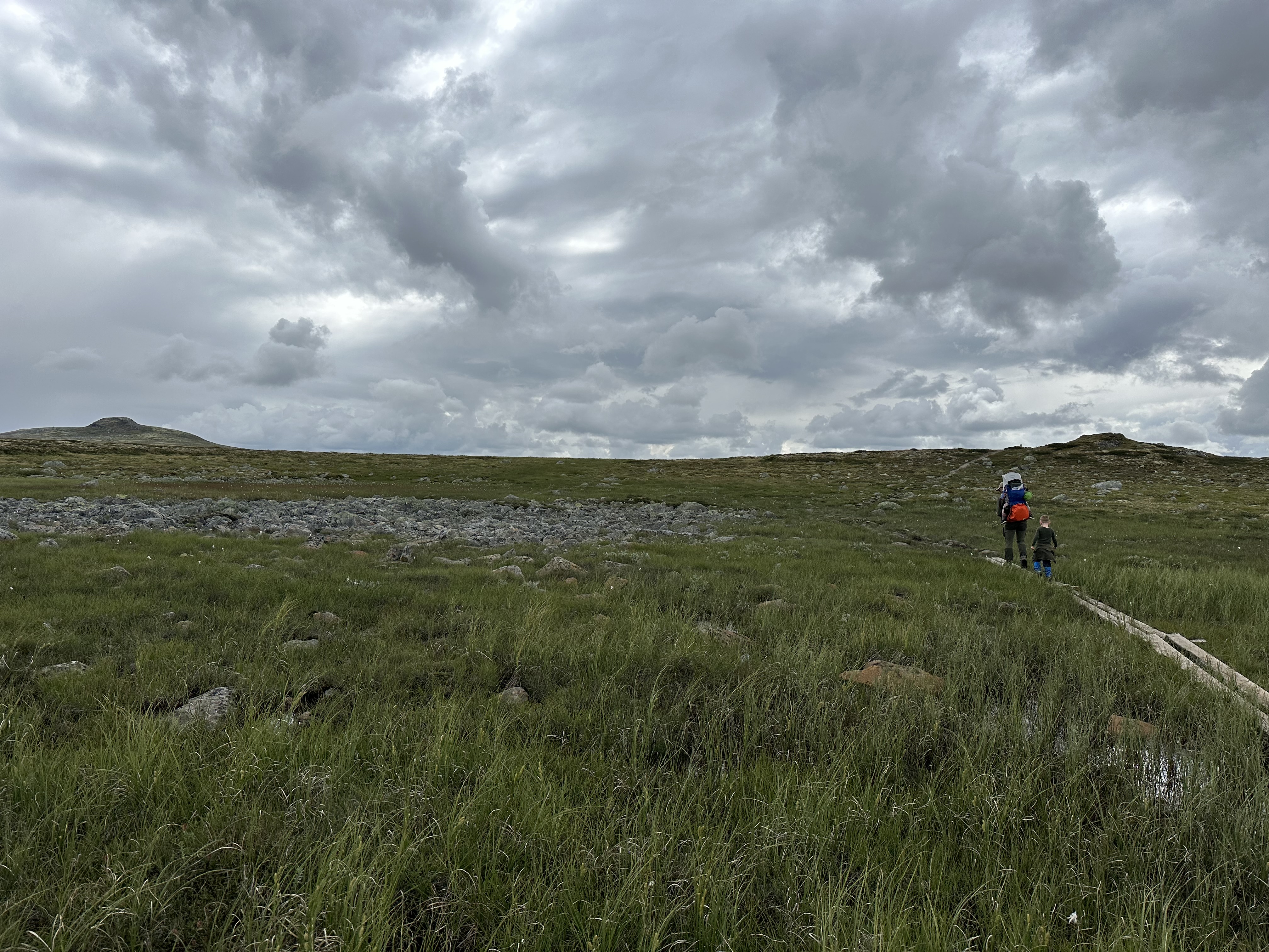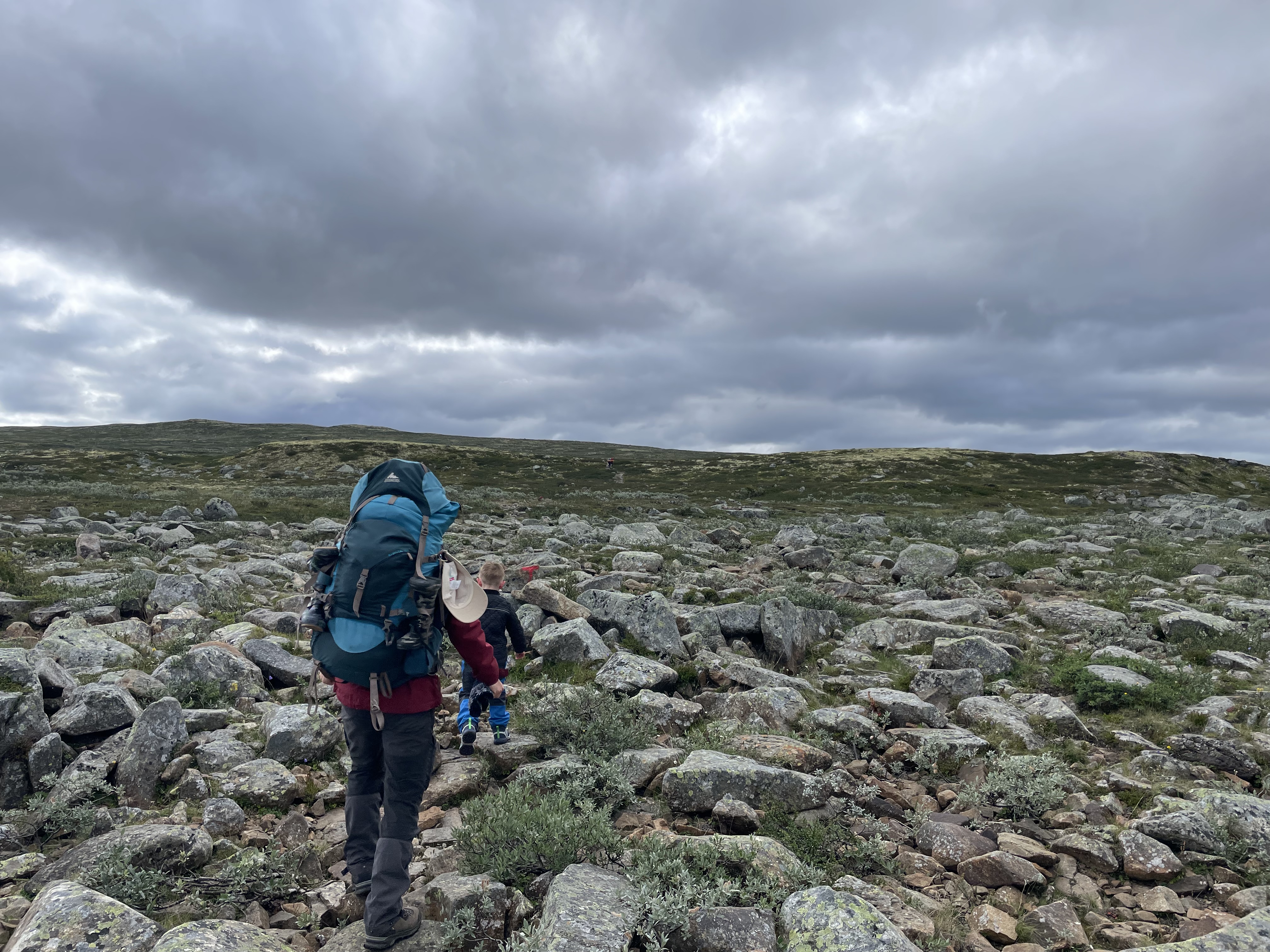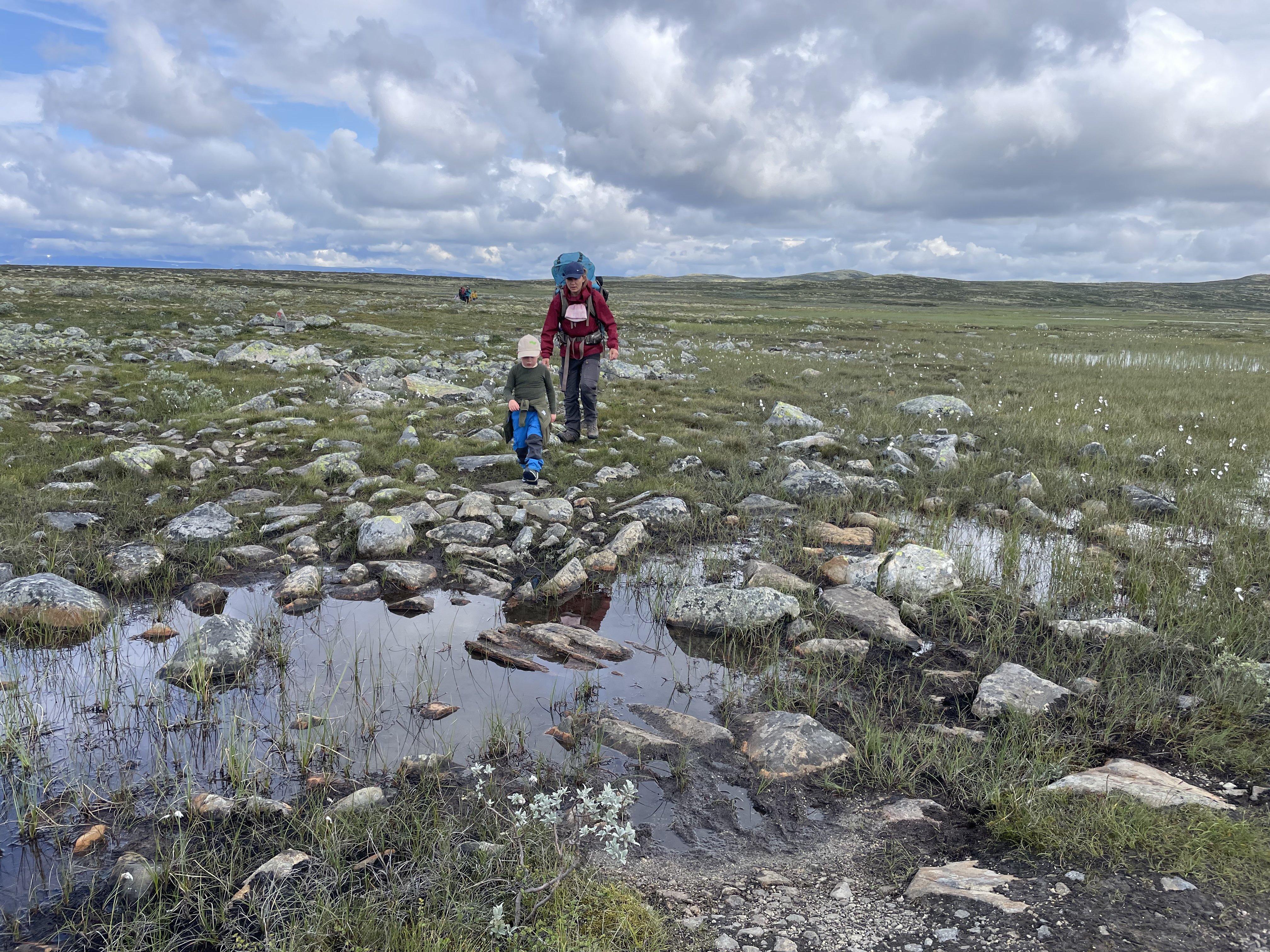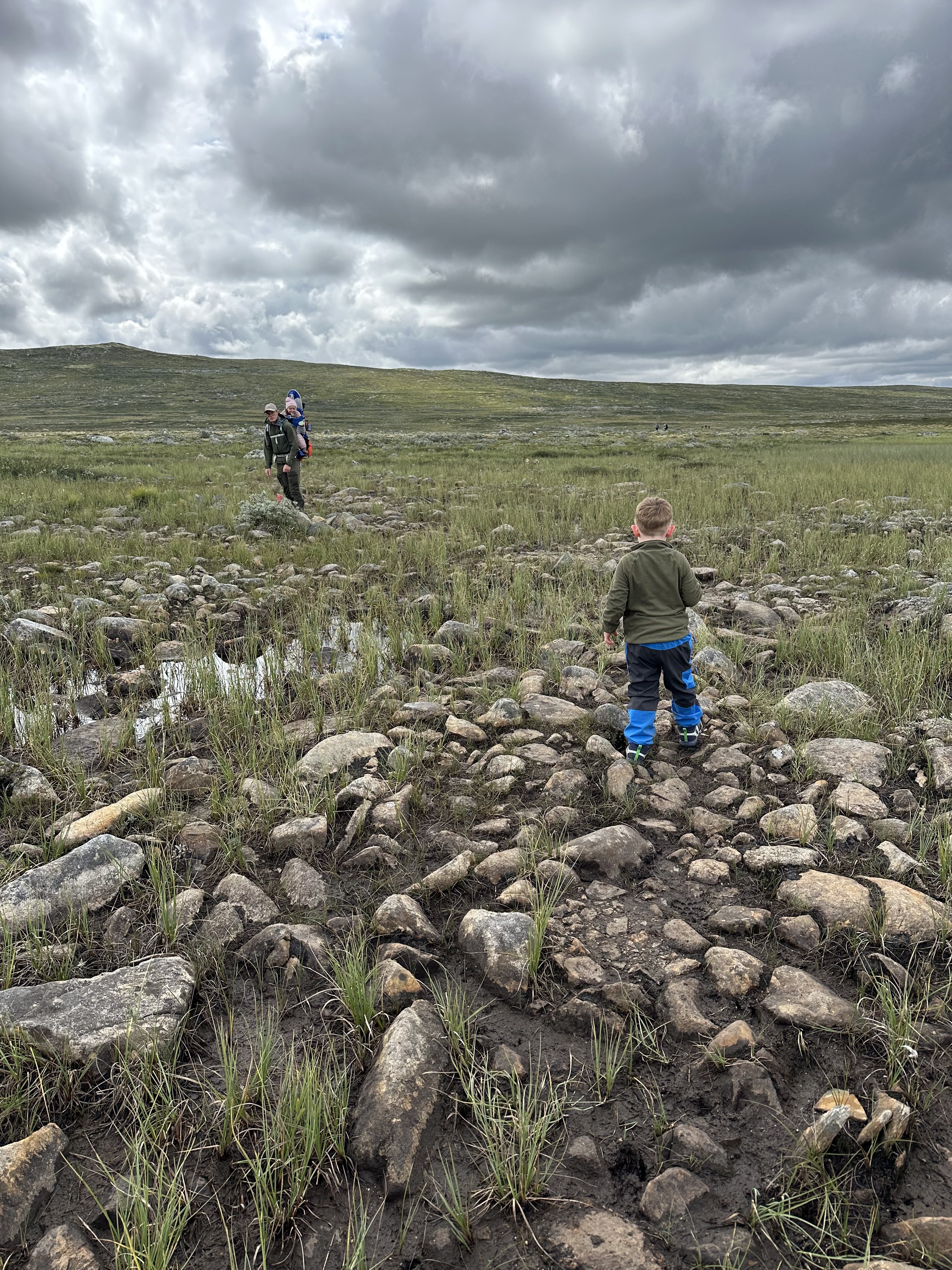 Afsted det gik ud over sletten – 13 kilometer skulle vi gå idag. Vi blev ret hurtige enige om, at det var godt vi ikke havde nogle vogne med her (noget vi ellers havde drøftet flere gange og skrevet med personalet på Rauhelleren om), for terrænet var bestemt ikke vognvenligt med alle de sten. Vi blev selvfølgelig hurtigt overhalet af flere af de norske familier og vennegrupper. Alle var dog meget venlige og var imponerede over Aksel. ”Hvor er du flink til å gå”, og ” Så flott at du kan gå en så lang en tur”.