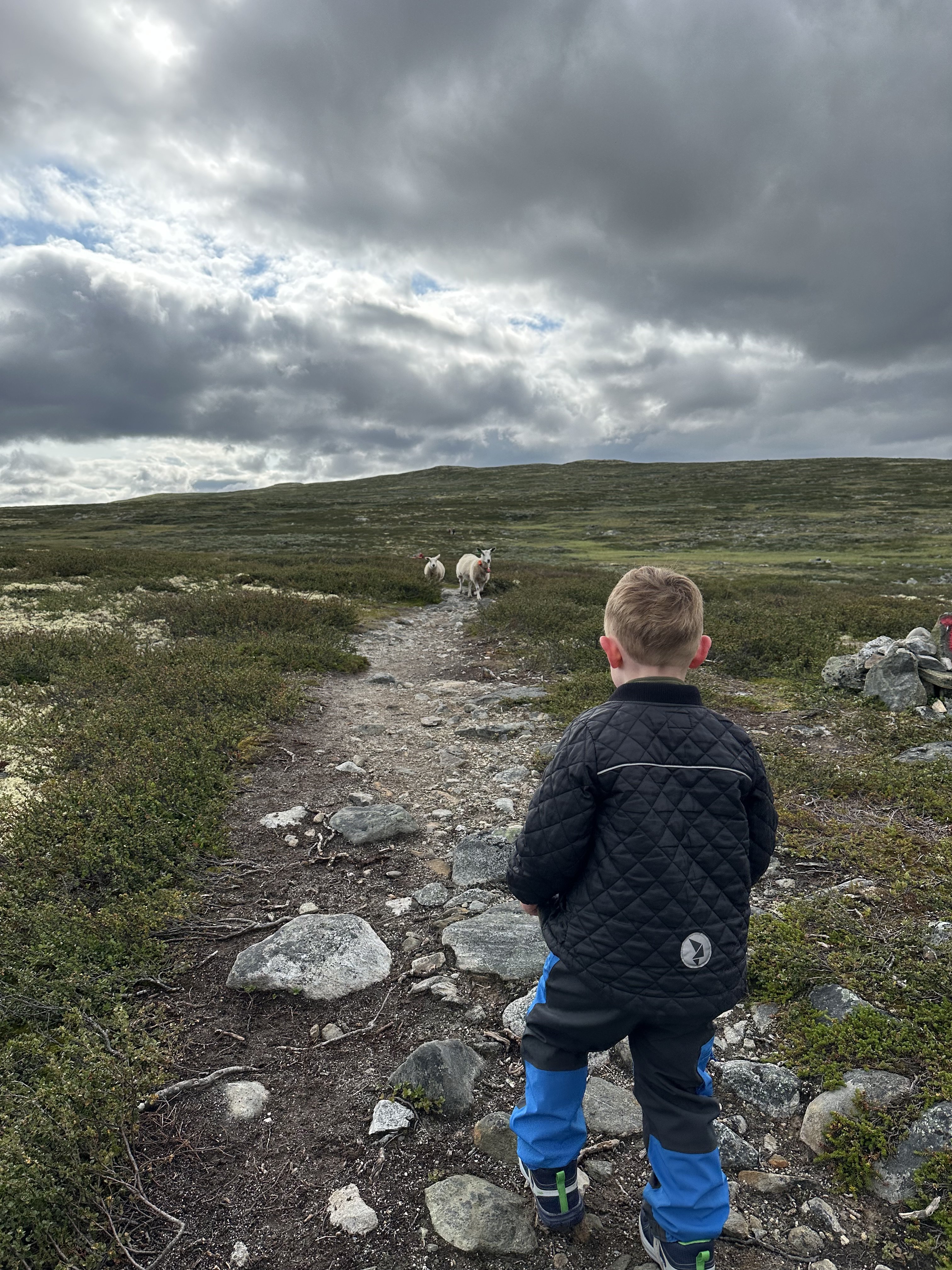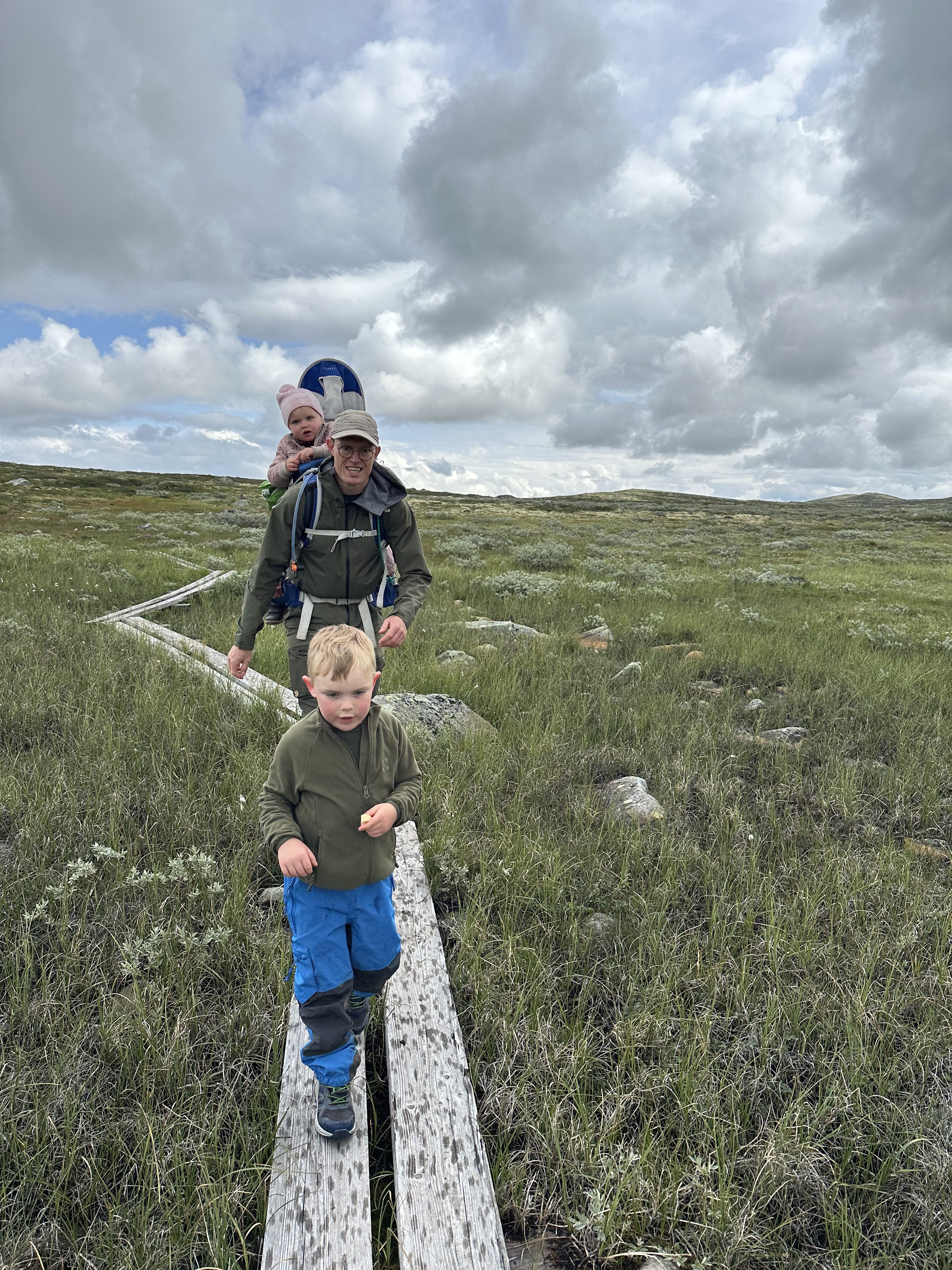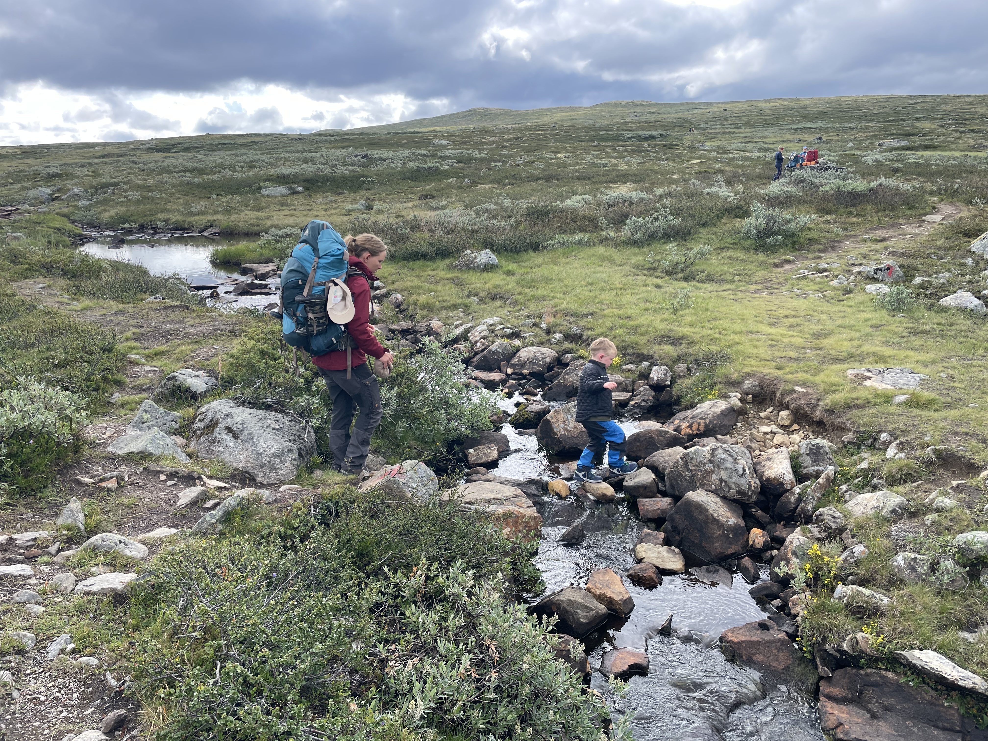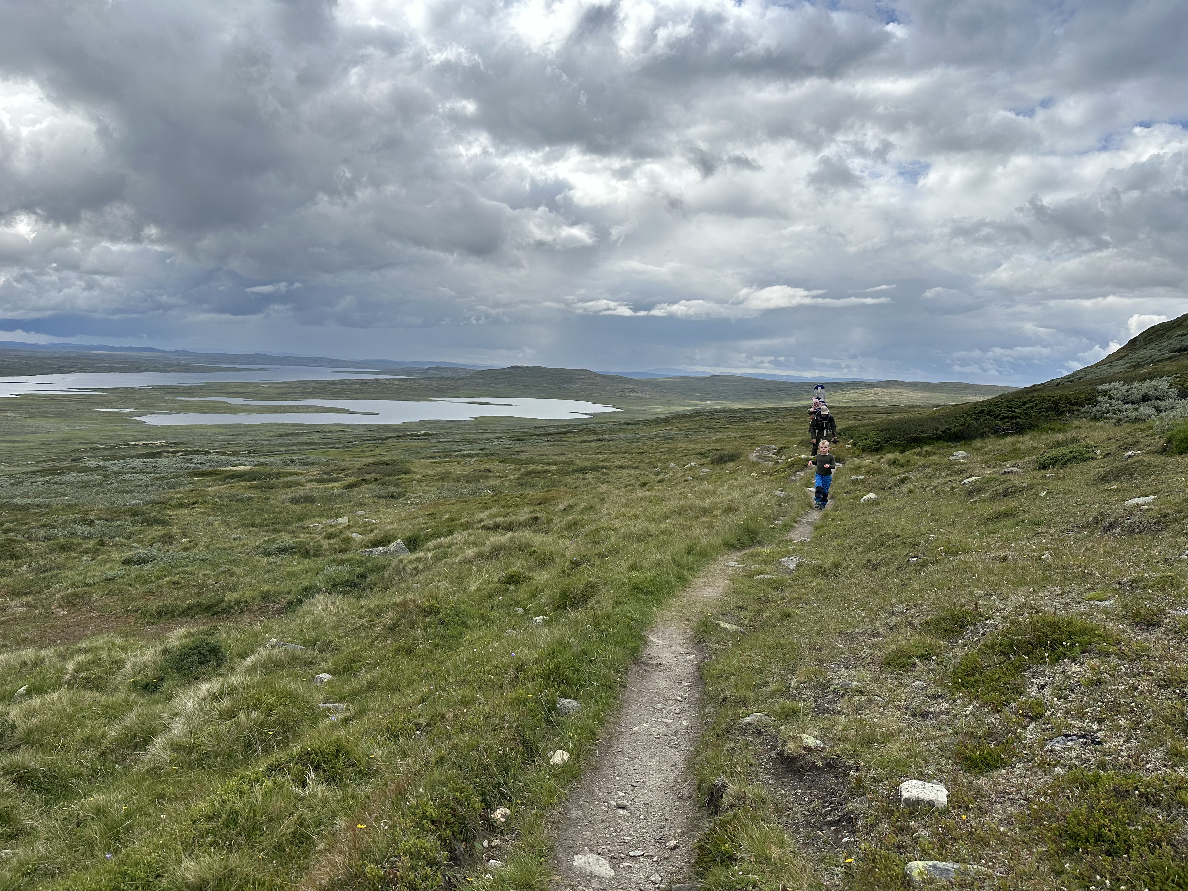 Afsted det gik ud over sletten – 13 kilometer skulle vi gå idag. Vi blev ret hurtige enige om, at det var godt vi ikke havde nogle vogne med her (noget vi ellers havde drøftet flere gange og skrevet med personalet på Rauhelleren om), for terrænet var bestemt ikke vognvenligt med alle de sten. Vi blev selvfølgelig hurtigt overhalet af flere af de norske familier og vennegrupper. Alle var dog meget venlige og var imponerede over Aksel. ”Hvor er du flink til å gå”, og ” Så flott at du kan gå en så lang en tur”.