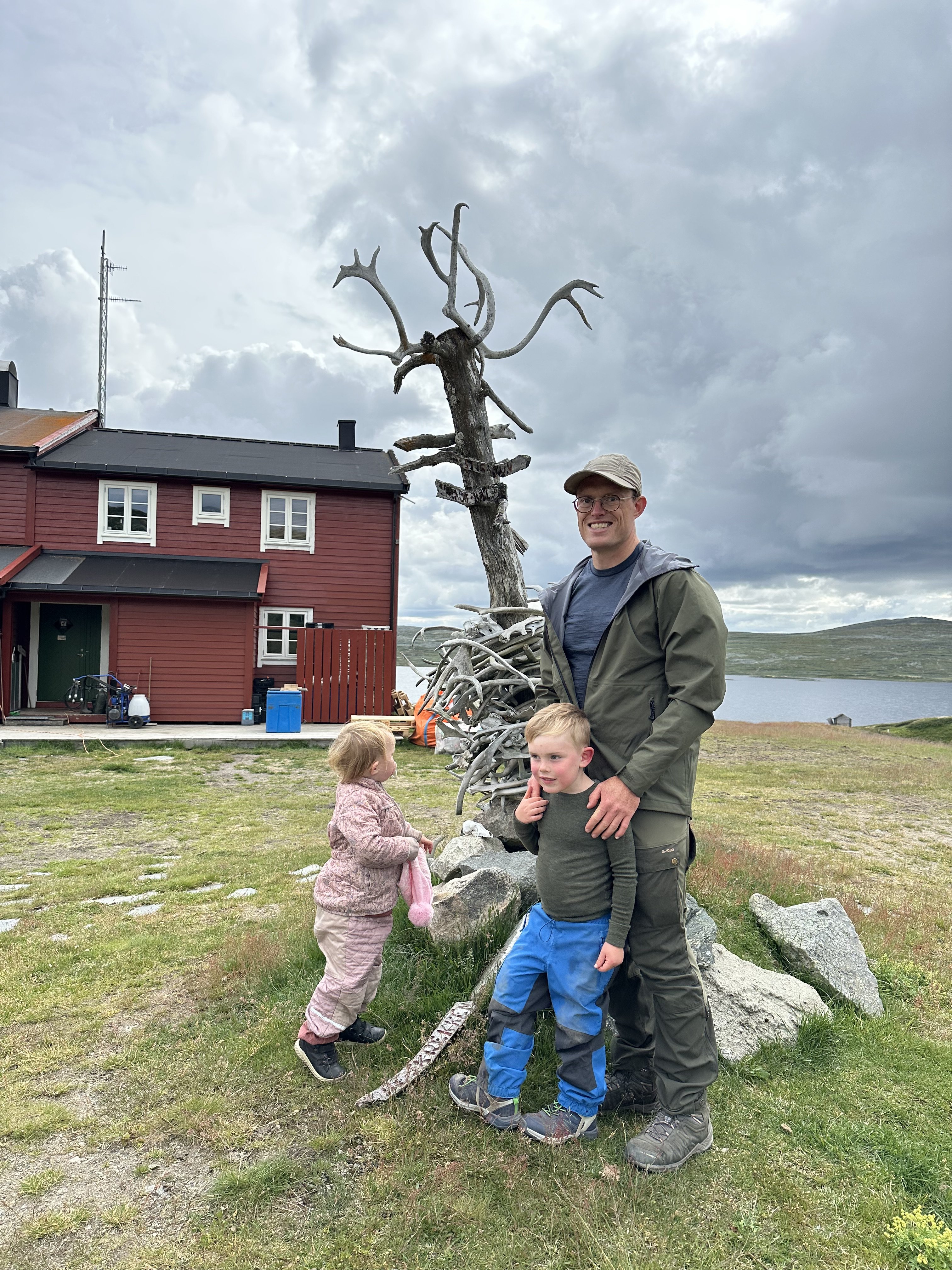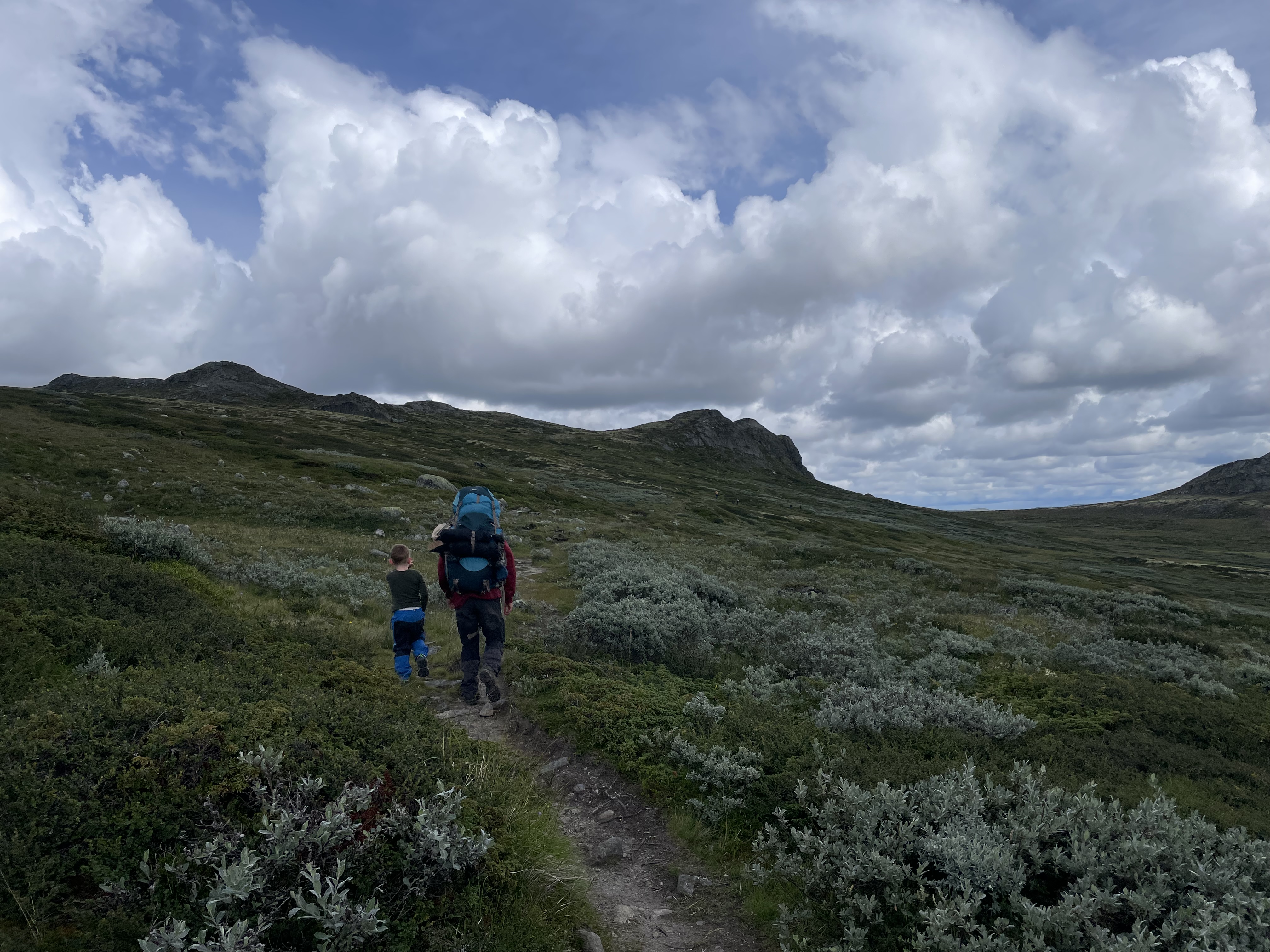 Det var en lang etape, og flere steder var den også udfordrende med vandløb og vådområder der skulle passeres ved hjælp af tilfældigt placerede trædesten. Både Ida og Mads måtte sande at rygsækkene var tungt pakket, måske vi alligevel havde pakket for meget varmt tøj? De 10-14 grader havde i hvert fald virket koldere i Halne end de gjorde i rask gang i fjeldet. Aksel derimod klarede det storartet. Han var dog træt de sidste par kilometer, og tålmodigheden var ved at være brugt op. Med sang og masser af snacks nåede vi frem til hytten kl. 16:15 uden de store problemer undervejs.