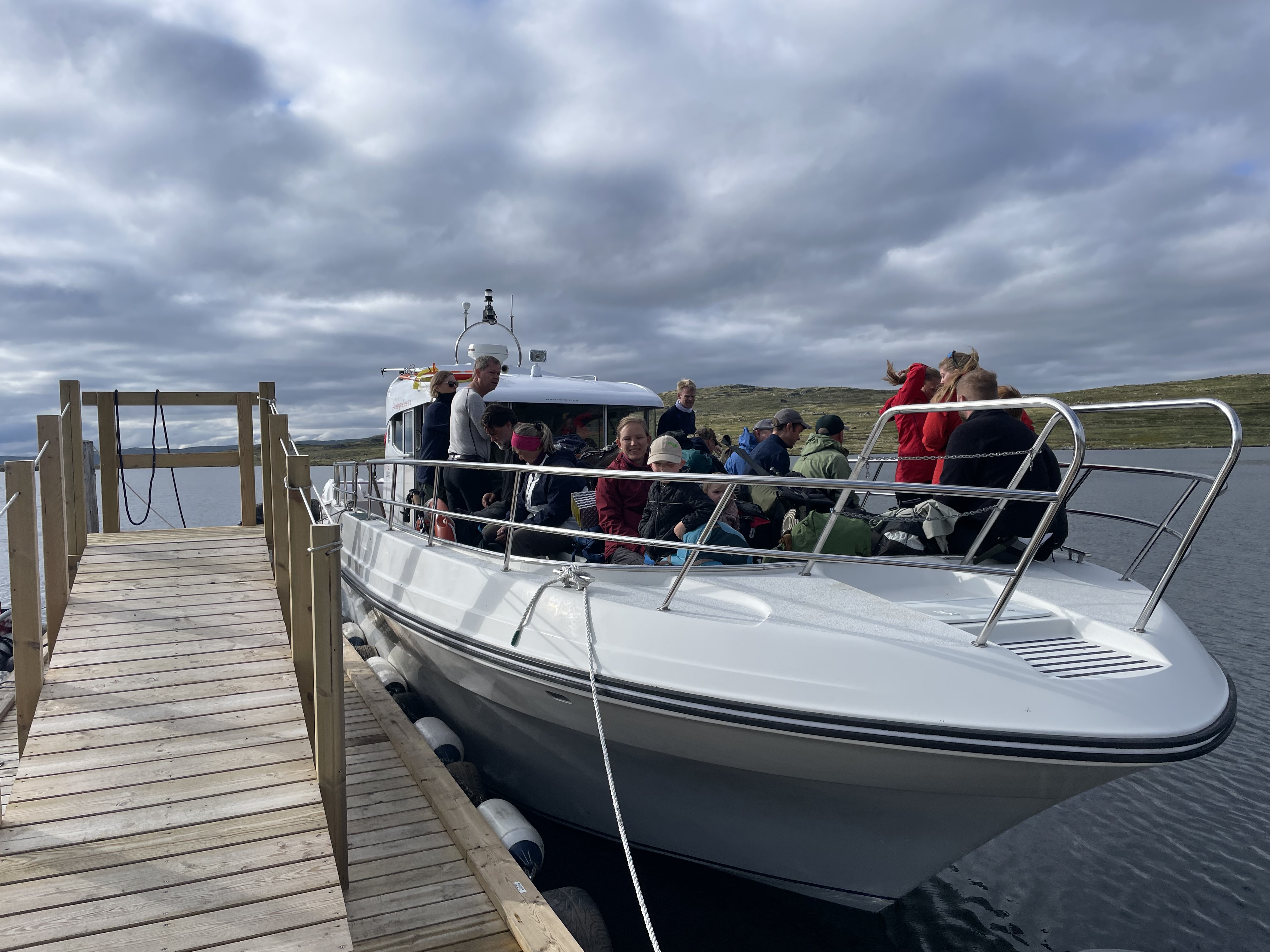 Vi endte desværre med at få ret travl. Vi havde egentlig aftalt at gå afsted mod båden kl. 8:30, men det nåede vi ikke. I en hektisk fart fik vi vasket op osv. inden Ida og børne gik mod båden kl. 8:45. Det var heldigvis ikke så langt fra hytten på. Mads derimod skulle lige aflevere nøglen og betale for parkering mens vi var væk. Det viste sig dog at være sværere end som så. Der holdt nemlig en skraldebil og spærrede for indkørslen til langtidsparkering. For at udnytte tiden ville Mads i stedet checke ud mens skraldebilen blev færdig, men manden i receptionen var åbenbart ude for at hjælpe skraldemændene med et eller andet. I sidste øjeblik lykkedes det dog, og kun 2 minutter inden afgang kom Mads løbende mod båden med bærerygsækken gyngende på ryggen.