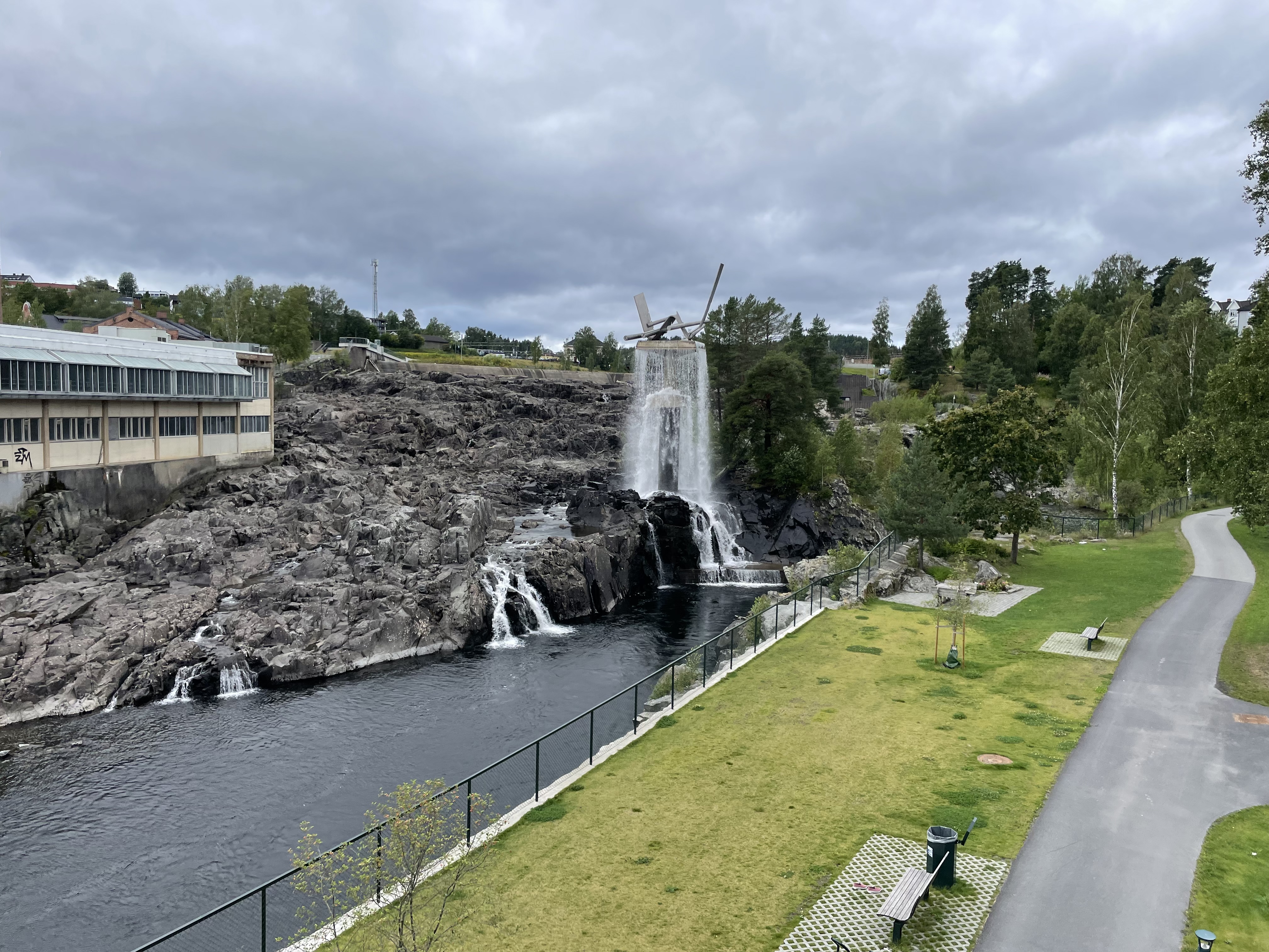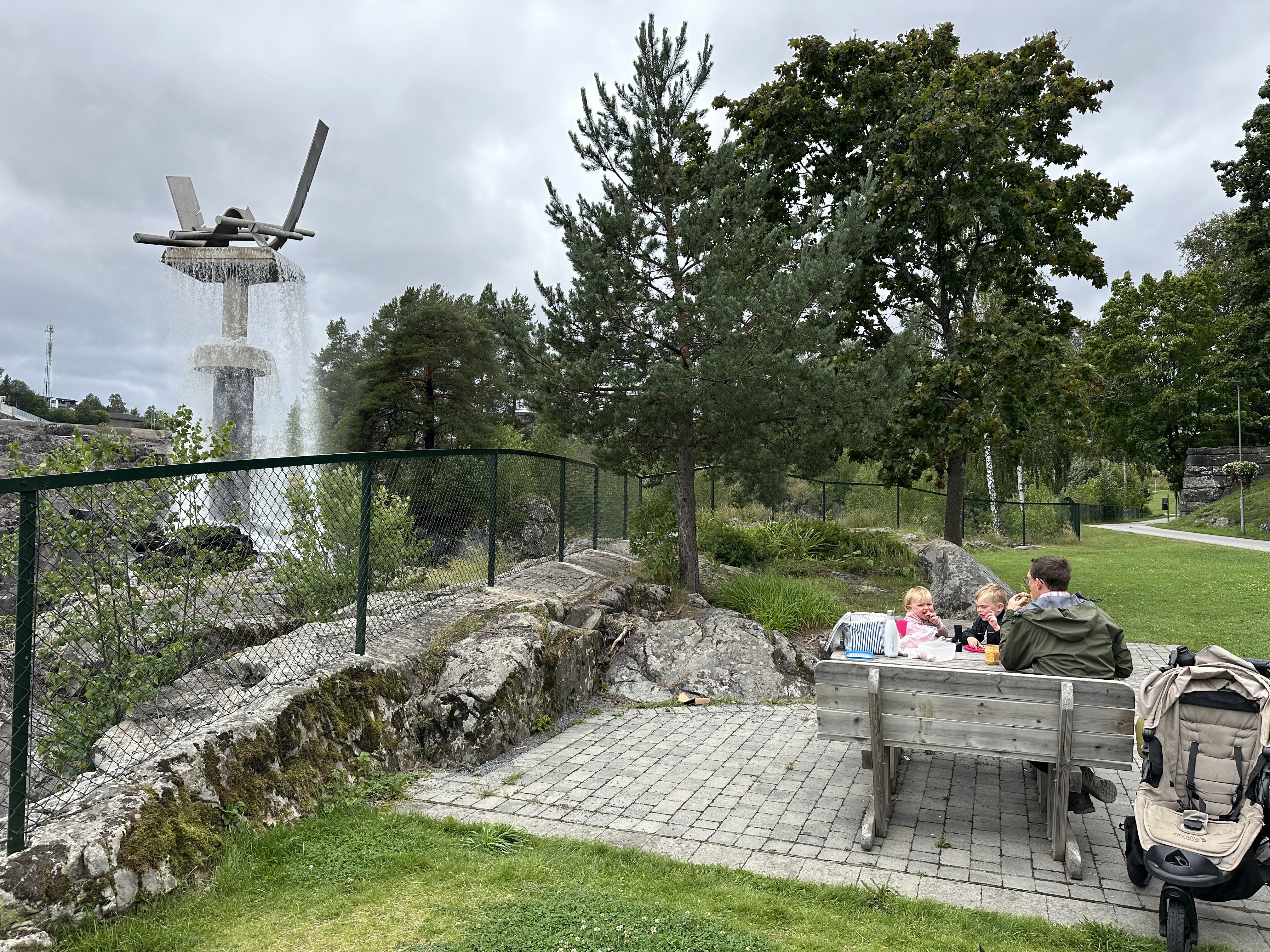 Det første der står på programmet er en tur ind til Hønefoss for at se deres varetegn - et springvand midt i vandfaldet - og en tur rundt i byen. Vi pakkede kampvognen klapvognen og gik ind til byen hvor vi fandt en legeplads hvor vi hang ud lidt tid. Efter at have oset gik vi tilbage til springvandet, hvor vi spise frokost. Hvad det næste skulle være var lige en tur i ø-råd, vi kunne nemlig enten køre til Kistenes kunstmuseum og se The Twist, eller køre til Hadeland Glassverk. Valget faldt på glaspusteriet. Da vi kom forbi Kistenes kunne Mads alligevel ikke dy sig for at stikke ind forbi og se hvor meget af museumsbygnignerne man kunne se fra vejen, men det var desværre ikke rigtig noget.