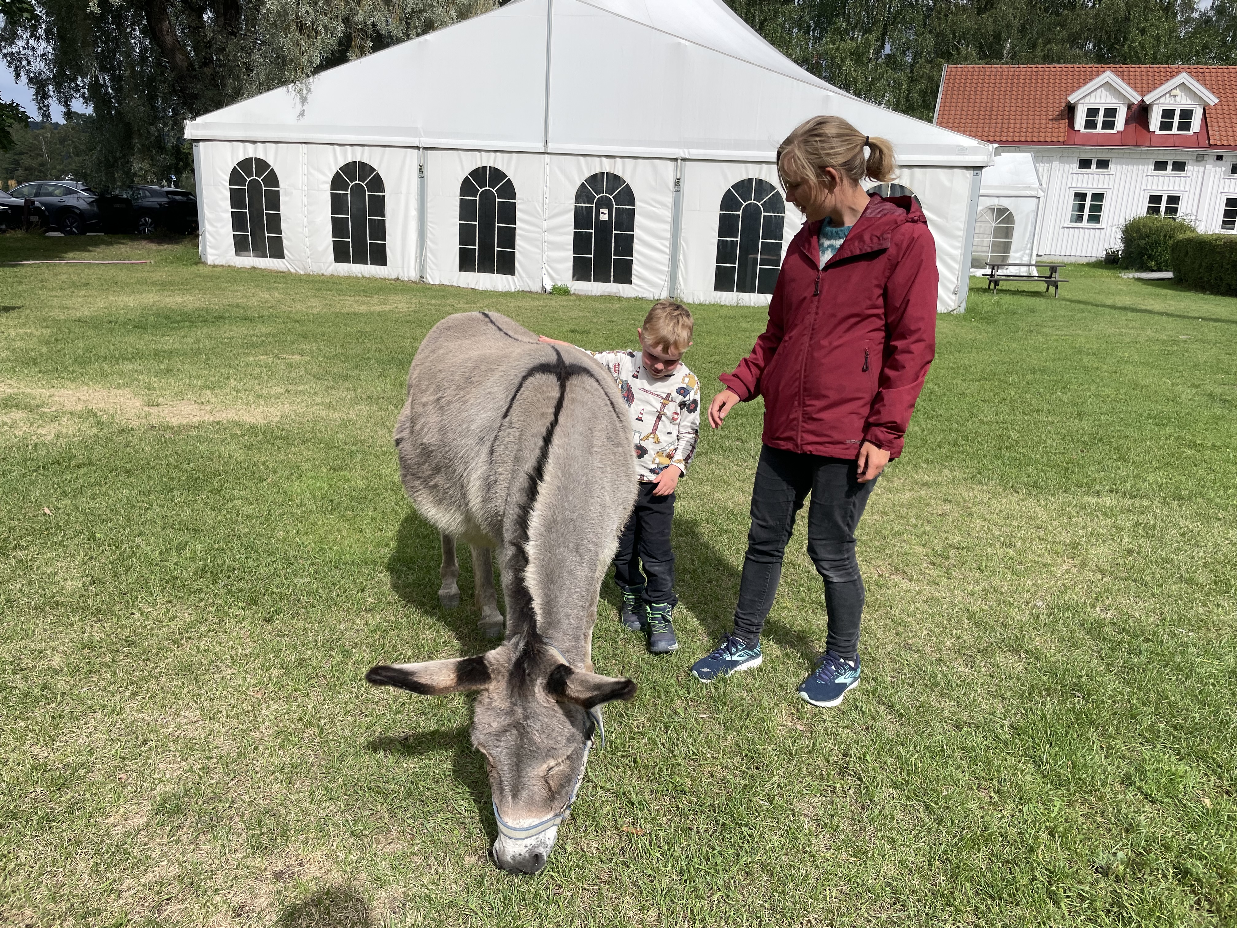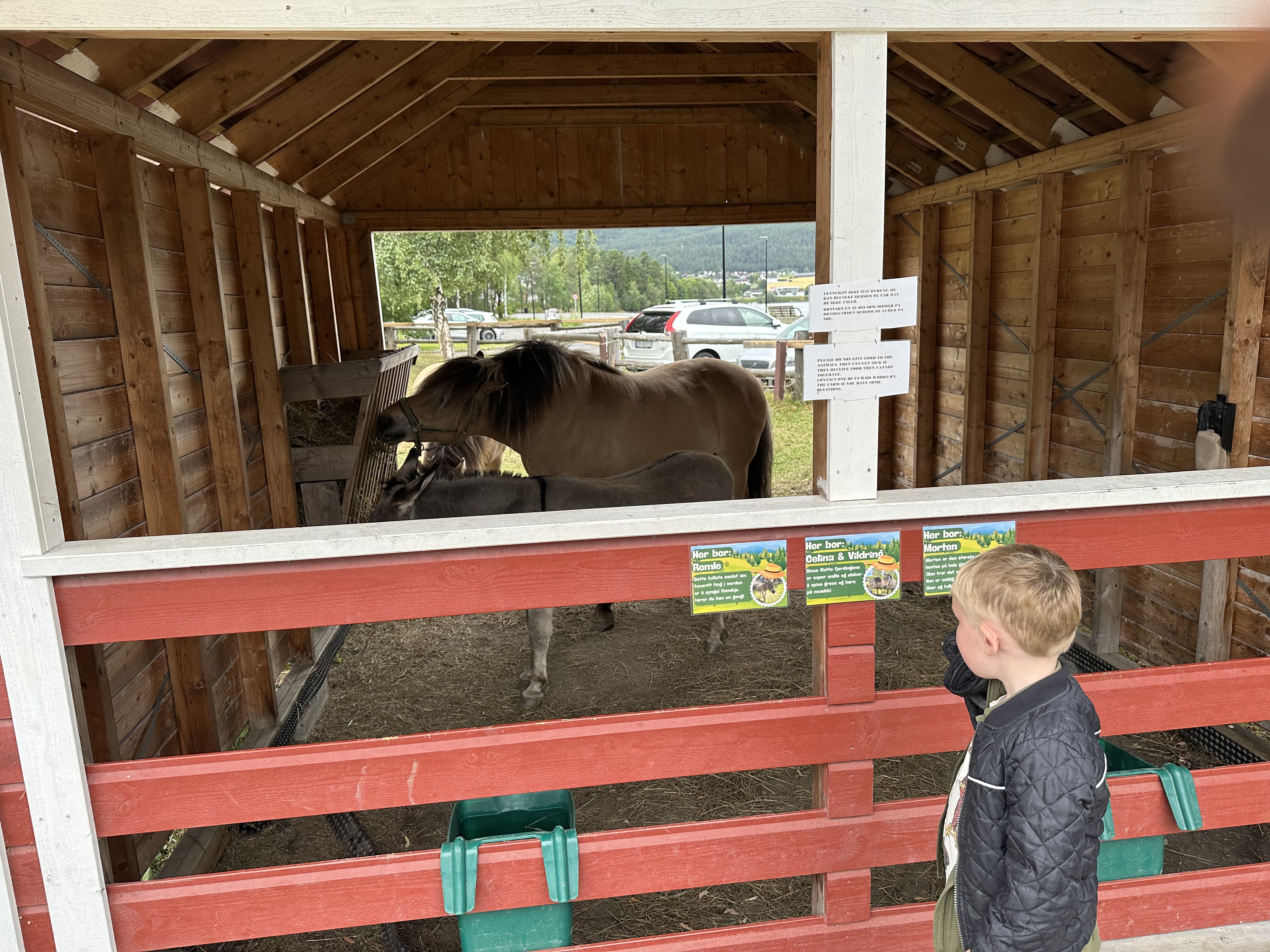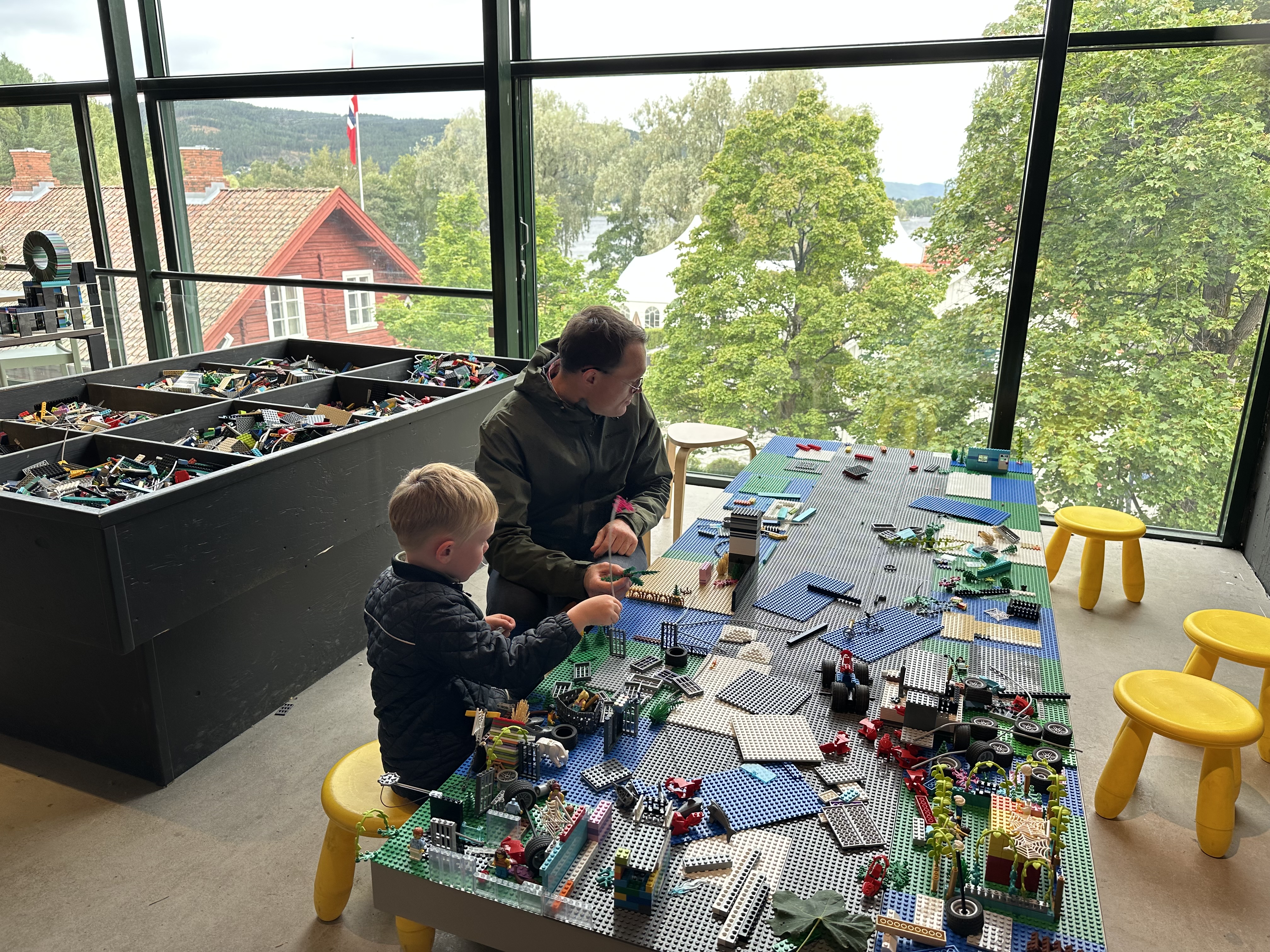 På glaspusteriet (som faktisk var en helt lille by) kunne man simpelthen lave og se så mange ting. Der var en lille bondegård med heste, grise, får og høns, og en mængde butikker med mad, glas og brugskunst. I en af bygningerne reklamerede de med byg-selv-lego, så trak Aksel sine forældre med ind (uden stor modstand). Det viste sig at være midt i en kunstudstilling for yngre norske kunstnere, så mens Aksel byggede med lego gik vi voksne på skift rundt i udstillingen. Astrid var faldet i søvn på vejen og lå og sov i klapvognen.
