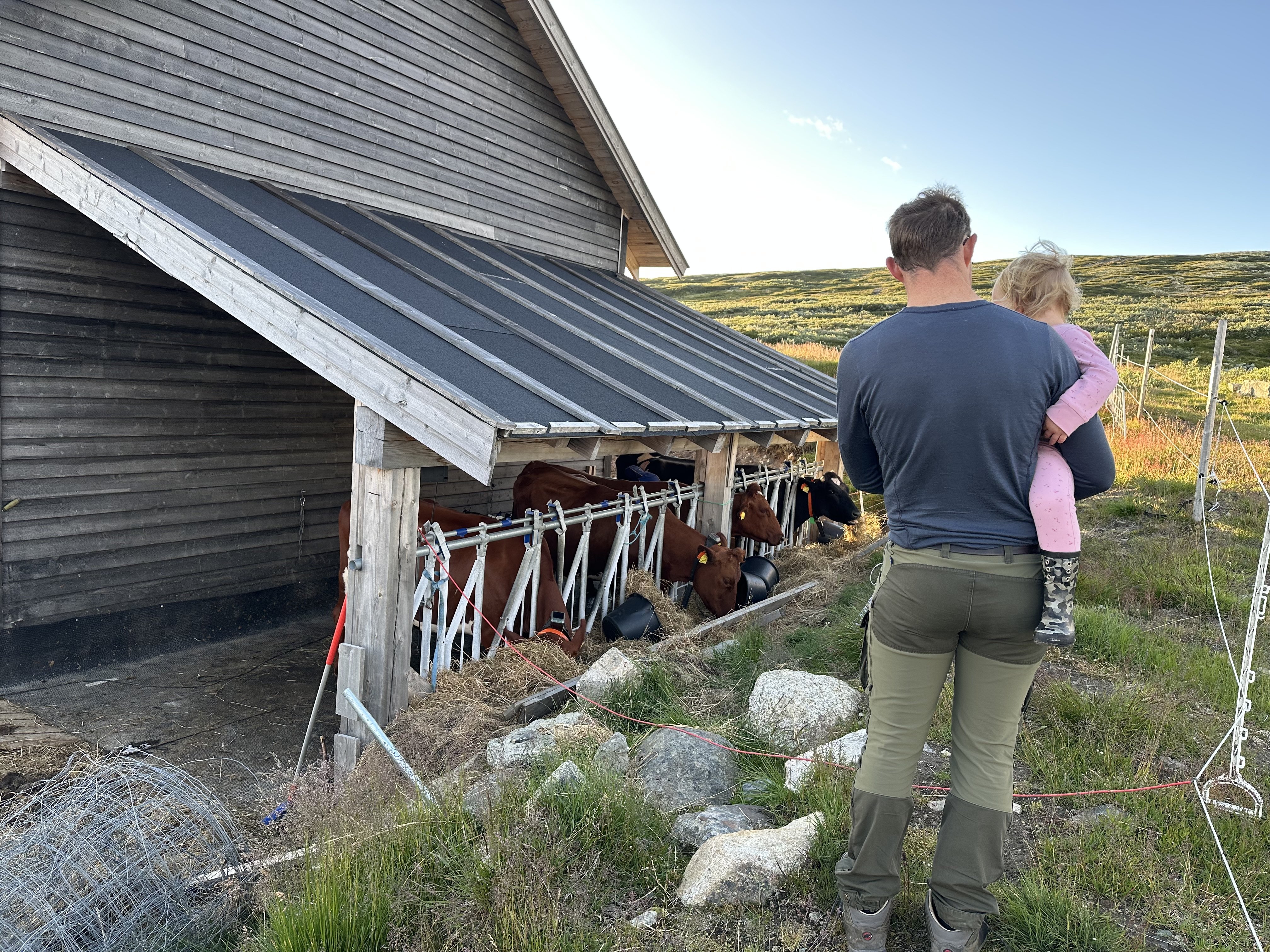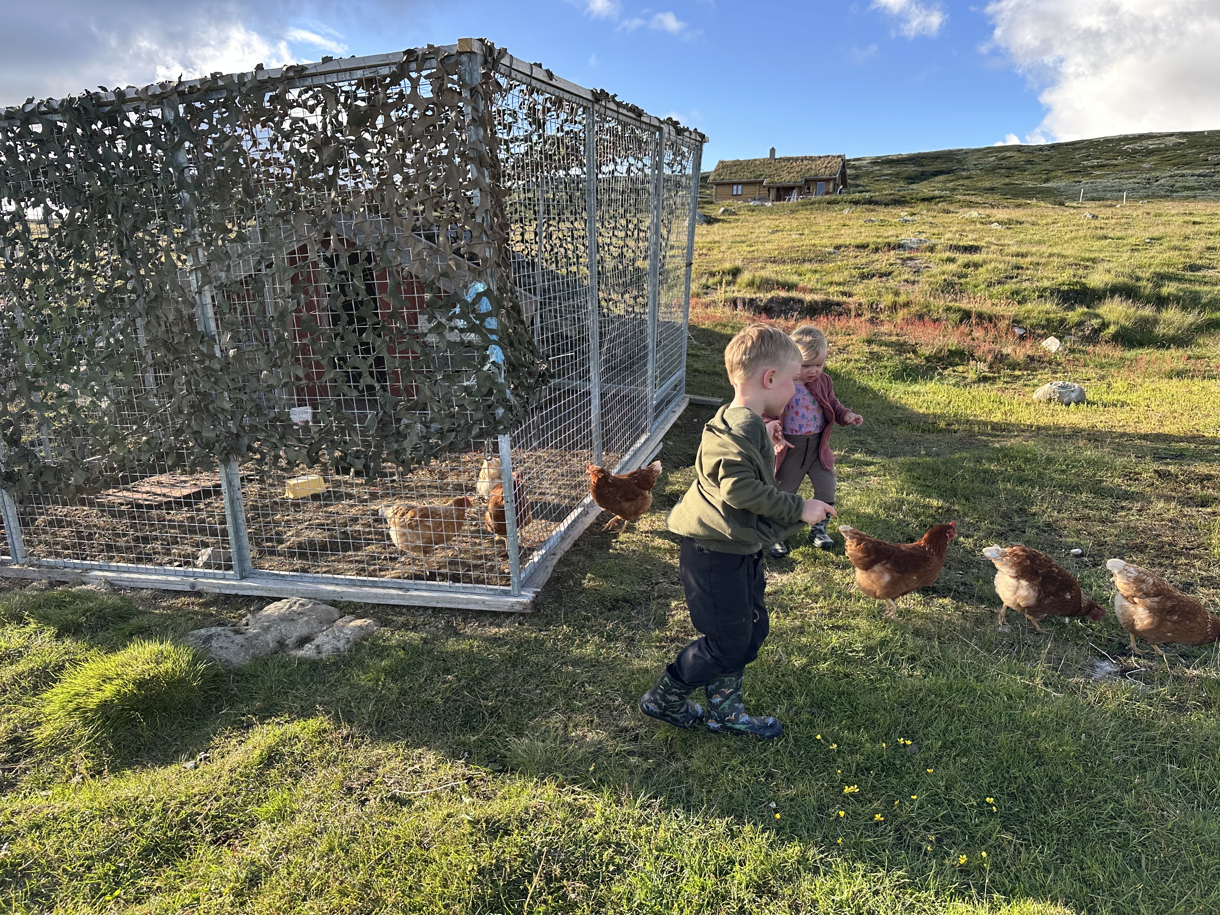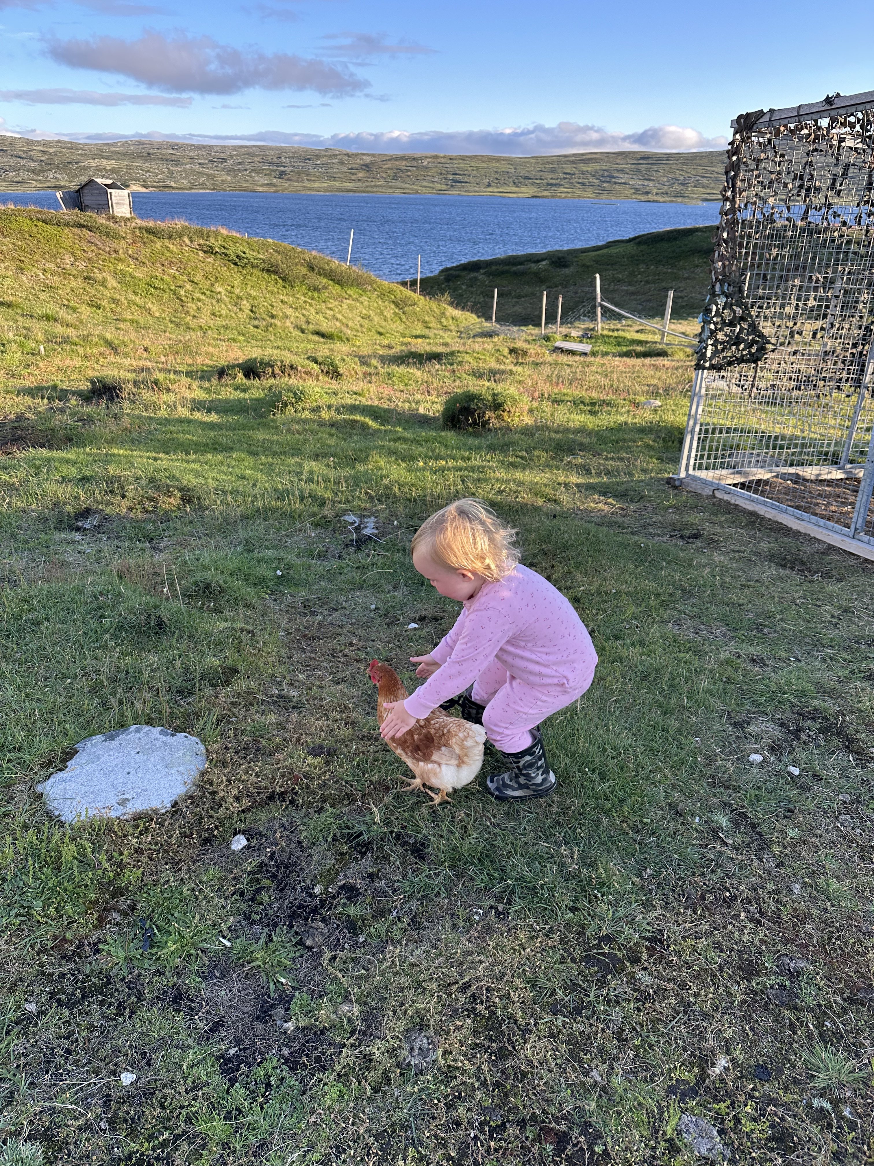 Astrid sov en meget lang lur på værelset, og da klokken var 4 måtte vi simpelthen vække hende. Heldigvis var det klaret op i sidst på eftermiddagen, og nu kunne vi rigtig så hilst på de mange dyr: grisene, køer og høns. Aksel og Astrid ville rigtig gerne fange hønsene og holde dem. Det krævede lige lidt øvelse af holde på dem, så de ikke blafrede med vingerne. Derudover legede vi gemmeleg i sletten ved siden hytten. Der var faktisk overraskende mange gode gemmesteder ude i ”ingenting”.