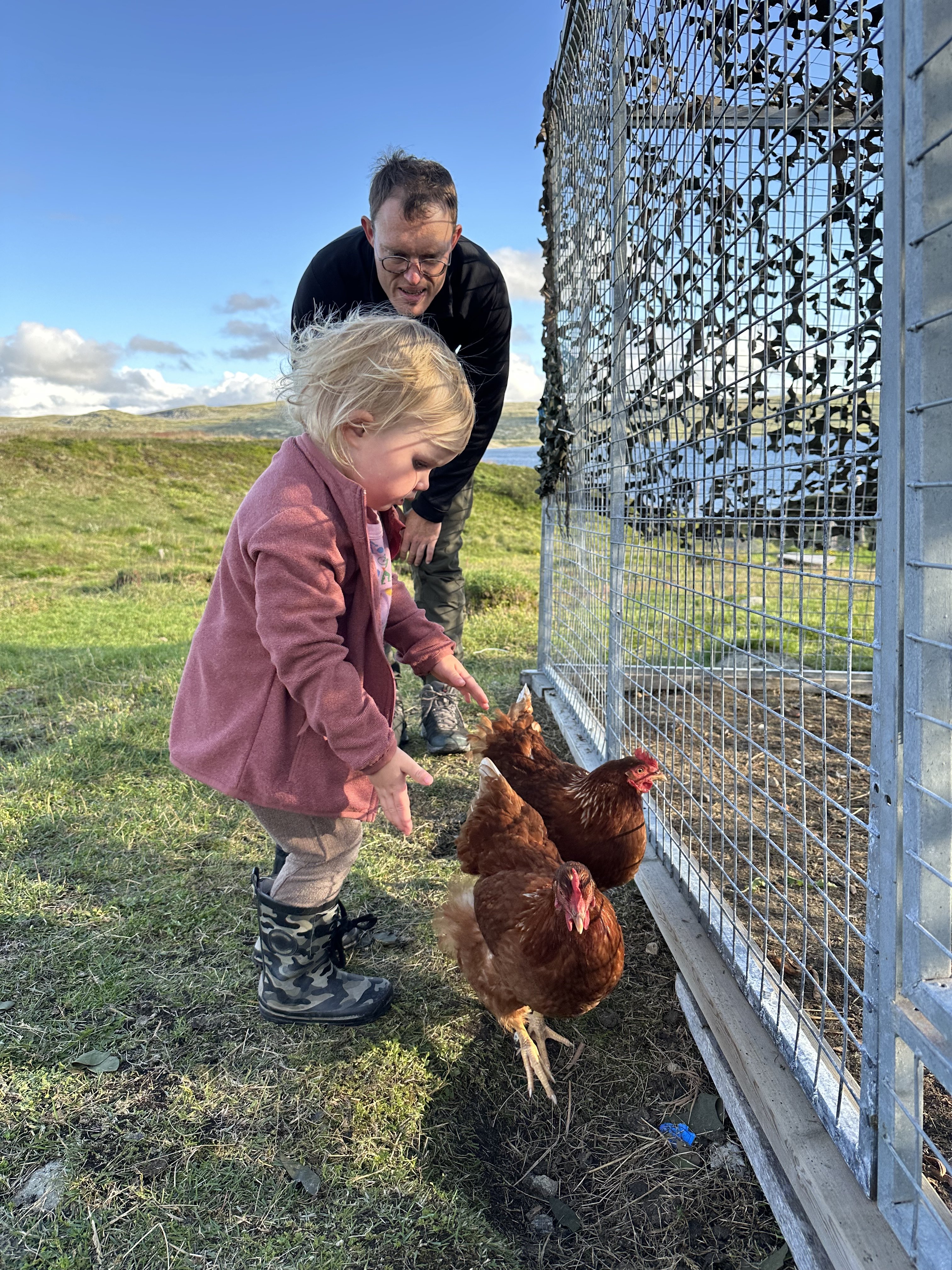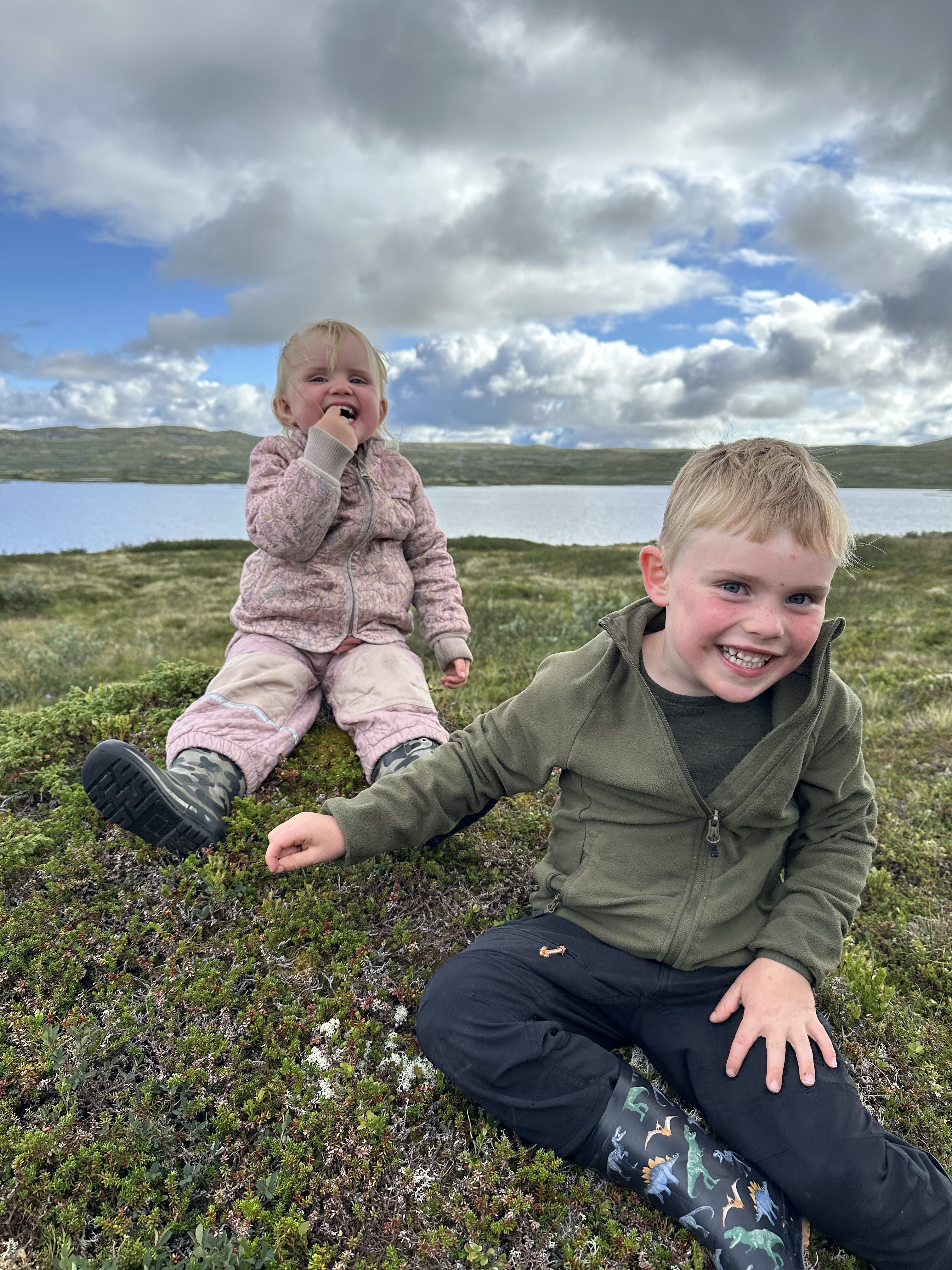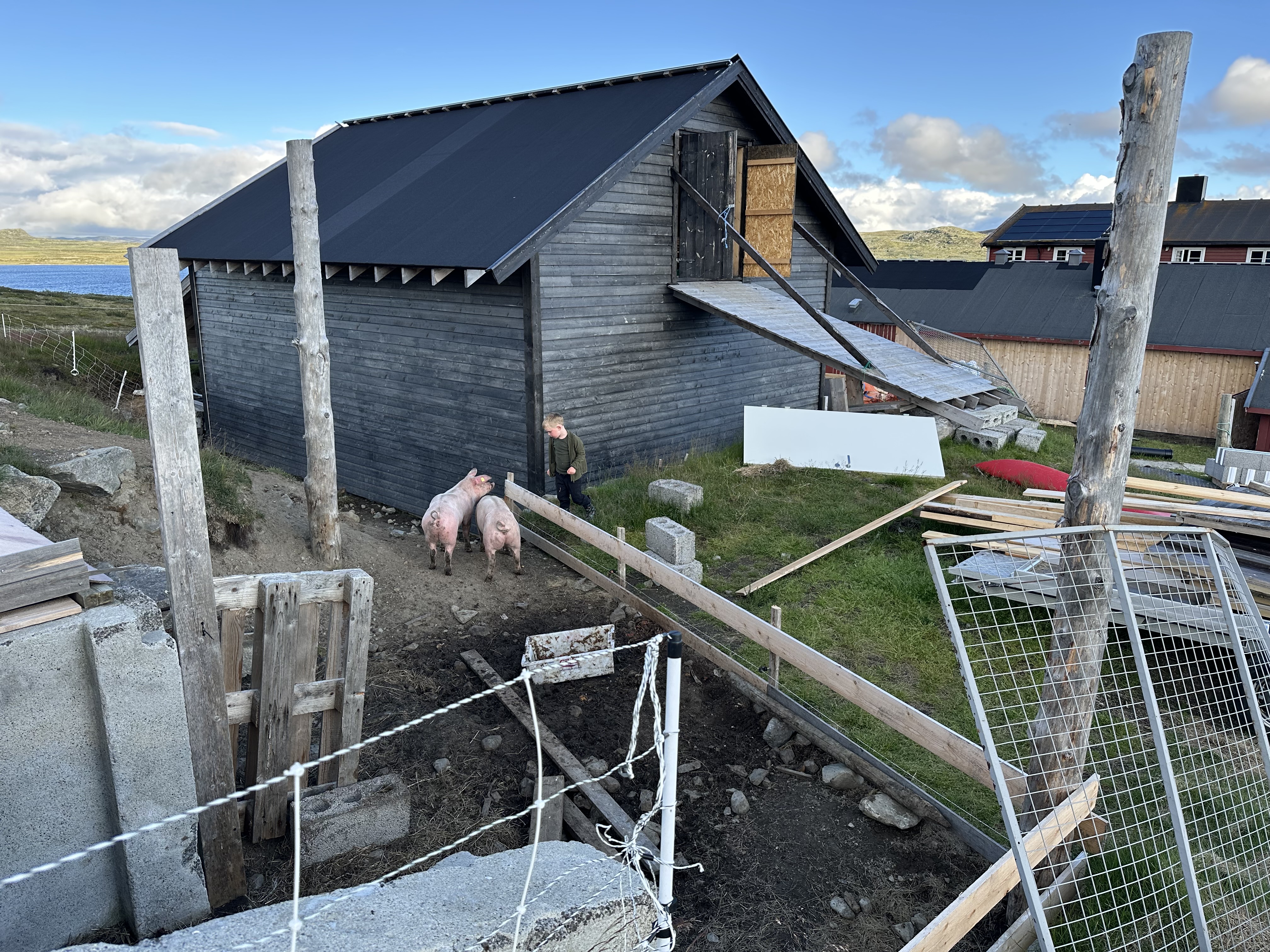 Astrid sov en meget lang lur på værelset, og da klokken var 4 måtte vi simpelthen vække hende. Heldigvis var det klaret op i sidst på eftermiddagen, og nu kunne vi rigtig så hilst på de mange dyr: grisene, køer og høns. Aksel og Astrid ville rigtig gerne fange hønsene og holde dem. Det krævede lige lidt øvelse af holde på dem, så de ikke blafrede med vingerne. Derudover legede vi gemmeleg i sletten ved siden hytten. Der var faktisk overraskende mange gode gemmesteder ude i ”ingenting”.