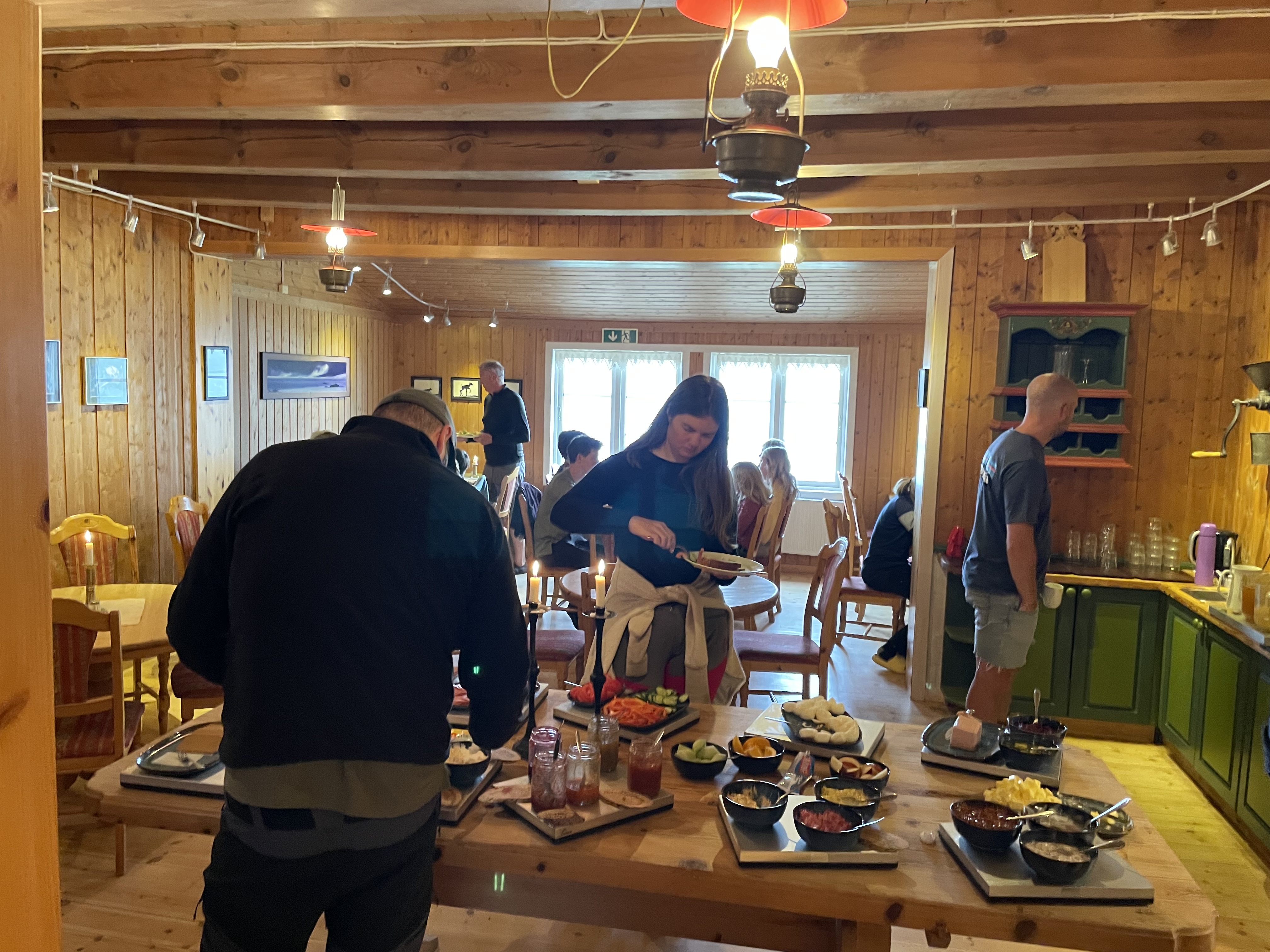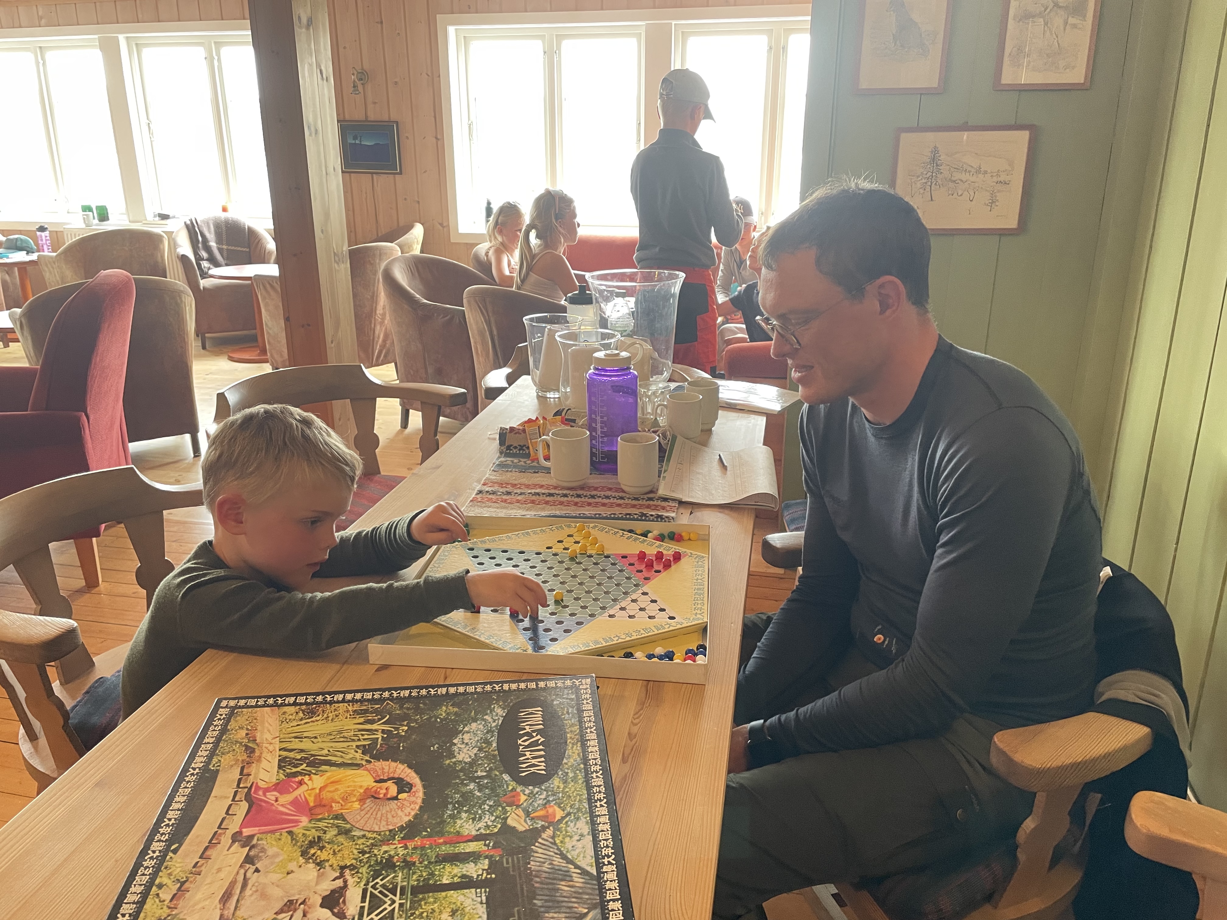I dag var der intet på programmet. Efter den gode morgenmad, skulle vi bare hygge os, se dyrene og spille en masse spil. Vi havde egentlig planlagt at sejle en tur i deres kano, men vejret var simpelthen ikke til det. Så mens det regnede og vinden ruskede udenfor, fik vi tiden til at gå med de medbragte opgavebøger, diverse spil, bøger og kryds og tværs. Desværre manglede reglerne eller nogle af spillebrikkerne i flere af stedets spil, men Aksel synes nu alligevel det var spændende at gå på opdagelse i de forskellige spil de havde på stedet. Vi var også lidt ude trods det kedelige vejr, og fik spiste vores madpakker i et vindstille hjørne.