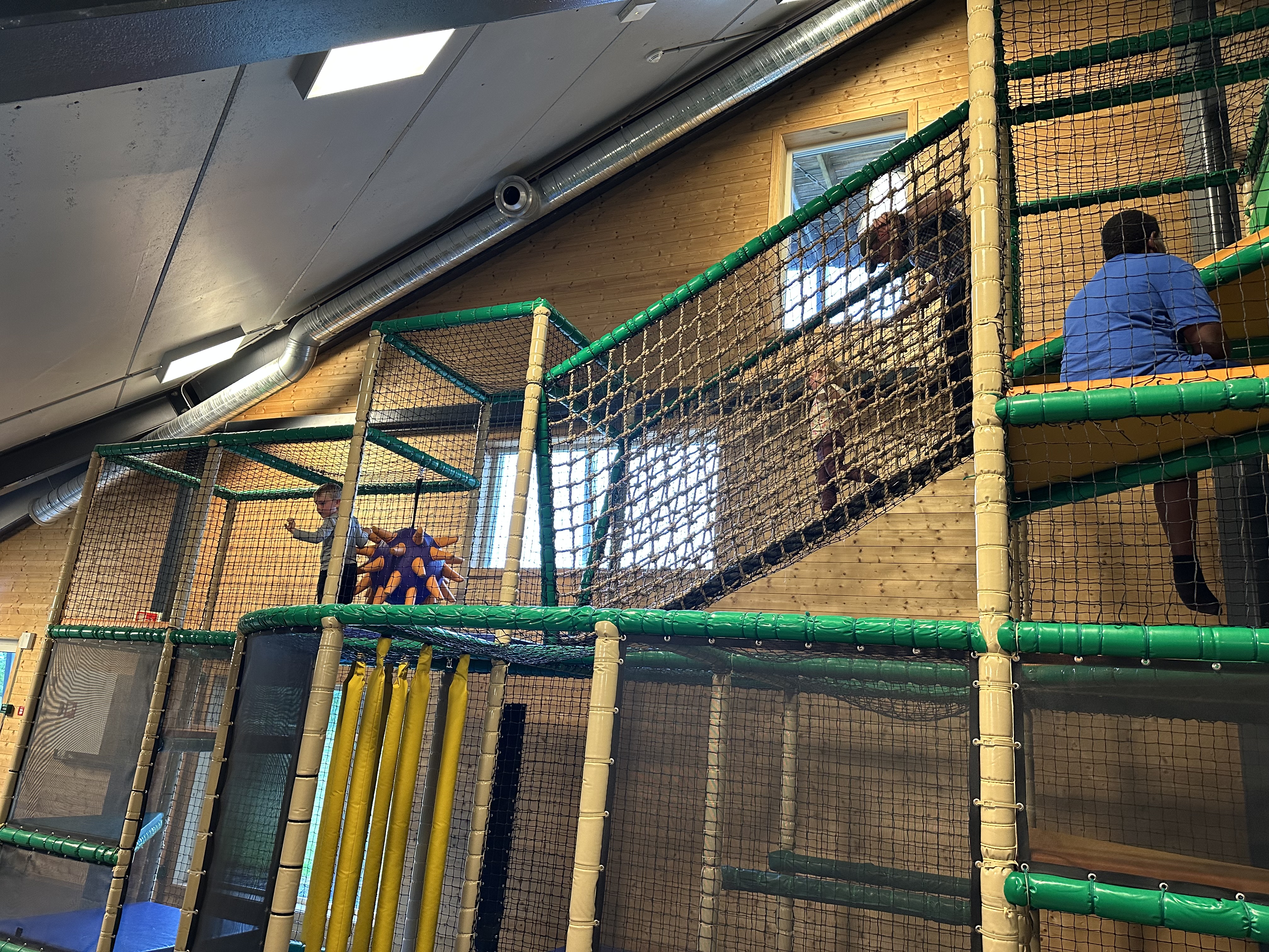 For at moderen også skulle forblive mild og god stoppede vi ved de antik/genbrugsbutikker der lå ud til vejen og som vi havde set på vejen ud. Fremme ved topcamp fandt vi ud af at man altså skulle være en my højere end Aksel for at klatre (>110 cm), men det gjorde ikke noget, for så kunne vi gå i legeland i stedet. Astrid var for lille; vi tog en kort tur rundt sammen med en voksen, og så gik mor og Astrid ellers ud for at få en is og hoppe på hoppepude. Aksel og far blev i legelandet lidt og Aksel fik tonset rundt. Han blev ikke snydt for en is bagefter. Vi så de store børn klatre på klatrebanen inden vi kørte hjem.
