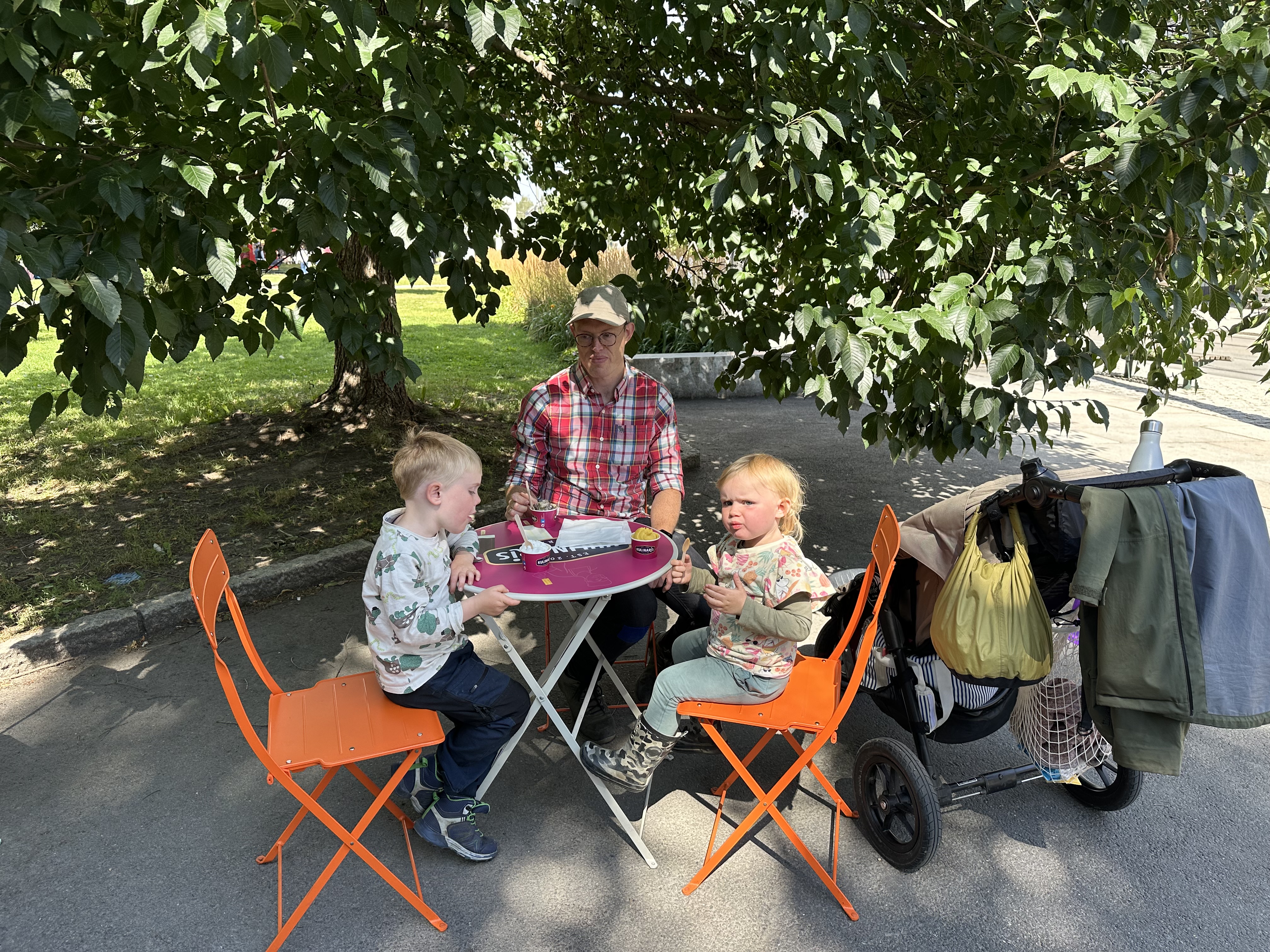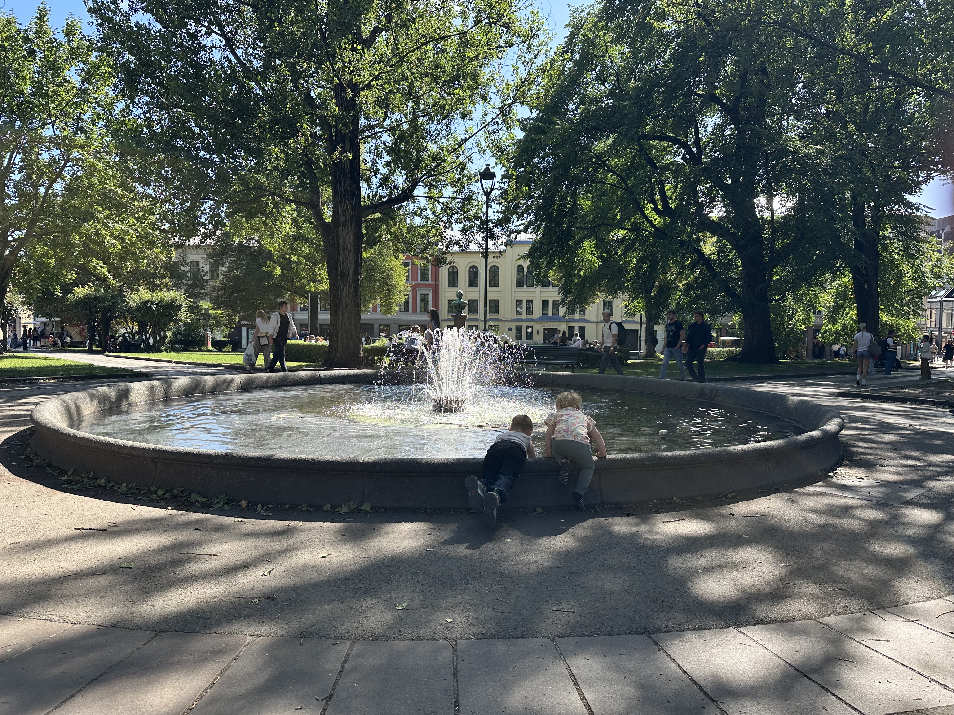 Hjemrejsedag. I dag skal vi fra Klækken til Oslo, hvorfra vi skal med færgen til København klokken 16.30 i dag. Endnu en times køretid, denne gang med det noget udefinerede mål Oslo centrum. Det er planen at vi i dag skal ose i Oslo og lege på legepladser. Første skridt er dog lige at få noget at spise; morgenmadsbuffet på hotellet. Sikke et cirkus det er at spise med vores to unger på sådan en buffet. Den kommer ikke helt op på gårsdagens niveau, men der var da pølser, så Astrid var glad (i hvert fald noget af tiden). Puha, man får også nemt spist for meget.