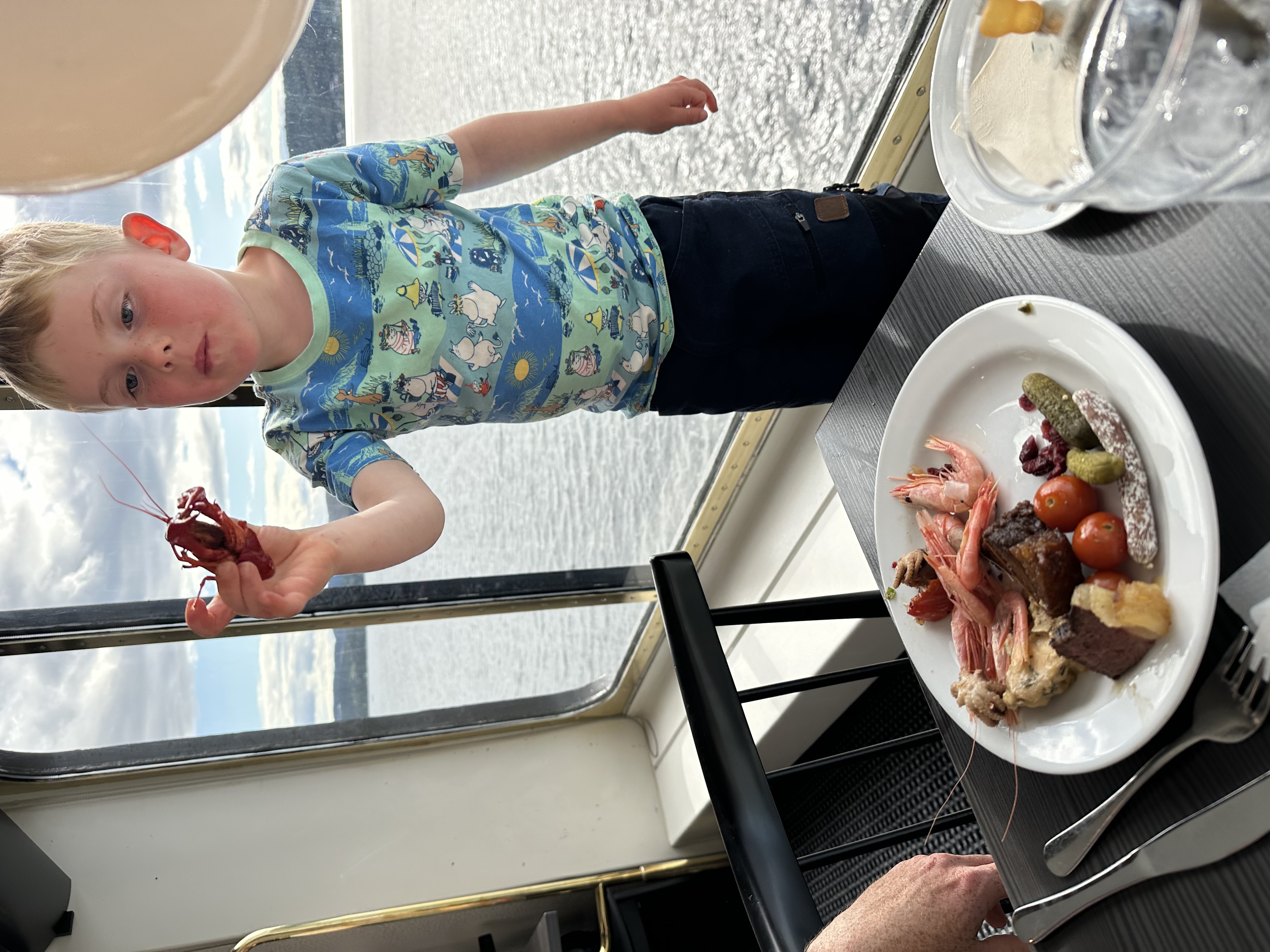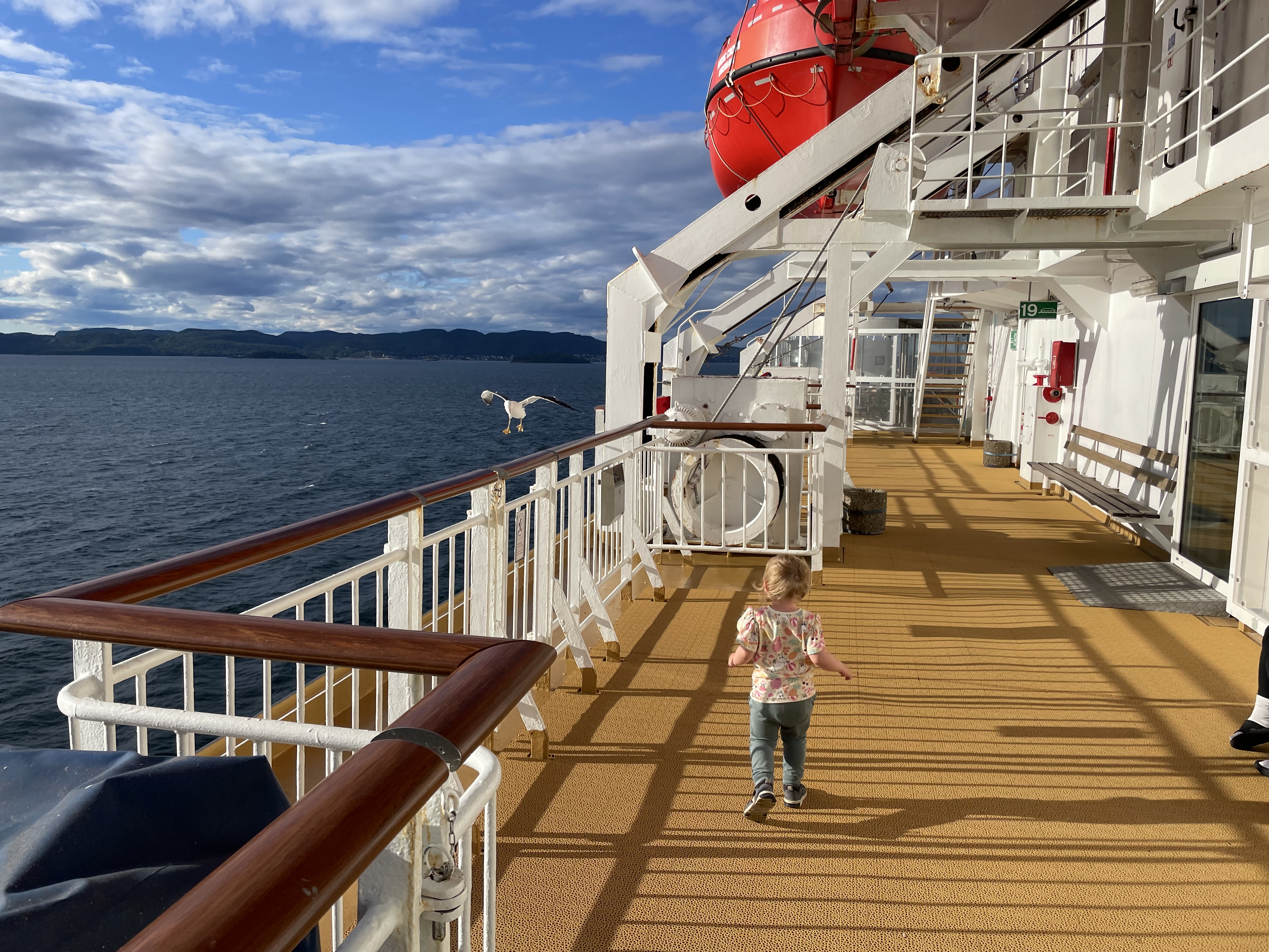 Vi kørte til færgen omkring klokken 15, hvor vi kom ombord næsten med det samme. Vores kahyt var denne gang en inderside-kahyt, så uden ko-øje, men det var okay. Vi havde booket en 3-personers kahyt, men der var fint med gulvplads til at Astrid kunne ligge der og sove på vores medbragte madras. Det var en noget finere kahyt end den på færgen fra Hirtshals til Bergen! Lige tæt på vores kahyt lå børneområdet og dét syntes ungerne var kanon. Man kunne lave opgavebøger og lege i deres legeområde. Stort hit.