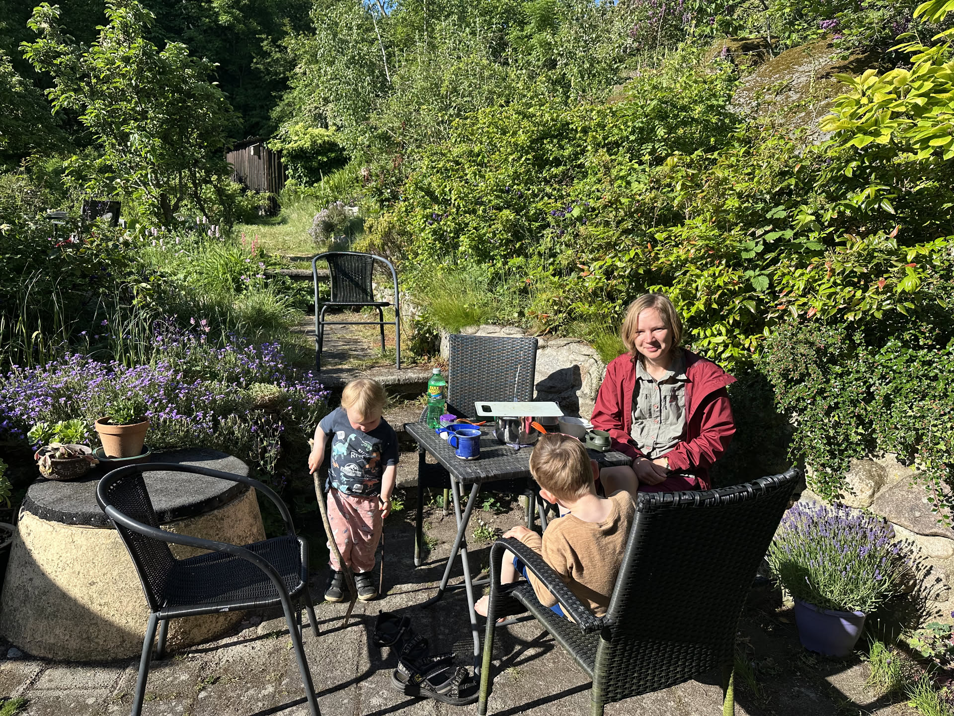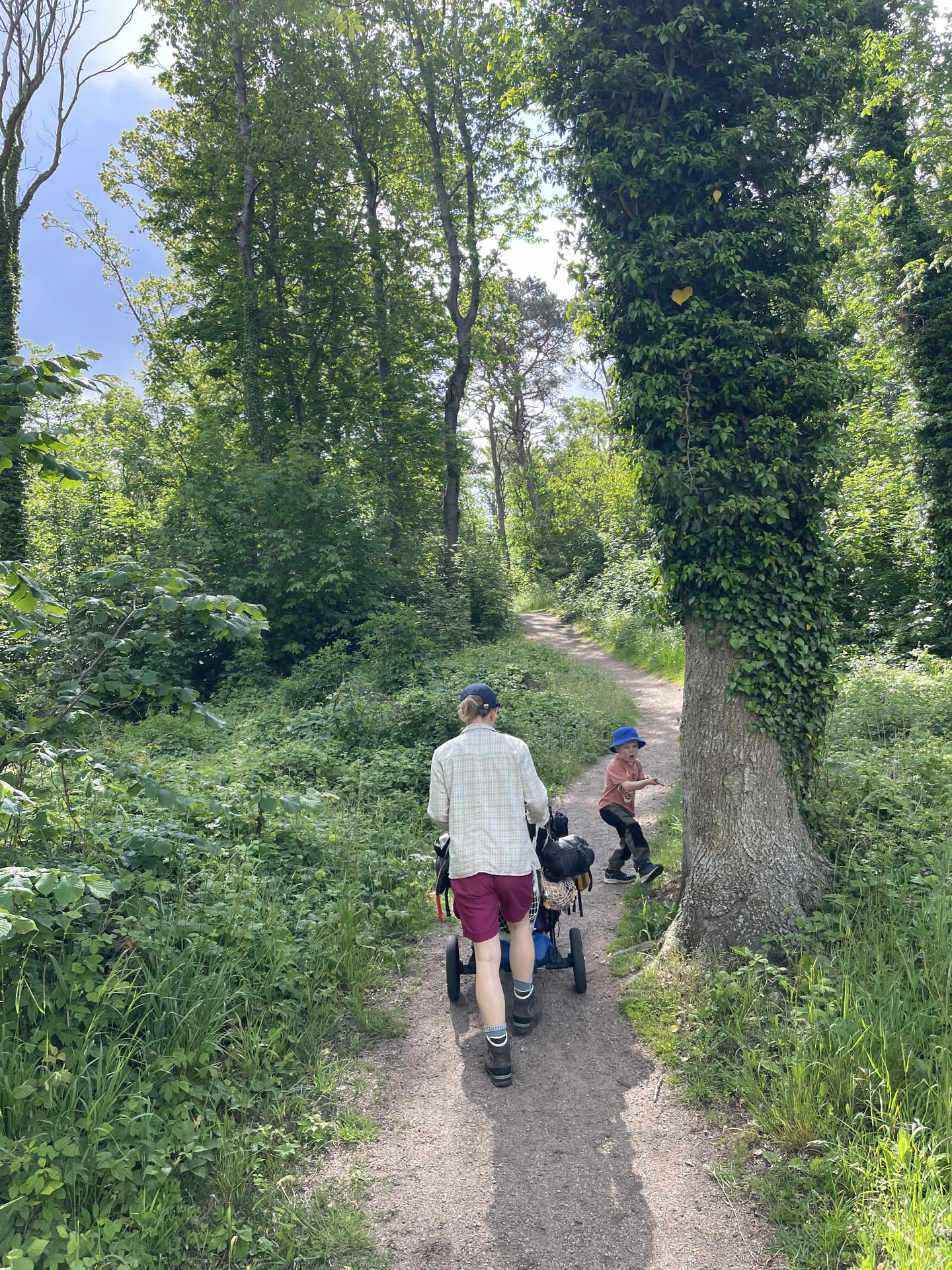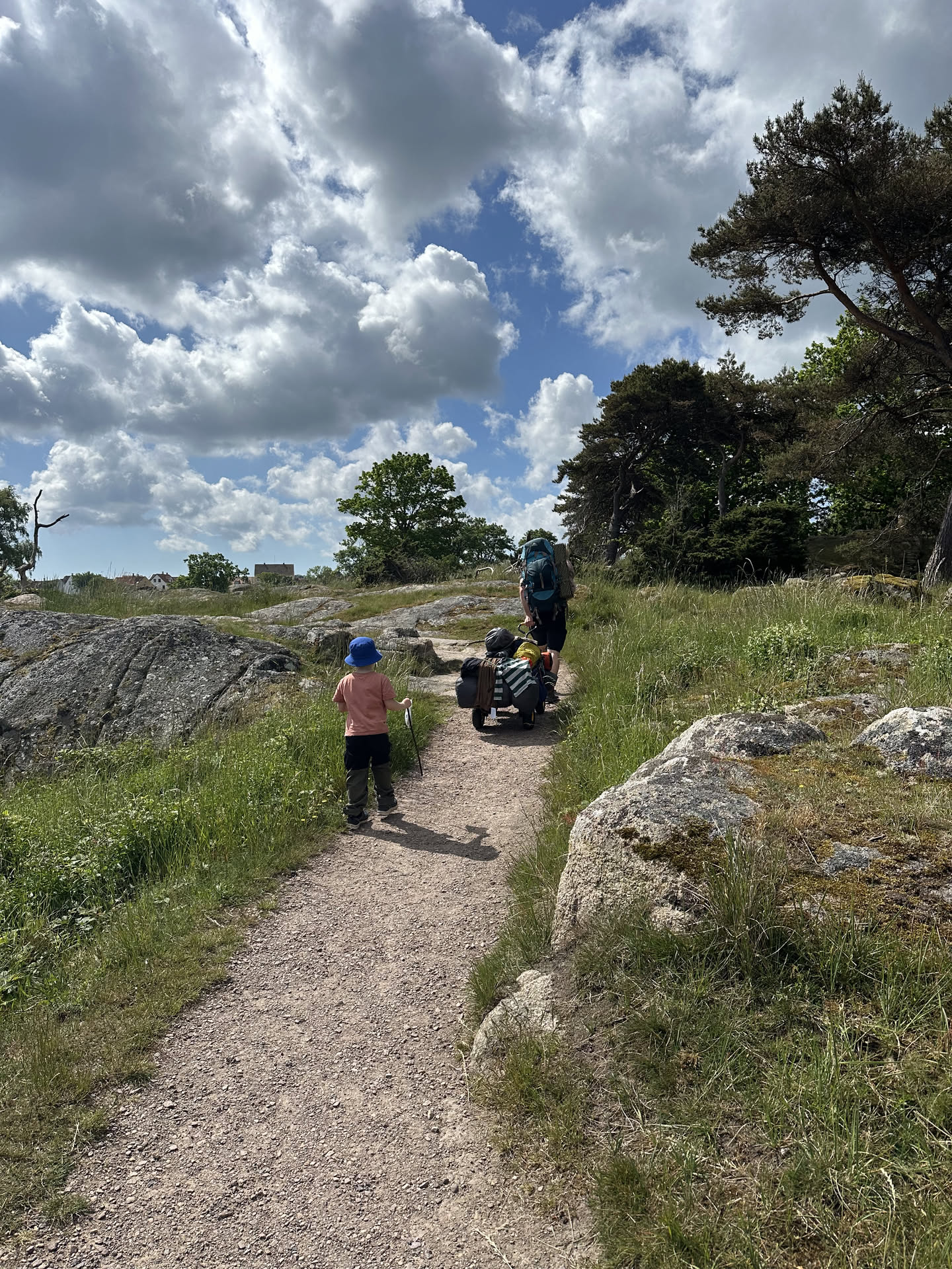 Om morgenen mens børnene stadig sov, fik vi pakket det meste udstyr ned. Vi spiste morgenmad på terrassen og var videre på kystien klokken 9.30 endnu engang, på trods af ihærdige forsøg på at komme tidligere afsted. Vi fulgte kyststien til Svaneke efter et langt stop på en legeplads. Det var en fin og lidt udfordrende tur. Aksel gik hele vejen selv. I Svaneke spiste vi en formiddagsis og handlede lidt til frokost og aftensmad, inden vi gik videre til Hullehavn Camping hvor vi spiste frokost. Fra campingpladsen gik vi ad cykelstien til Aarsdale, da vi af to mænd som gik ad kysstien i modsatte retning, havde hørt at denne del af stien var meget klippefyldt. Astrid sov og vi gik i rask fart.