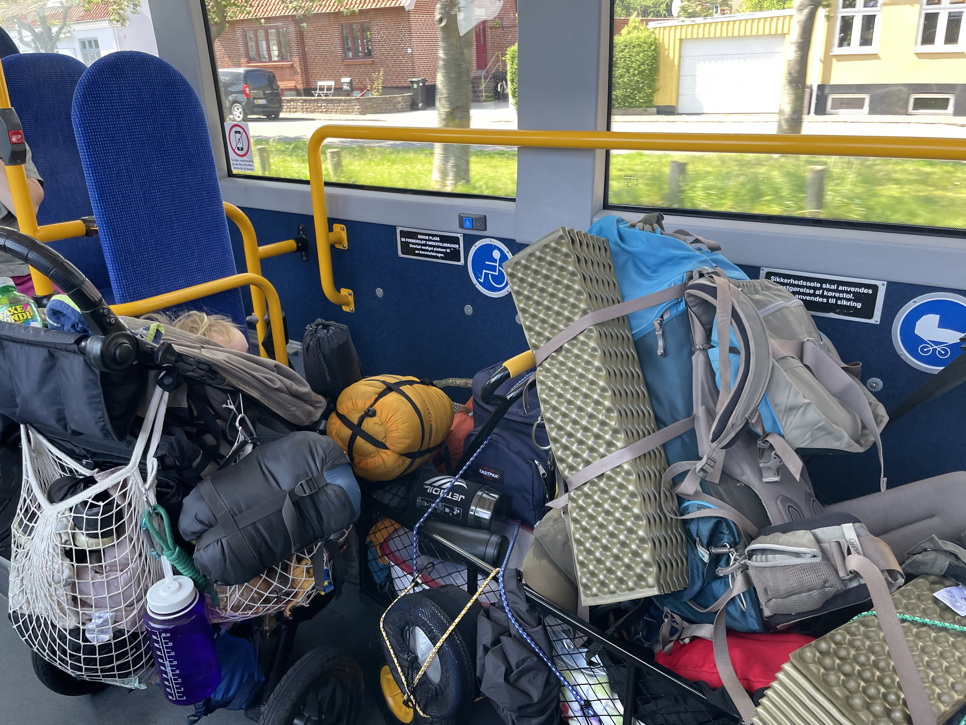 Turen til Hasle var forholdsvis nem, selv på sådan en halvflad damecykel, omend lidt ensformig. Fremme ved campingpladsen stod trækvognen hvor vi havde efterladt den, sammen med den rygsæk vi også havde købt i vores panik. Det var nu ret heldigt, for vi havde egentlig planlagt at vognen skulle spændes fast på cyklen med en masse spændestropper, men mens vi havde været væk var vognen vist skrumpet lidt i vores bevidsthed. I virkeligheden var den aaaalt for stor til at hænge på cyklen. Rygsækken, derimod, var faktisk stor nok til vognen, så vognen kom på ryggen og så gik det ellers tilbage igen.