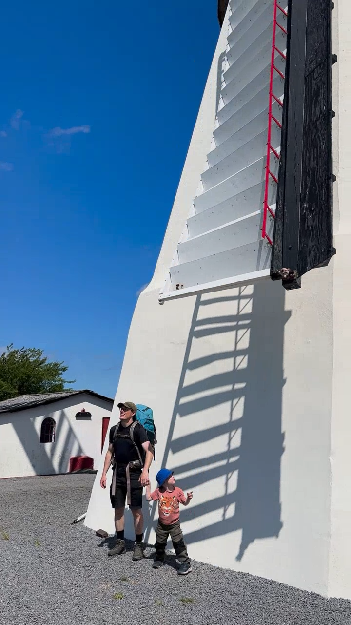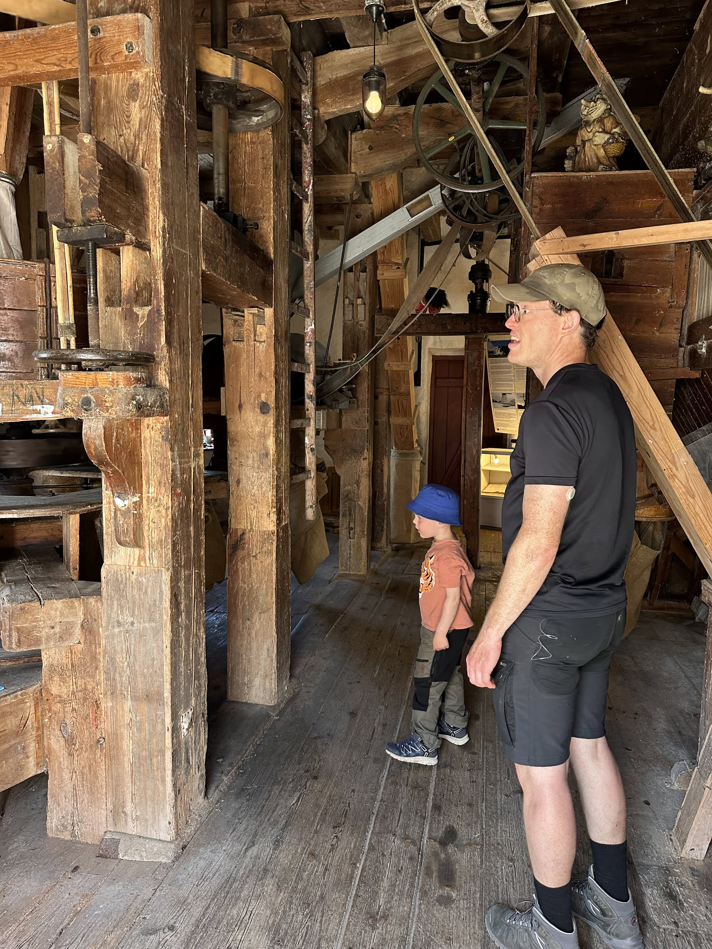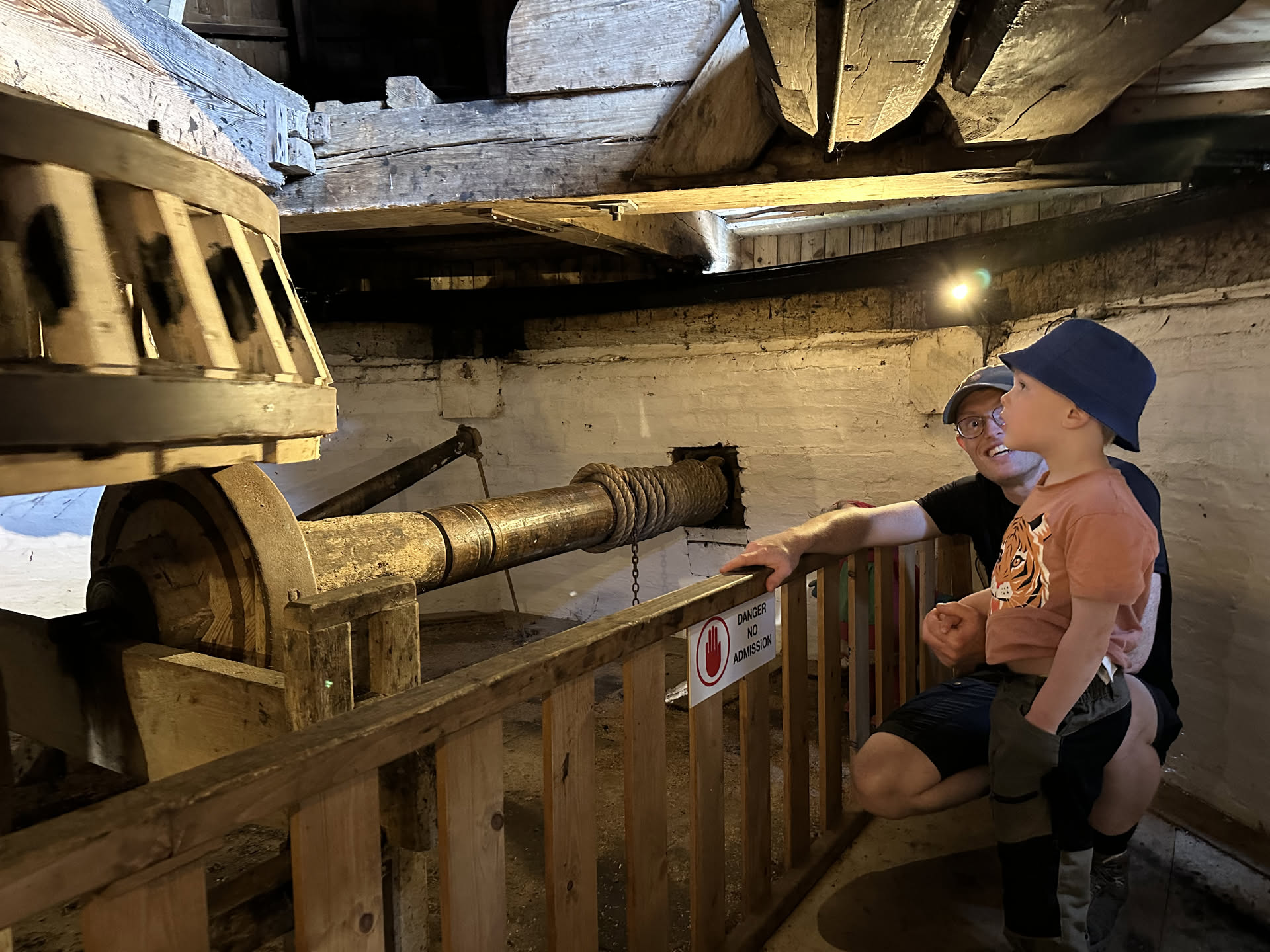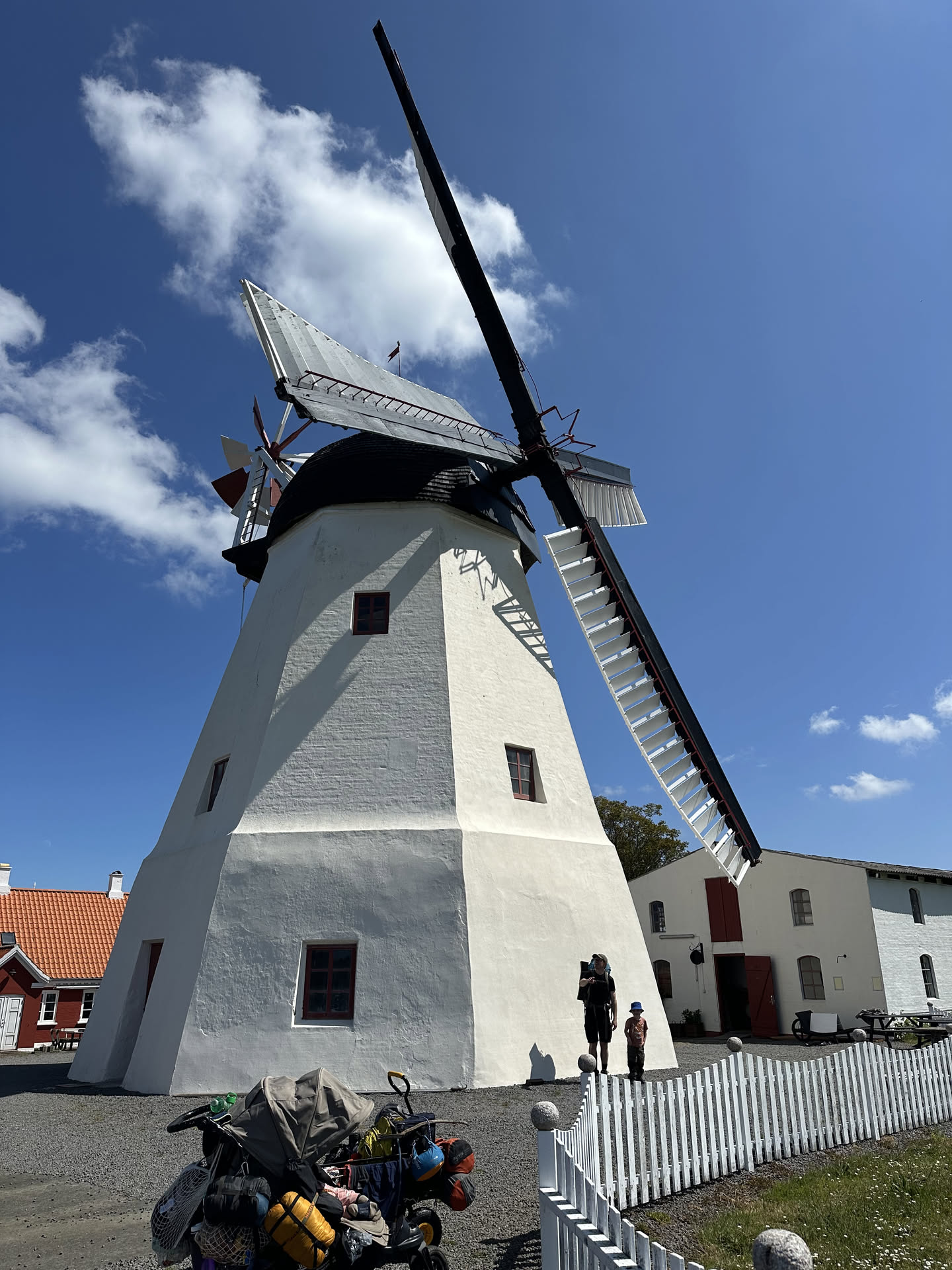 I Aarsdale, som i øvrigt er. en meget charmerende by, så vi en gammel mølle hvis vinger drejede rundt. Det opdagede Aksel og vi blev alle forundrede, for det kunne vi ikke huske at have set før. Vi gik op til møllen og her mødte vi en ung mand som fortalte hvordan møllen virkede. Han viste os hvordan man med et snoretræk kunne åbne og lukke for vingernes klapper så man kunne styre hvor hurtigt vingerne drejer rundt. I møllen, der er fra 1876, har man lavet mel helt frem til 2003! Nu er det et museum og vi kunne forstå at det kræver utroligt meget vedligehold at holde en mølle igang, da den hurtigt bliver fyldt med vand når den ikke drejer rundt. Det var helt fantastisk at være inde i møllen mens vingerne drejede og mærke hvordan det hele rystede og knagede. Det var som om, at det kun var de store mure der fik konstruktionen til at blive stående.