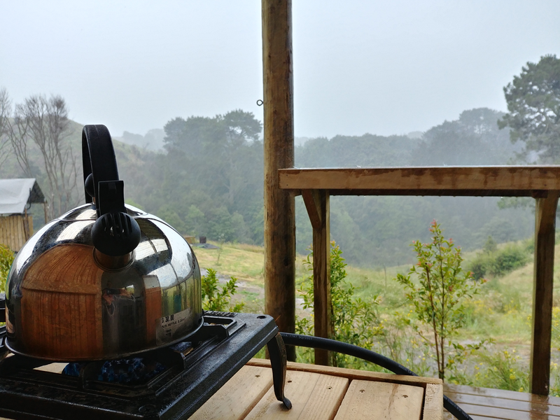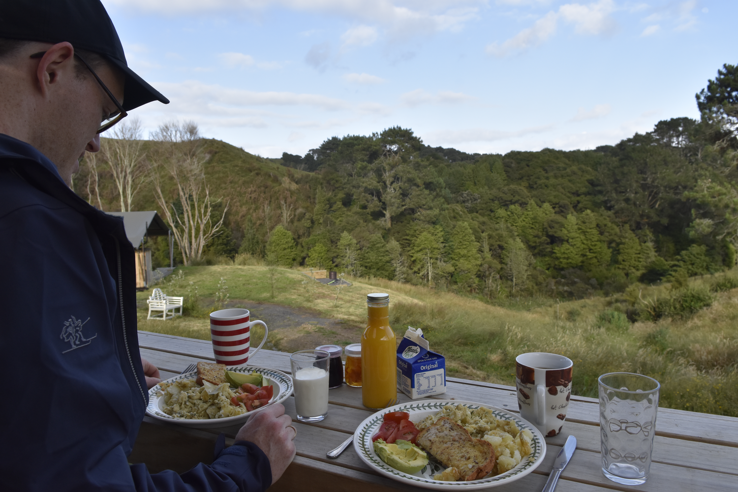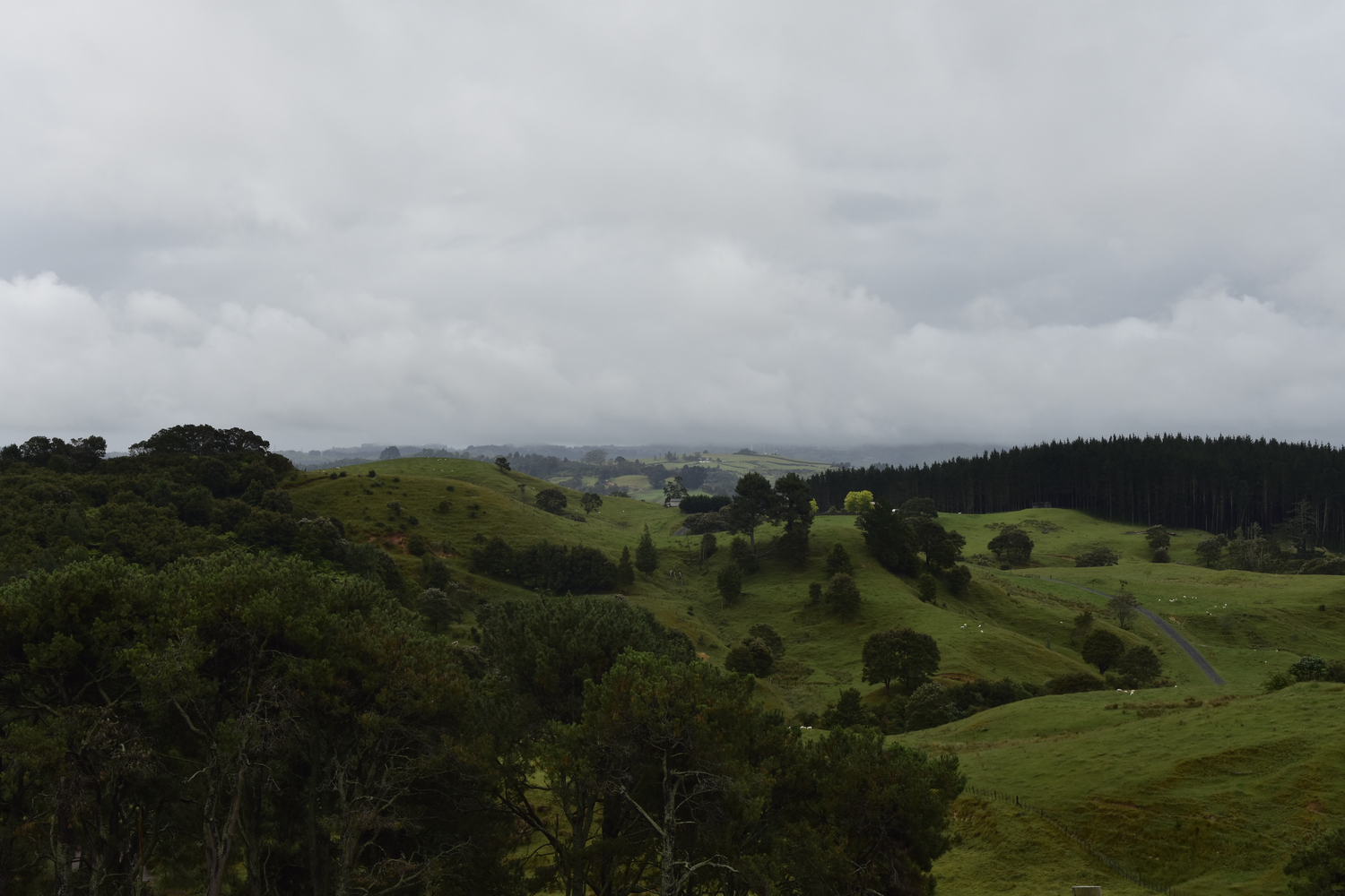 Det var rigtig rart at komme ud af byen. Stedet var tilknyttet en gård (New Zealand er mere eller mindre én stor gård) og havde hverken internet eller elektricitet, hvilket var et skønt afbræk fra Auckland. Landskabet lignede noget, som kunne være taget ud af hobbitten, med grønne, rullende bakker og får på bakkeskråningerne. Efter vi havde båret vores grej ned til teltet blev vi dog ramt af et eftermiddagsregnvejr, der varede helt til klokken 18 – men så fik vi også slappet af 😊 Vi havde håbet på at gå en tur på ejernes land, men det blev ikke til andet end en kort tur ud og se på deres køer efter regnen holdt op for alt var blevet så mudret efter de mange timers piskende regn.