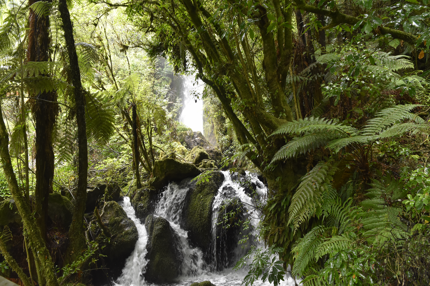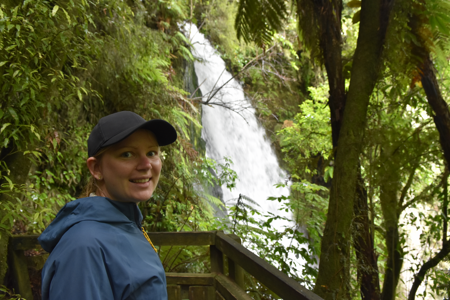Næste morgen kørte vi ud til en gammel landsby – et sted kaldet ”Buried Village of Te Wairoa”. Det er et ret interessant sted, for det husede i slutningen af 1800-tallet en landsby, der blev udryddet af vulkanudbruddet fra Mt. Tarawera i 1886 og blev først udgravet i 1930’erne. Byen var bosat af en del maori (de indfødte) og af nogle europæiske nybyggere, som havde anlagt et kurbad og hotel i byen. I samarbejde med maorierne fragtede de gæster fra hotellet ud til the pink and white terraces, hvor de kunne dase i de dejligste bade opvarmet af geotermiske kilder. Badene bestod af en masse små terrasser med små pøle i hver – jo højere op man kom, jo varmere blev det. Terrasserne blev dog ødelagt under vulkanudbruddet og byen blev dækket af flere meters mudder. Fra museet og udgravningen kunne man gå ud og se et lille vandfald, hvilket vi jo naturligvis måtte gøre på trods af at det regnede.